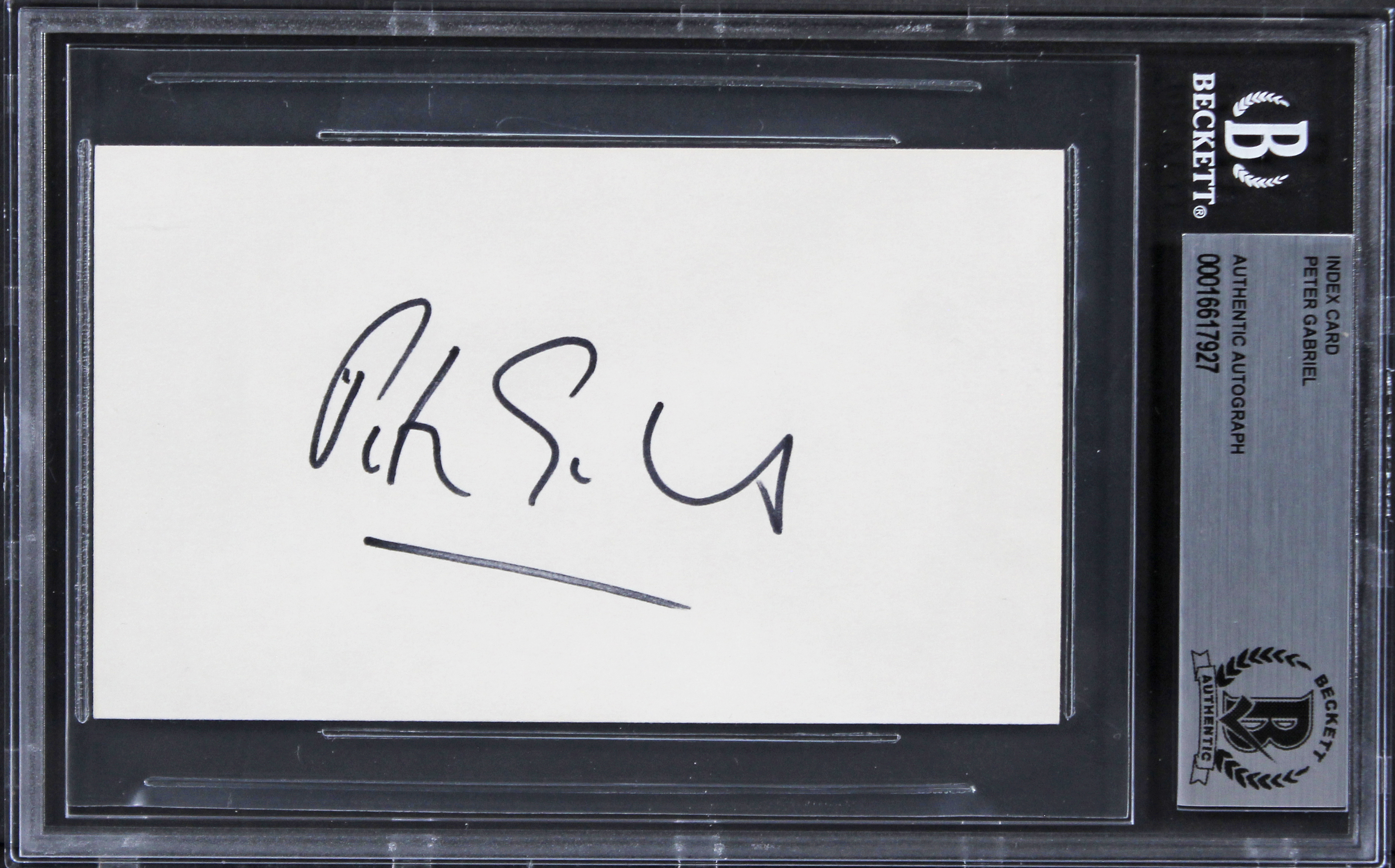 This Autographed 3x5 Index Card has been Personally Signed by Peter Gabriel of Genesis. This item is 100% Authentic, it comes slabbed and authenticated by Beckett Authentication Services. The authenticity can be verified on Beckett Authentication Services website.