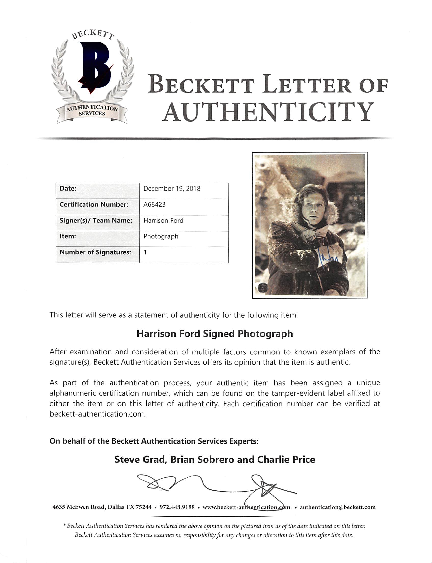 This Autographed Officially Licensed OfficialPix 11x14 Photo has been Personally Signed by Harrison Ford of Star Wars The Empire Strikes Back. This item is 100% Authentic to include a Certificate of Authenticity (COA) / hologram by Beckett Authentication Services. The authenticity can be verified on Beckett Authentication Services website.