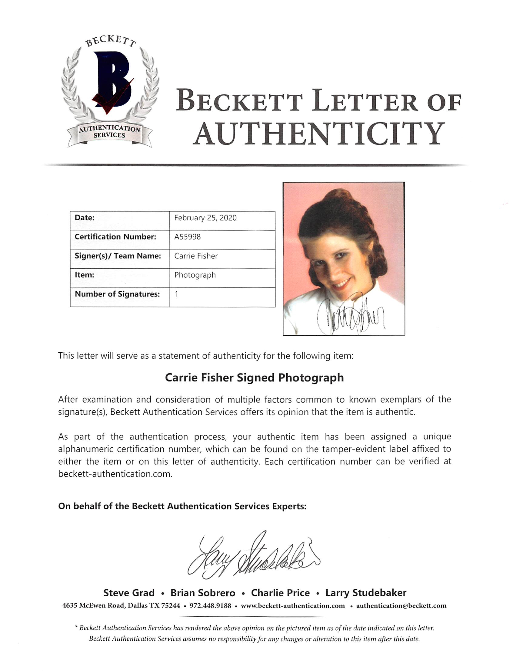 This Autographed 11x14 Photo has been Personally Signed by Carrie Fisher of Star Wars The Empire Strikes Back. This item is 100% Authentic to include a Certificate of Authenticity (COA) / hologram by Beckett Authentication Services. The authenticity can be verified on Beckett Authentication Services website.