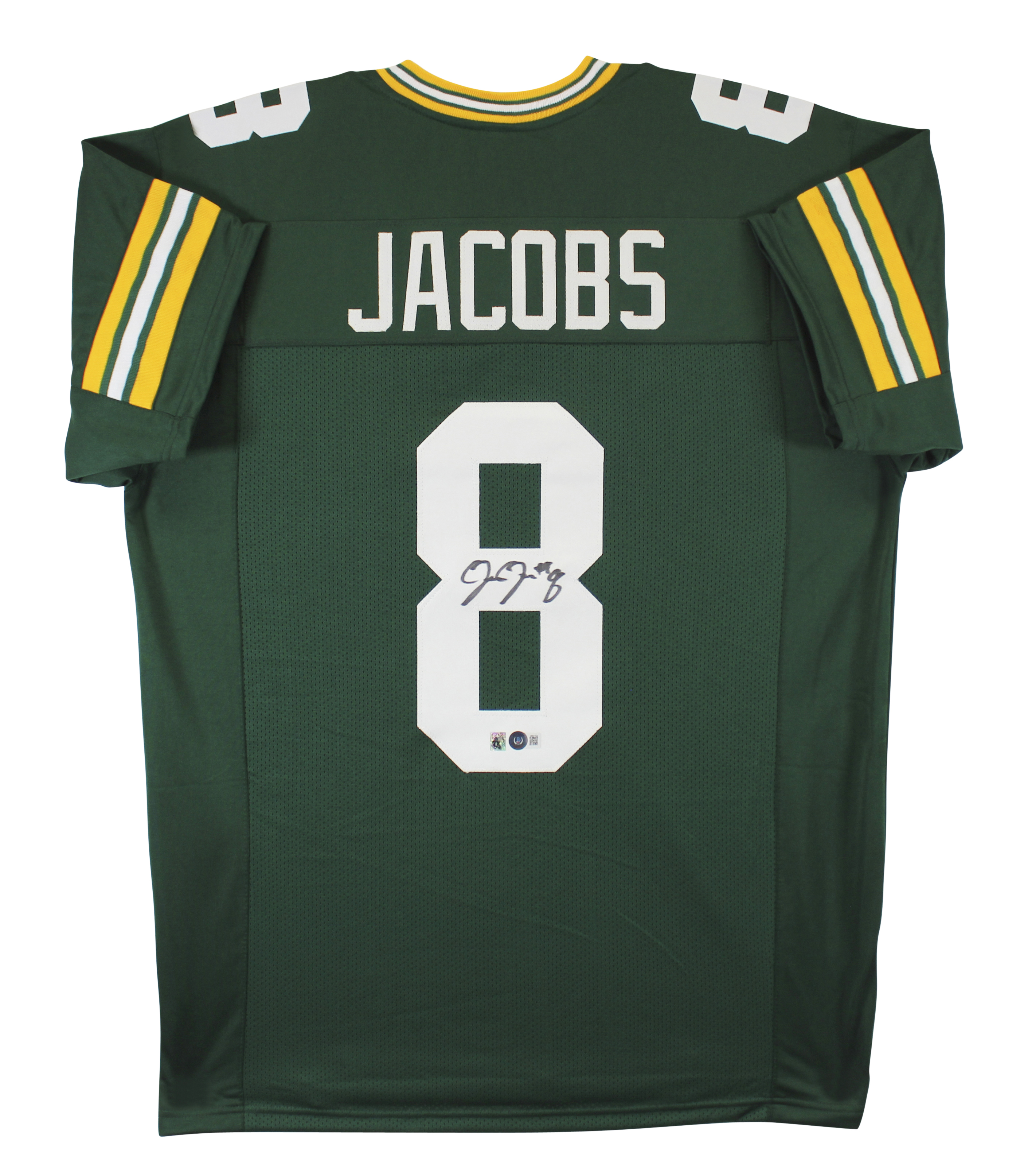 This Autographed Green Pro Style Jersey has been Personally Signed by Josh Jacobs of the Green Bay Packers. This item is 100% Authentic to include a hologram by Beckett Authentication Services. This item will come with an affixed Beckett Authentication Services (BAS) authentication sticker, which includes a scannable QR code to verify authenticity. Please note that Beckett no longer provides serial-numbered COA cards, and the attached BAS sticker will serve as the complete authentication for this item. This is a BAS Witnessed Protection Program item which means a Beckett Authentication Service representative was present when this item was being signed. We conducted an autograph signing with Josh Jacobs where multiples of the same item were signed. While the photographs are representative of this item, the size, placement and strength of the signature may vary. Each item is hand signed, therefore, each autograph is unique. This item can be verified through BAS Witnessed. This is a X-Large sized, non-branded, custom-stitched Jersey.