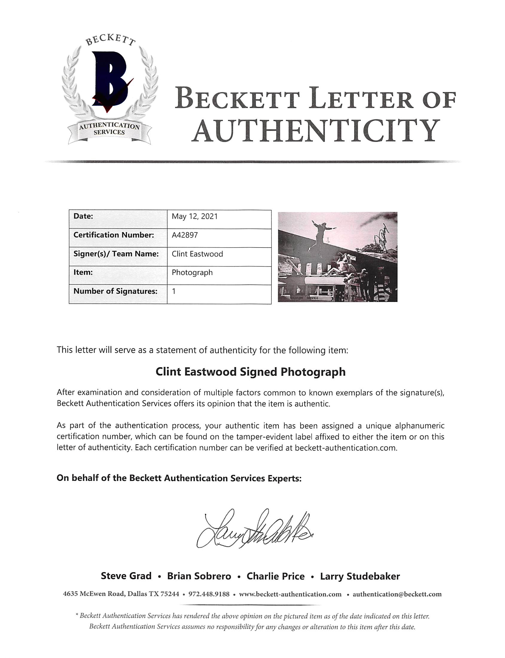 This Autographed Black & White 16x20 Photo has been Personally Signed by Clint Eastwood of Dirty Harry. This item is 100% Authentic to include a Certificate of Authenticity (COA) / hologram by Beckett Authentication Services. The authenticity can be verified on Beckett Authentication Services website.