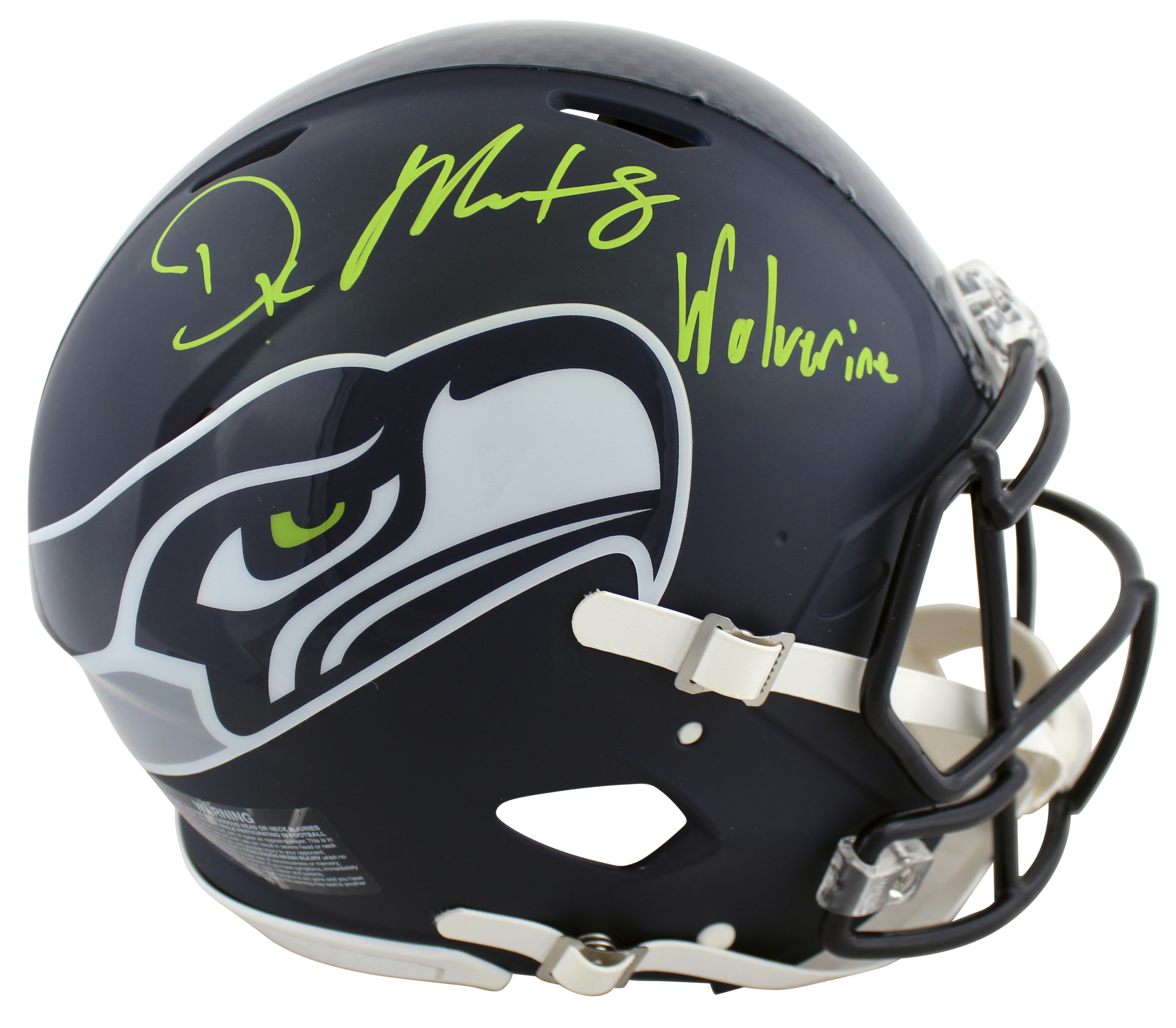 This Autographed Full Size Speed Proline Helmet W/ Uv Mirrored Back Acrylic Display Case with the inscription of "Wolverine" has been Personally Signed by D.K. Metcalf of the Seattle Seahawks. This item is 100% Authentic to include a hologram by Beckett Authentication Services. This item will come with the new Beckett Authentication hologram that has a scannable QR code rather than the traditional COA. If you would like to have a COA, you are welcome to reach out to Beckett for a printed certification once you receive your item. This is a BAS Witnessed Protection Program item which means a Beckett Authentication Service representative was present when this item was being signed. We conducted an autograph signing with D.K. Metcalf where multiples of the same item were signed. While the photographs are representative of this item, the size, placement and strength of the signature may vary. Each item is hand signed, therefore, each autograph is unique. This item can be verified through BAS Witnessed.