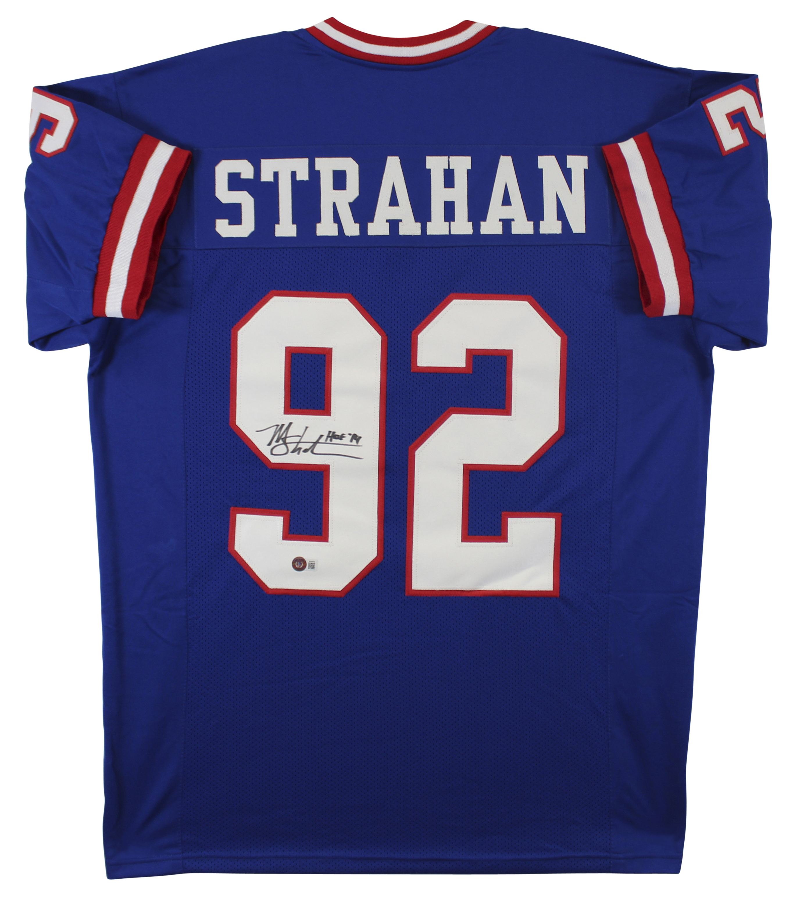 This Autographed w/ Double Layered Number Blue Pro Style Jersey has been Personally Signed by Michael Strahan of the New York Giants. This item is 100% Authentic to include a hologram by Beckett Authentication Services. This item will come with the new Beckett Authentication hologram that has a scannable QR code rather than the traditional COA. If you would like to have a COA, you are welcome to reach out to Beckett for a printed certification once you receive your item. This is a BAS Witnessed Protection Program item which means a Beckett Authentication Service representative was present when this item was being signed. We conducted an autograph signing with Michael Strahan where multiples of the same item were signed. While the photographs are representative of this item, the size, placement and strength of the signature may vary. Each item is hand signed, therefore, each autograph is unique. This item can be verified through BAS Witnessed. This is a X-Large sized, non-branded, custom-stitched Jersey.
