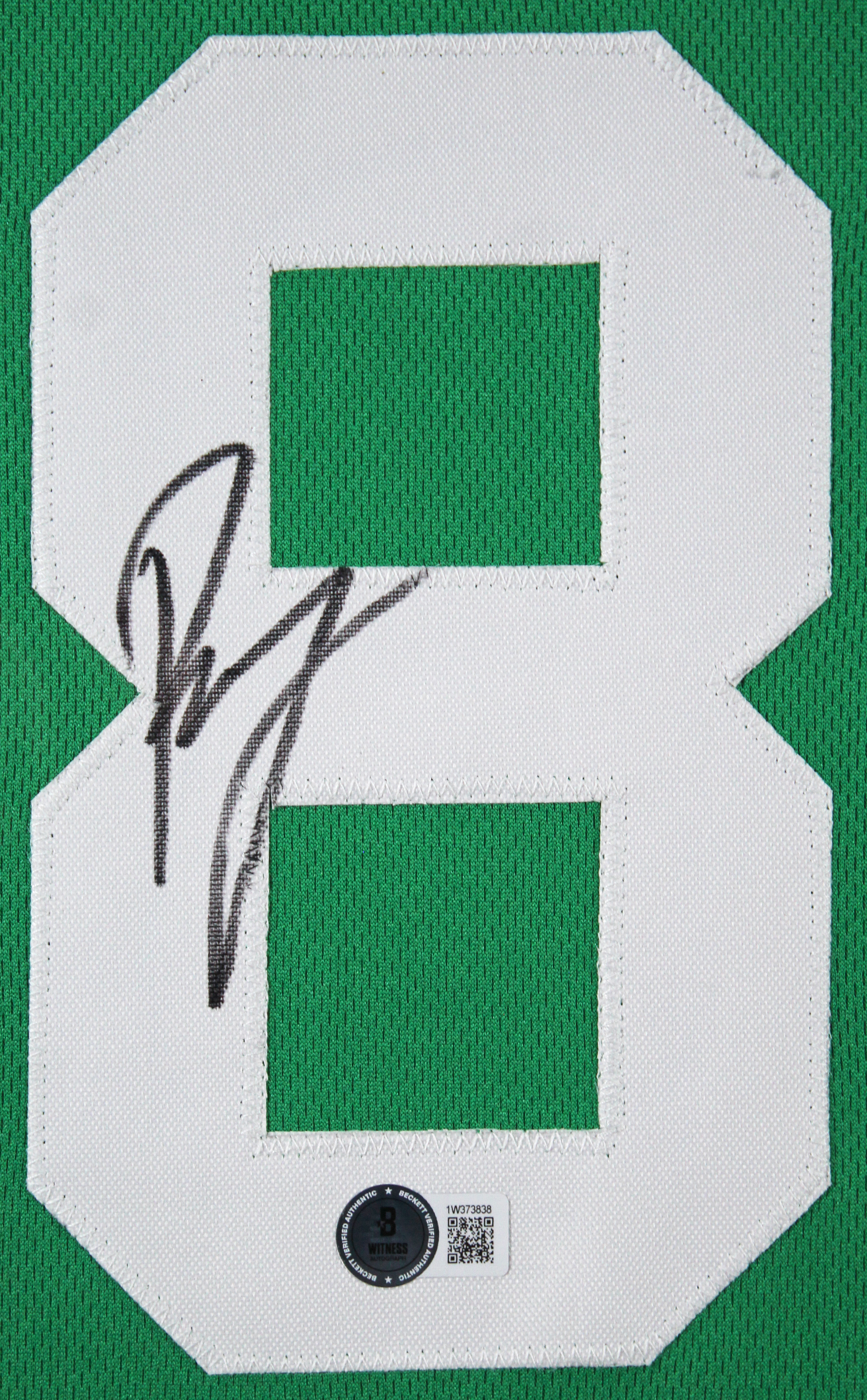 This Autographed Green Pro Style Framed Jersey has been Personally Signed by Kristaps Porzingis of the Boston Celtics. This item is 100% Authentic to include a hologram by Beckett Authentication Services. This item will come with an affixed Beckett Authentication Services (BAS) authentication sticker, which includes a scannable QR code to verify authenticity. Please note that Beckett no longer provides serial-numbered COA cards, and the attached BAS sticker will serve as the complete authentication for this item. This is a BAS Witnessed Protection Program item which means a Beckett Authentication Service representative was present when this item was being signed. We have multiples of this same item. While the photographs are representative of this item, the size, placement and strength of the signature may vary. Each item is hand signed, therefore, each autograph is unique. This item has been professionally framed to overall dimensions of approximately 32 x 37 inches. This is a X-Large sized, non-branded, custom-stitched Framed Jersey. This jersey will be framed to order, it will take 3-4 days from purchase date for it to ship.