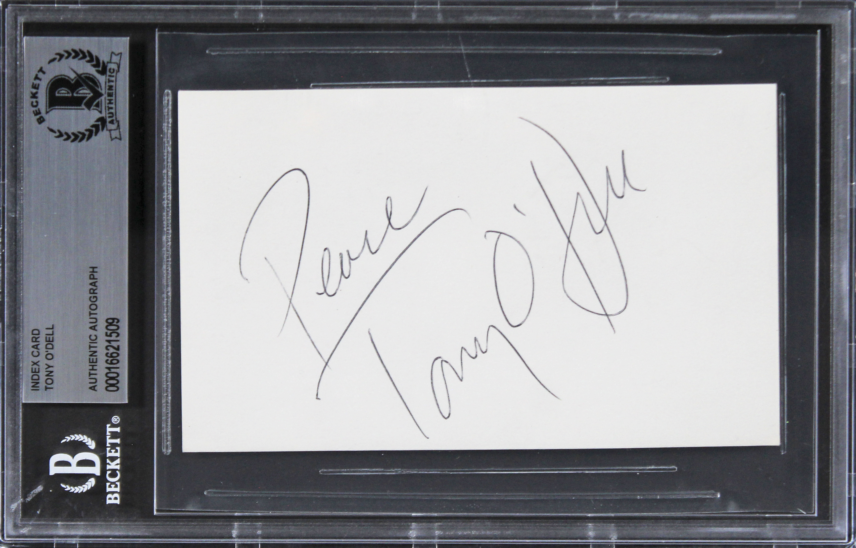 This Autographed 3x5 Index Card with the inscription of "Peace" has been Personally Signed by Tony O'Dell of The Karate Kid. This item is 100% Authentic, it comes slabbed and authenticated by Beckett Authentication Services. The authenticity can be verified on Beckett Authentication Services website.