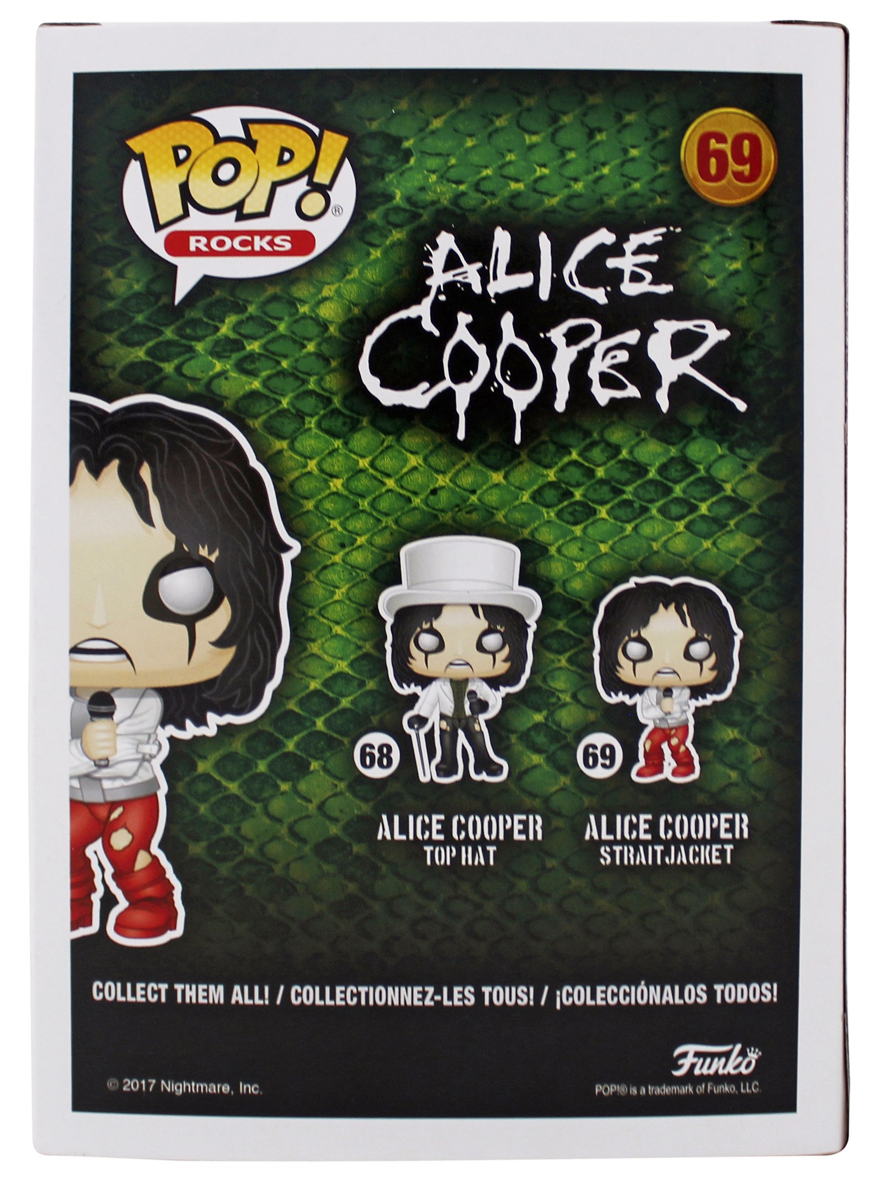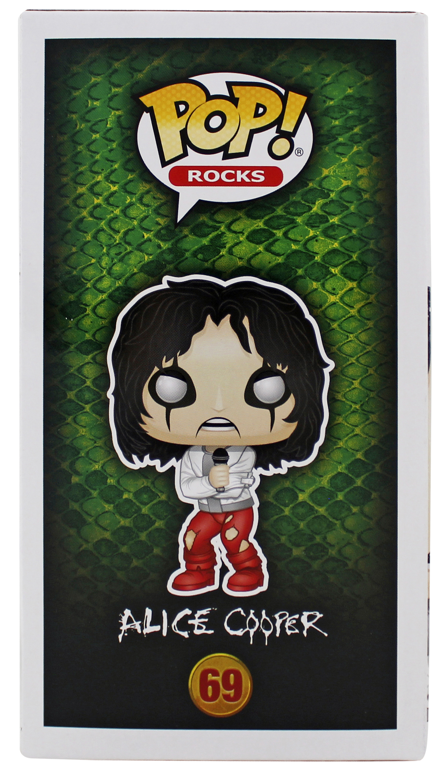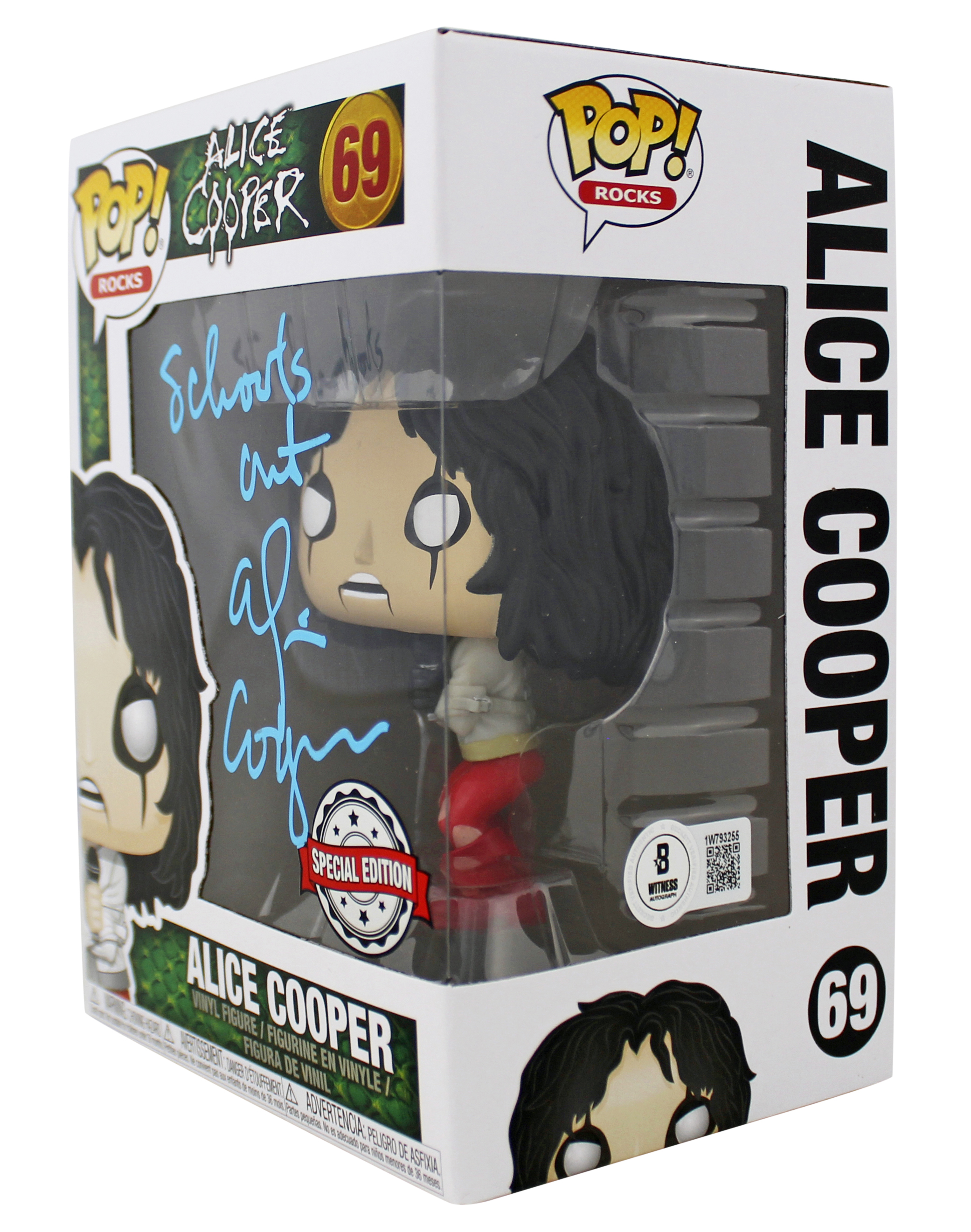 This Autographed #69 w/ Blue Signature Funko Pop Vinyl Figure with the inscription of "Schools Out" has been Personally Signed by Alice Cooper. This item is 100% Authentic to include a hologram by Beckett Authentication Services. This item will come with an affixed Beckett Authentication Services (BAS) authentication sticker, which includes a scannable QR code to verify authenticity. Please note that Beckett no longer provides serial-numbered COA cards, and the attached BAS sticker will serve as the complete authentication for this item. This is a BAS Witnessed Protection Program item which means a Beckett Authentication Service representative was present when this item was being signed. We conducted an autograph signing with Alice Cooper where multiples of the same item were signed. While the photographs are representative of this item, the size, placement and strength of the signature may vary. Each item is hand signed, therefore, each autograph is unique. This item will ship in a Pop! Protector, please refer to the photos for condition of the item prior to purchase, these are in good condition but would not be considered mint.