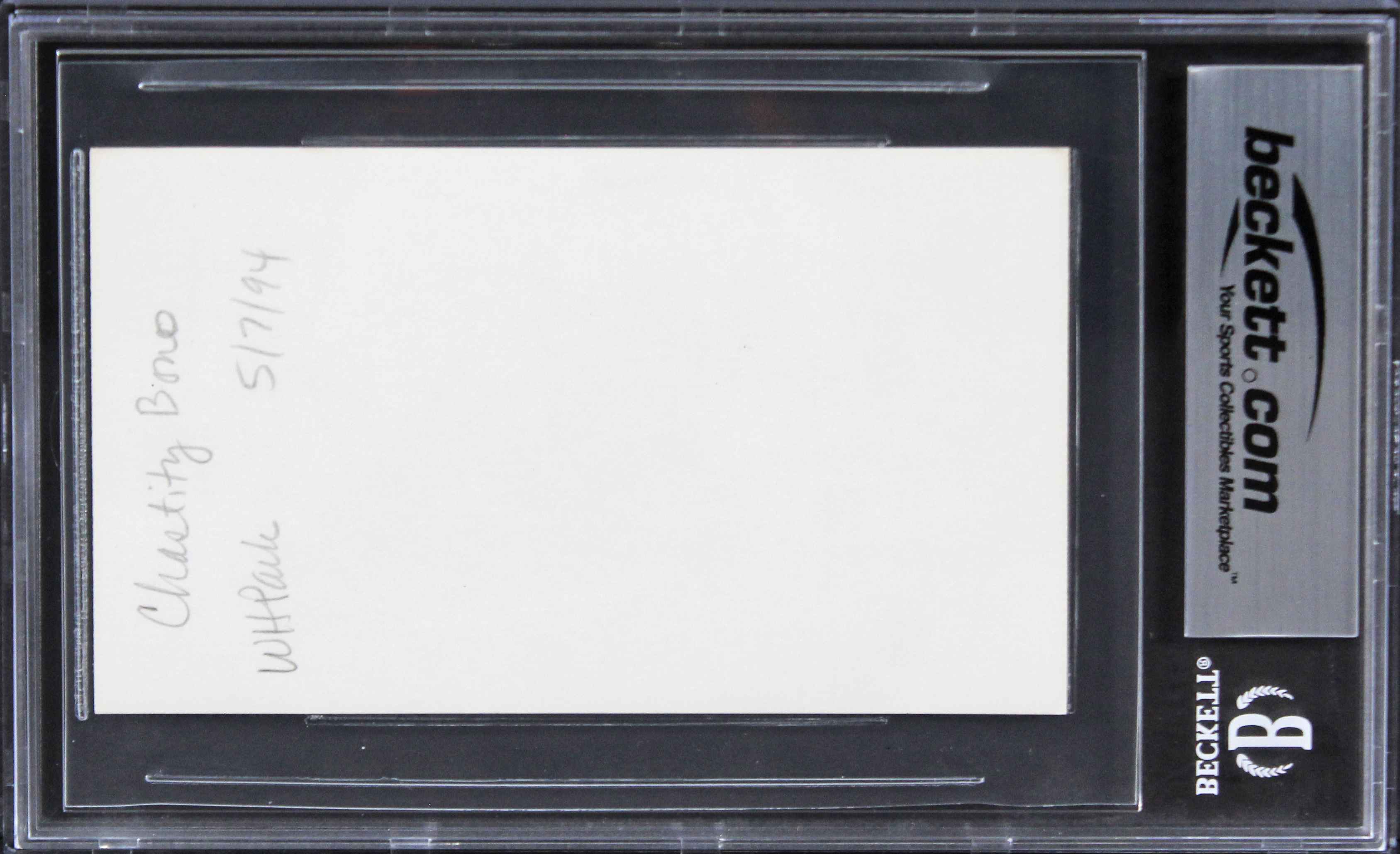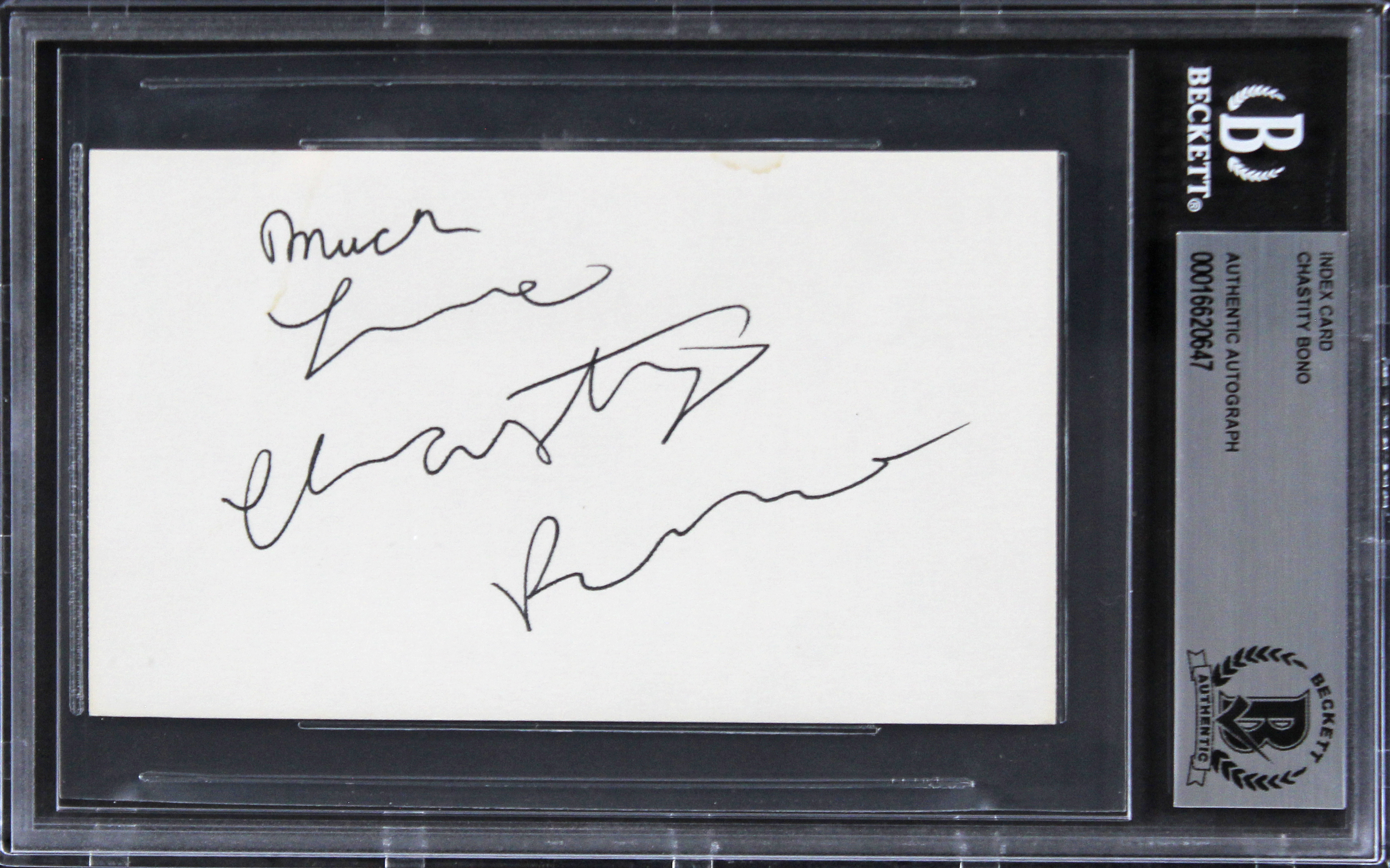 This Autographed 3x5 Index Card with the inscription of "Much Love" has been Personally Signed by Chastity Bono of Becoming Chaz. This item is 100% Authentic, it comes slabbed and authenticated by Beckett Authentication Services. The authenticity can be verified on Beckett Authentication Services website.
