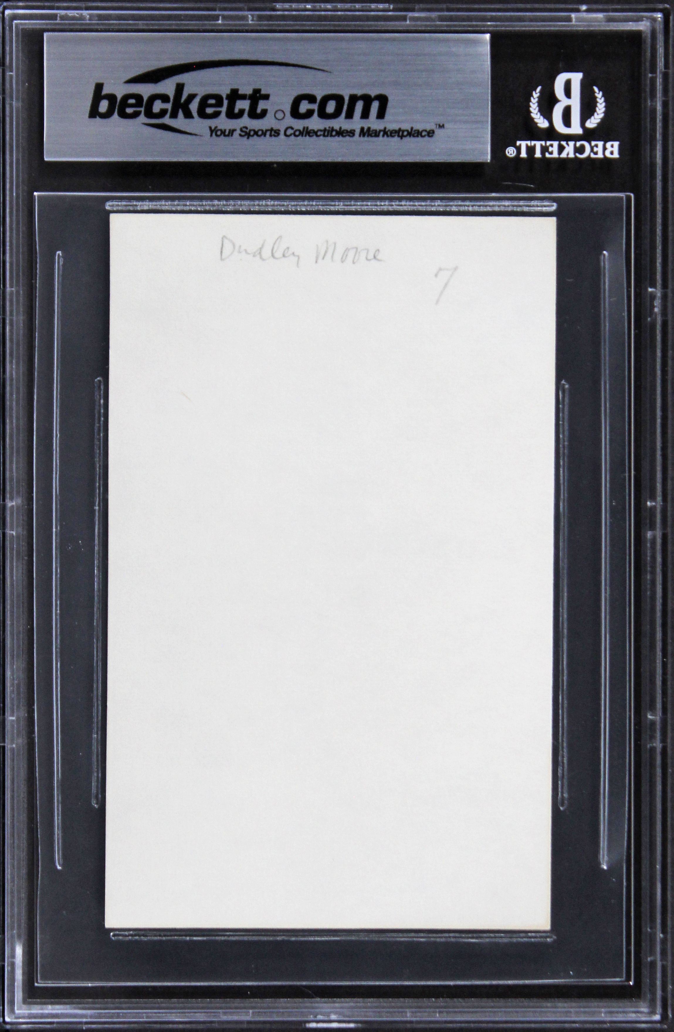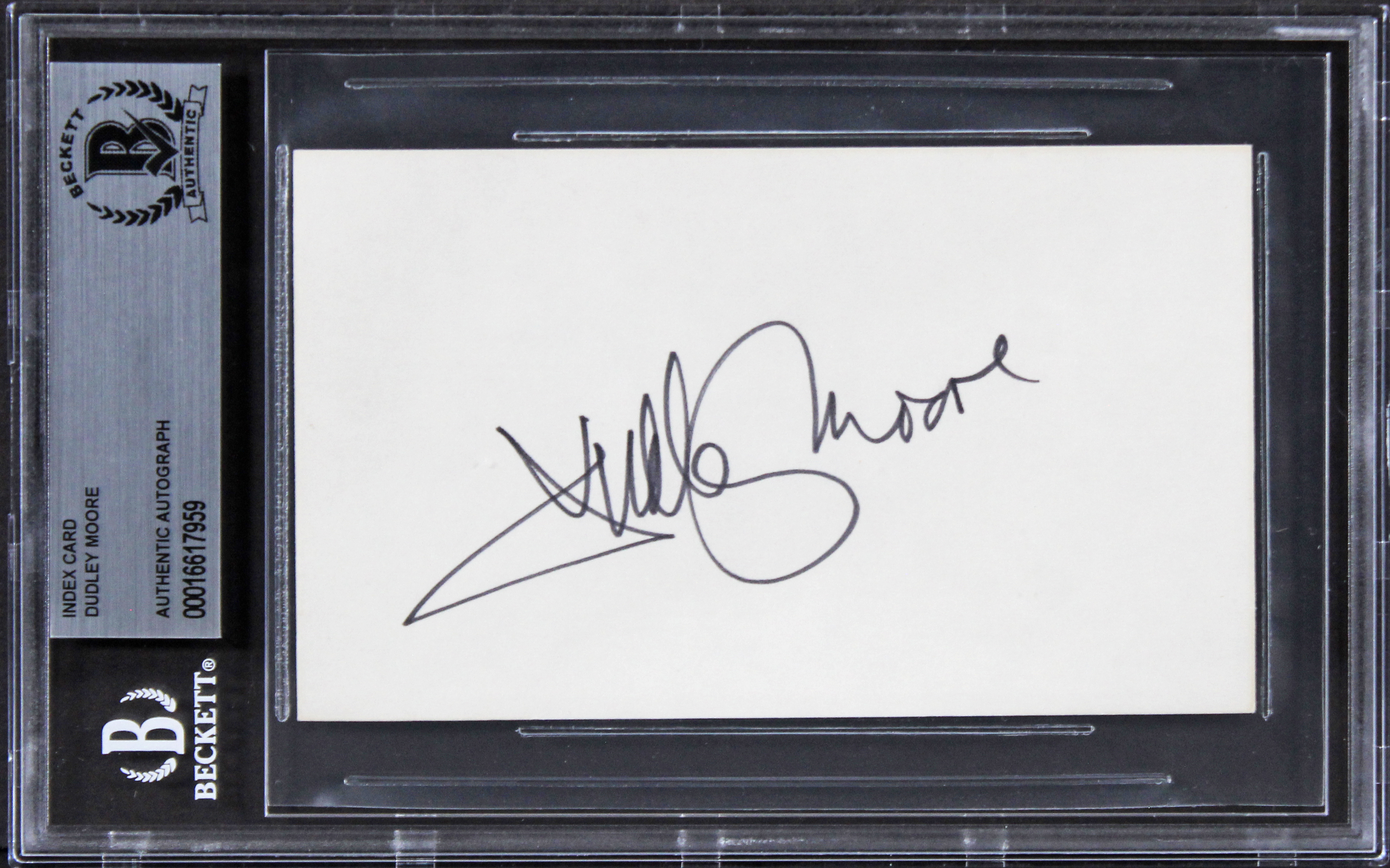 This Autographed 3x5 Index Card has been Personally Signed by Dudley Moore of Arthur. This item is 100% Authentic, it comes slabbed and authenticated by Beckett Authentication Services. We have multiples of this same item. While the photographs are representative of this item, the size, placement and strength of the signature may vary. Each item is hand signed, therefore, each autograph is unique.