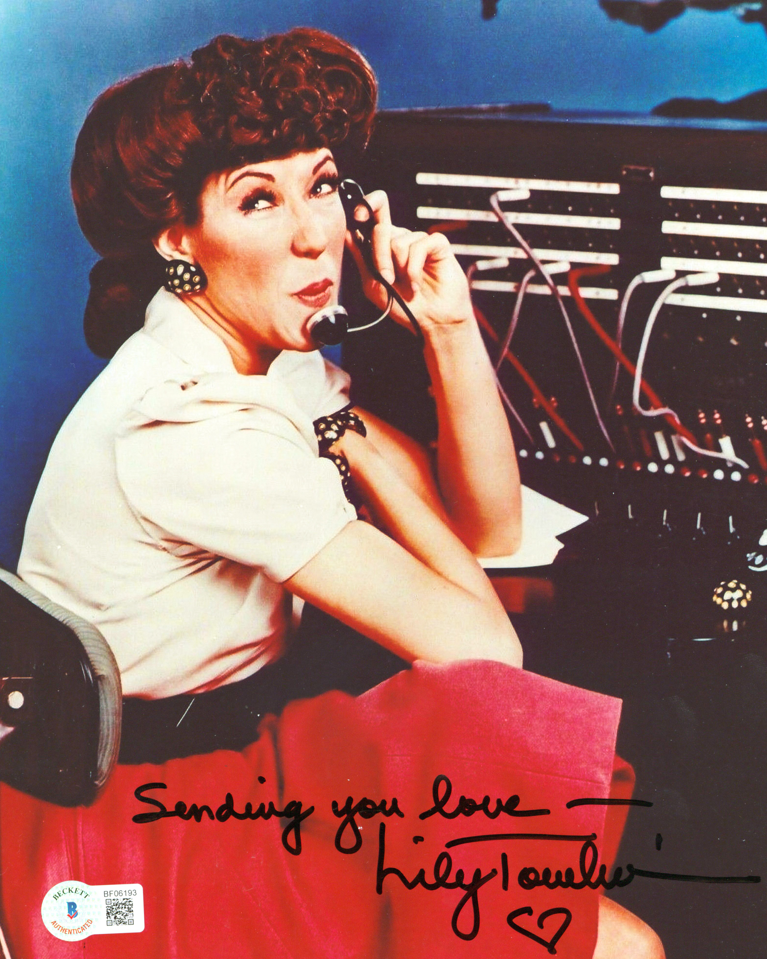 This Autographed 8x10 Photo with the inscription of "Sending you love" has been Personally Signed by Lily Tomlin of Rowan & Martin's Laugh-In. This item is 100% Authentic to include a hologram by Beckett Authentication Services. This item will come with an affixed Beckett Authentication Services (BAS) authentication sticker, which includes a scannable QR code to verify authenticity. Please note that Beckett no longer provides serial-numbered COA cards, and the attached BAS sticker will serve as the complete authentication for this item. The authenticity can be verified on Beckett Authentication Services website.