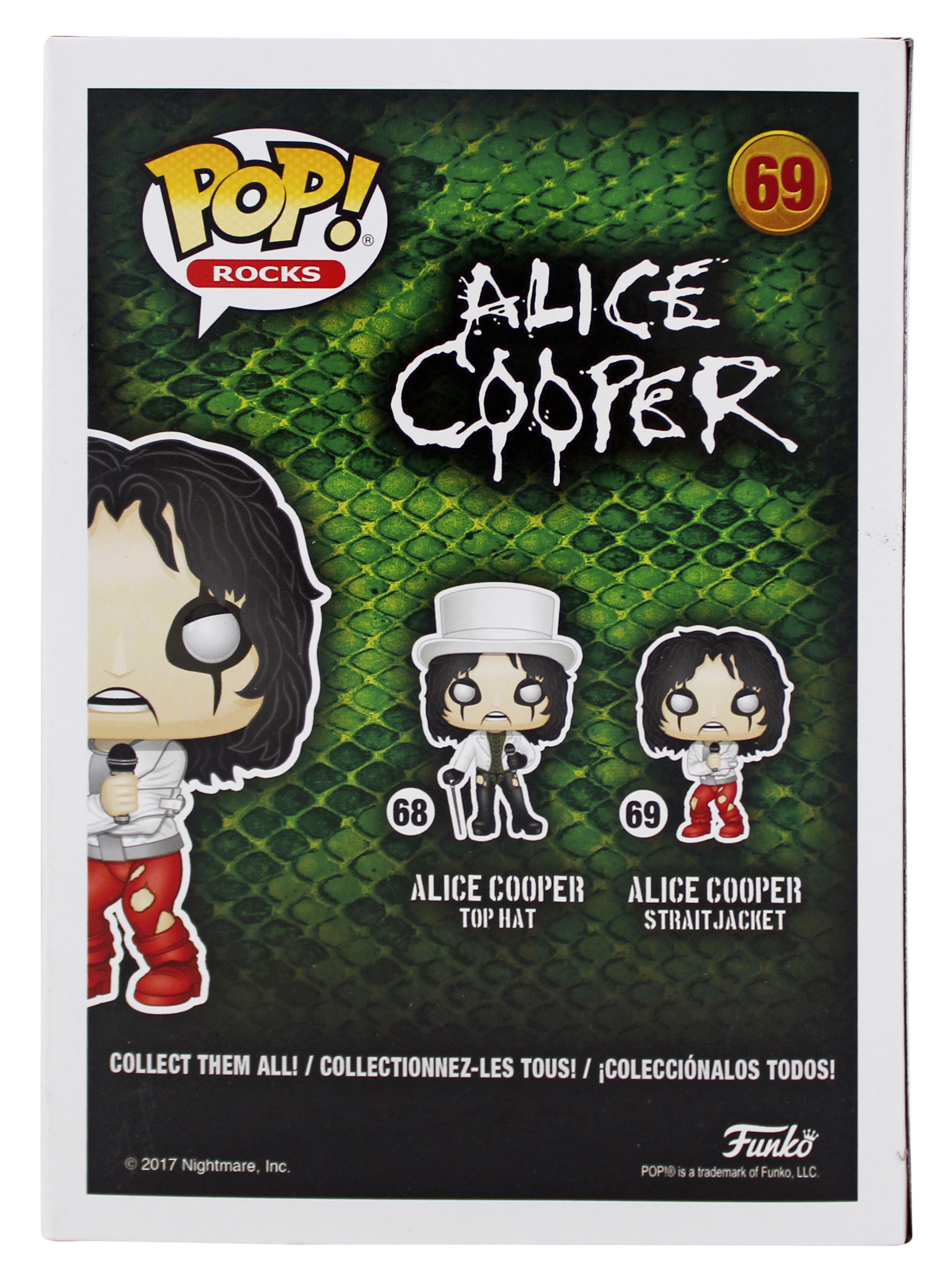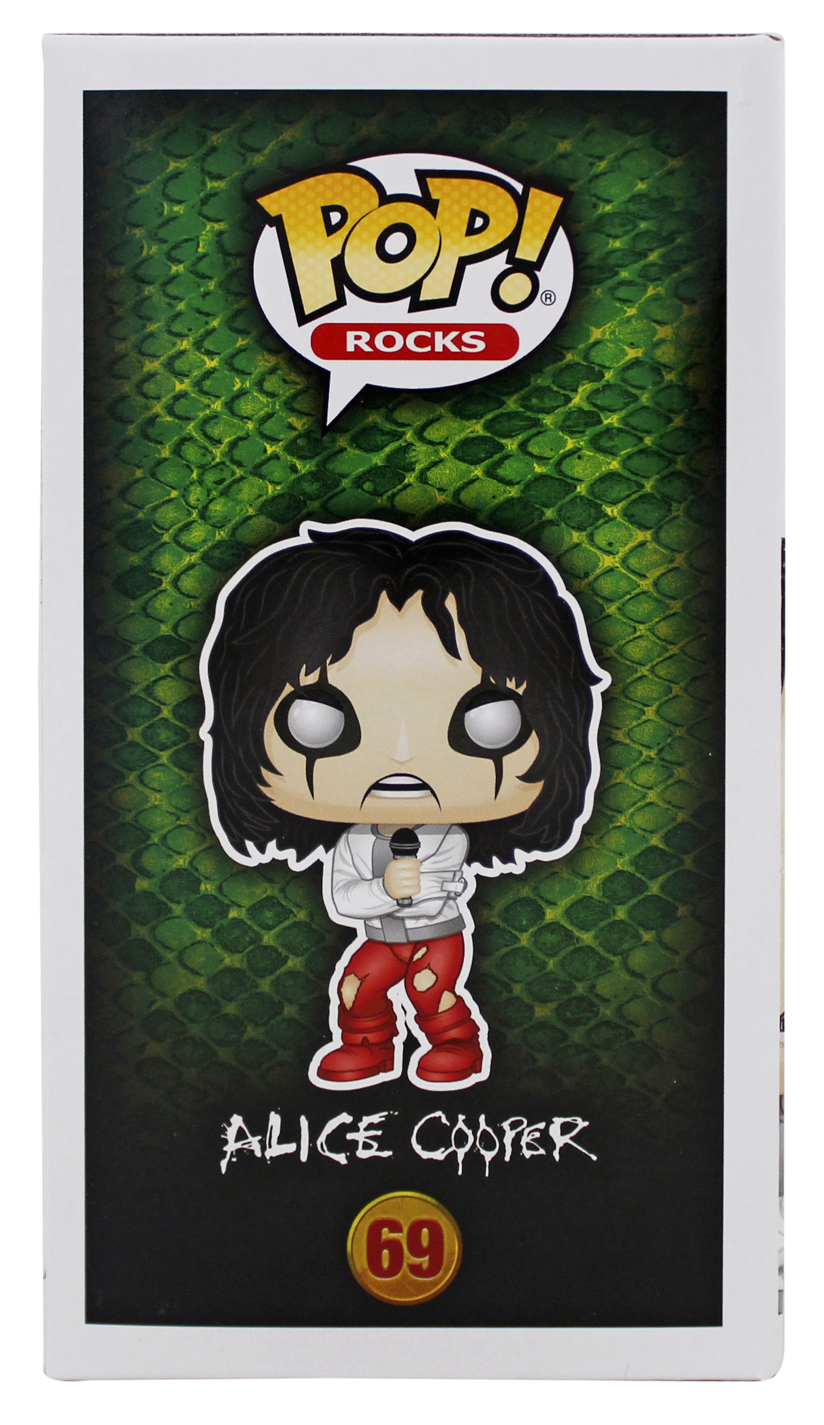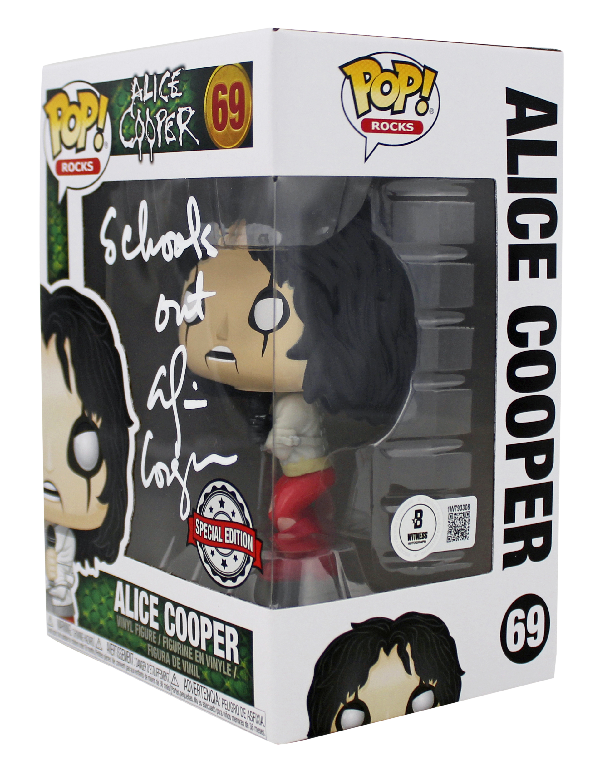 This Autographed #69 w/ White Signature Funko Pop Vinyl Figure with the inscription of "Schools Out" has been Personally Signed by Alice Cooper. This item is 100% Authentic to include a hologram by Beckett Authentication Services. This item will come with an affixed Beckett Authentication Services (BAS) authentication sticker, which includes a scannable QR code to verify authenticity. Please note that Beckett no longer provides serial-numbered COA cards, and the attached BAS sticker will serve as the complete authentication for this item. This is a BAS Witnessed Protection Program item which means a Beckett Authentication Service representative was present when this item was being signed. We conducted an autograph signing with Alice Cooper where multiples of the same item were signed. While the photographs are representative of this item, the size, placement and strength of the signature may vary. Each item is hand signed, therefore, each autograph is unique. This item will ship in a Pop! Protector, please refer to the photos for condition of the item prior to purchase, these are in good condition but would not be considered mint.