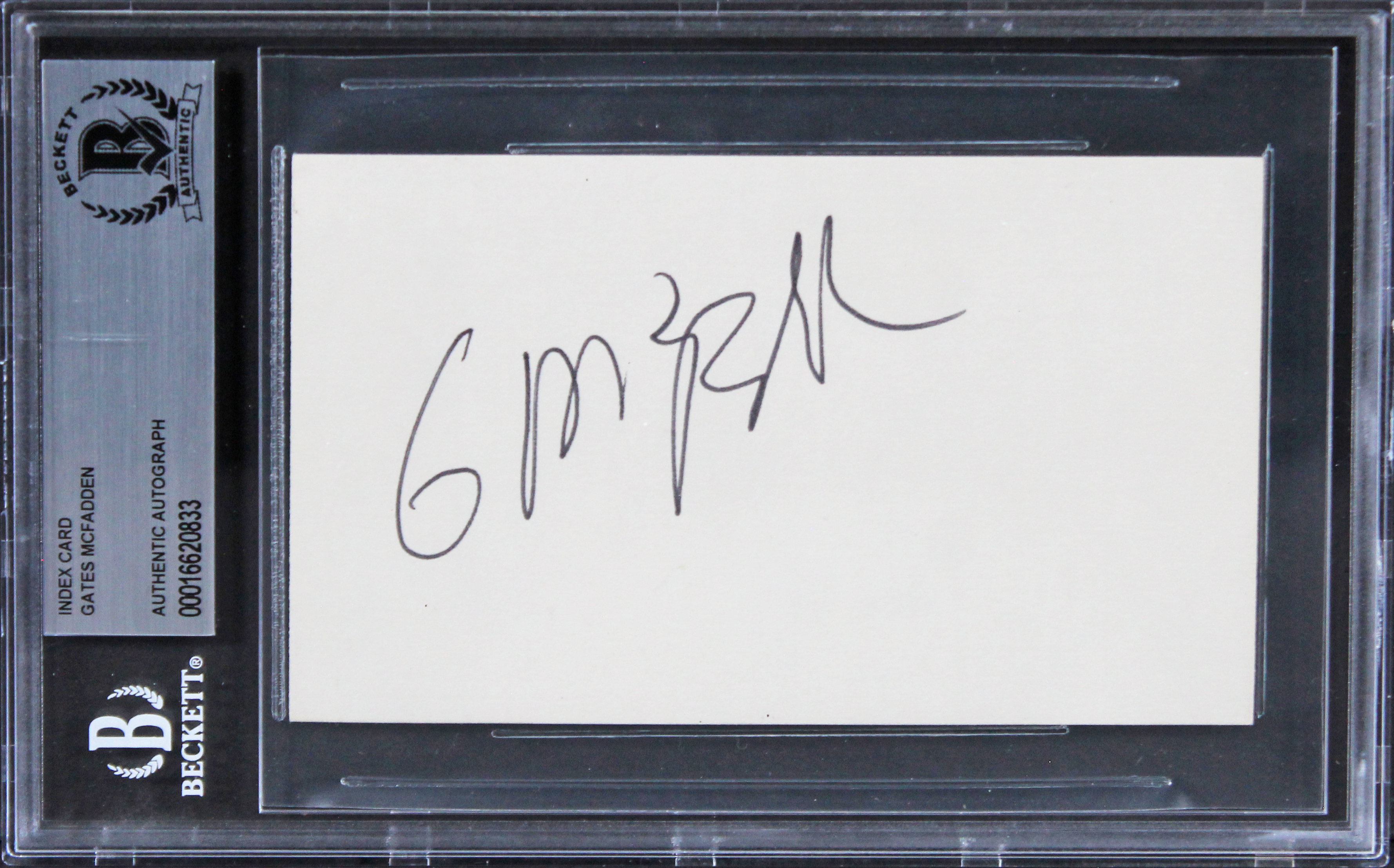 This Autographed 3x5 Index Card has been Personally Signed by Gates McFadden of Star Trek Picard. This item is 100% Authentic, it comes slabbed and authenticated by Beckett Authentication Services. The authenticity can be verified on Beckett Authentication Services website.