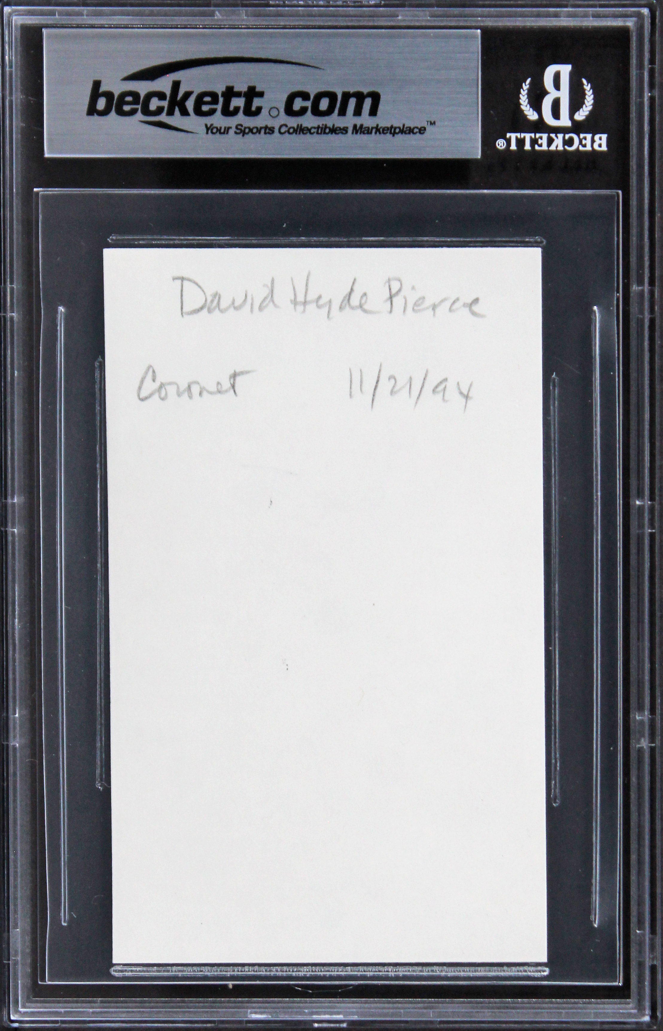 This Autographed w/ Black Signature 3x5 Index Card has been Personally Signed by David Hyde Pierce of Frasier. This item is 100% Authentic, it comes slabbed and authenticated by Beckett Authentication Services. We have multiples of this same item. While the photographs are representative of this item, the size, placement and strength of the signature may vary. Each item is hand signed, therefore, each autograph is unique.