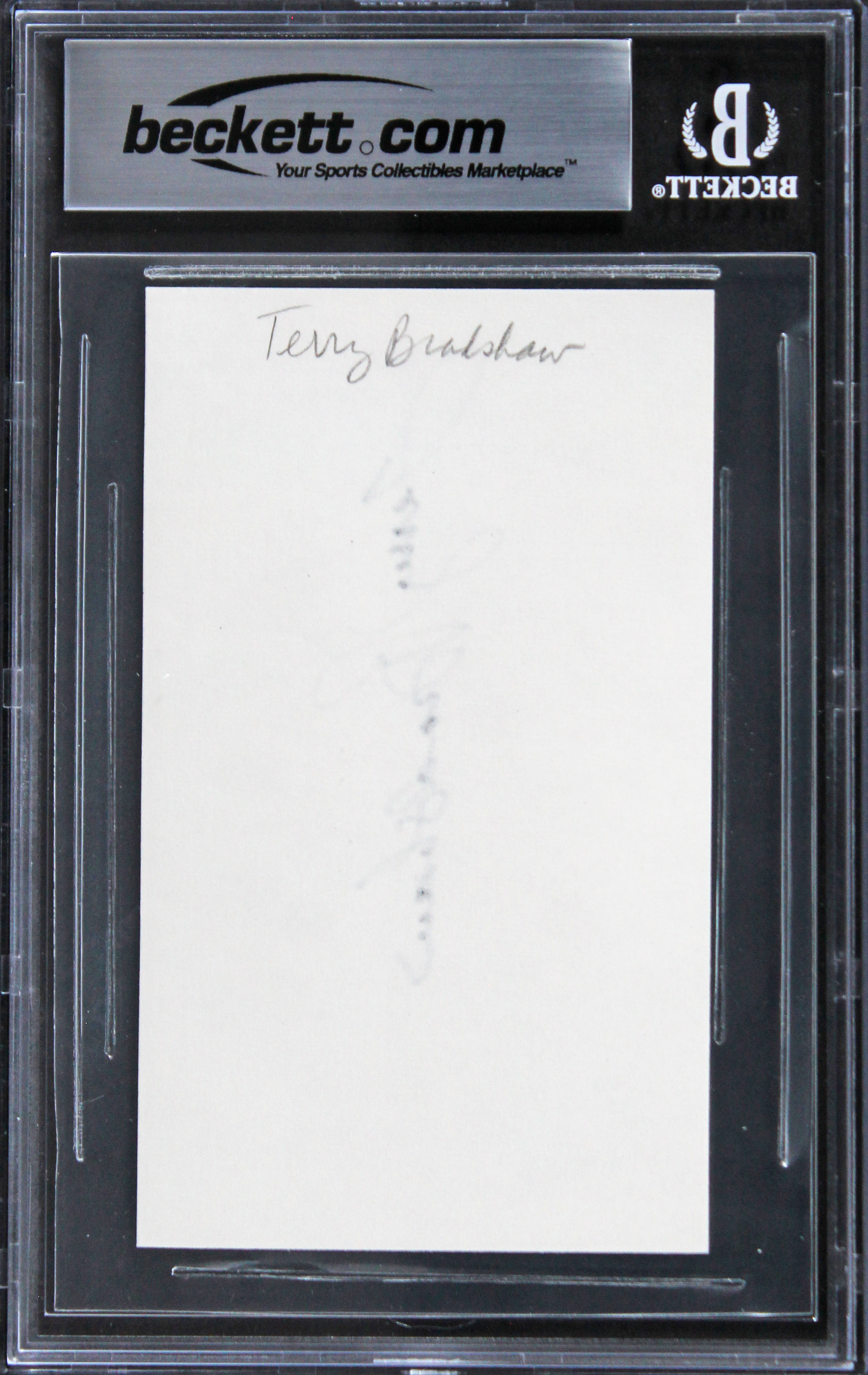This Autographed 3x5 Index Card has been Personally Signed by Terry Bradshaw of the Pittsburgh Steelers. This item is 100% Authentic, it comes slabbed and authenticated by Beckett Authentication Services. The authenticity can be verified on Beckett Authentication Services website.