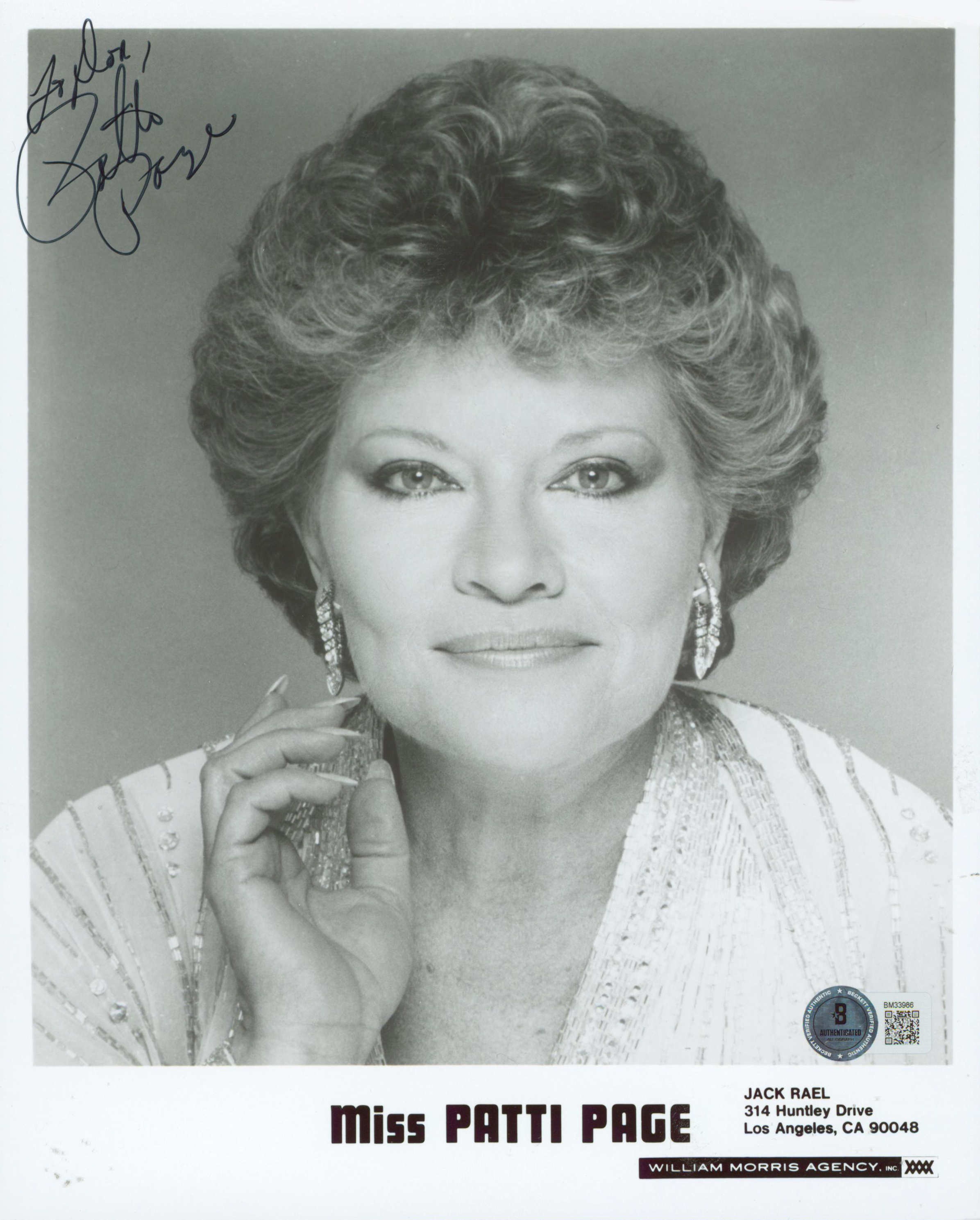 This Autographed 8x10 Photo has been Personally Signed by Patti Page of Singer. This item is 100% Authentic to include a hologram by Beckett Authentication Services. This item will come with an affixed Beckett Authentication Services (BAS) authentication sticker, which includes a scannable QR code to verify authenticity. Please note that Beckett no longer provides serial-numbered COA cards, and the attached BAS sticker will serve as the complete authentication for this item. The authenticity can be verified on Beckett Authentication Services website.