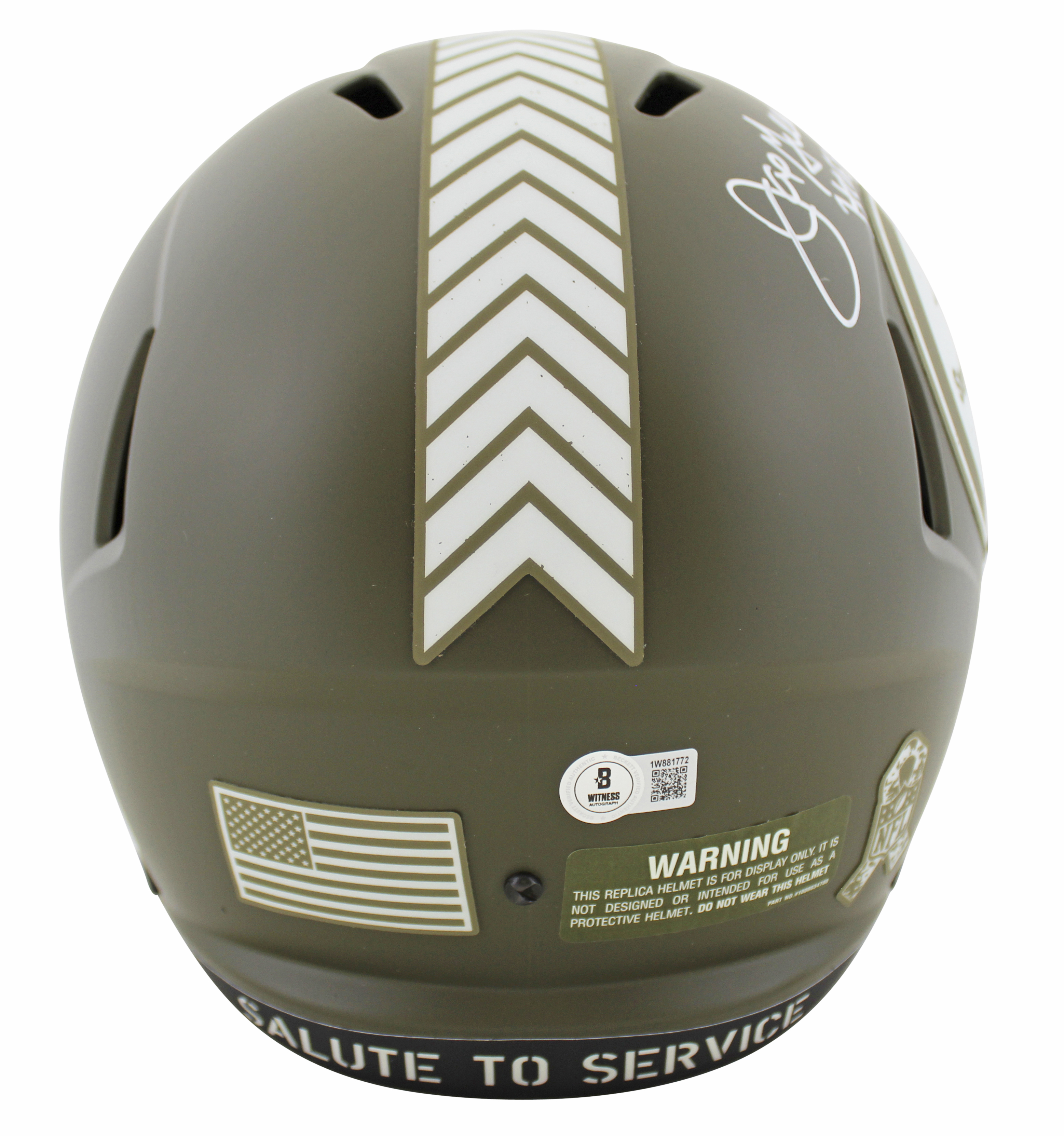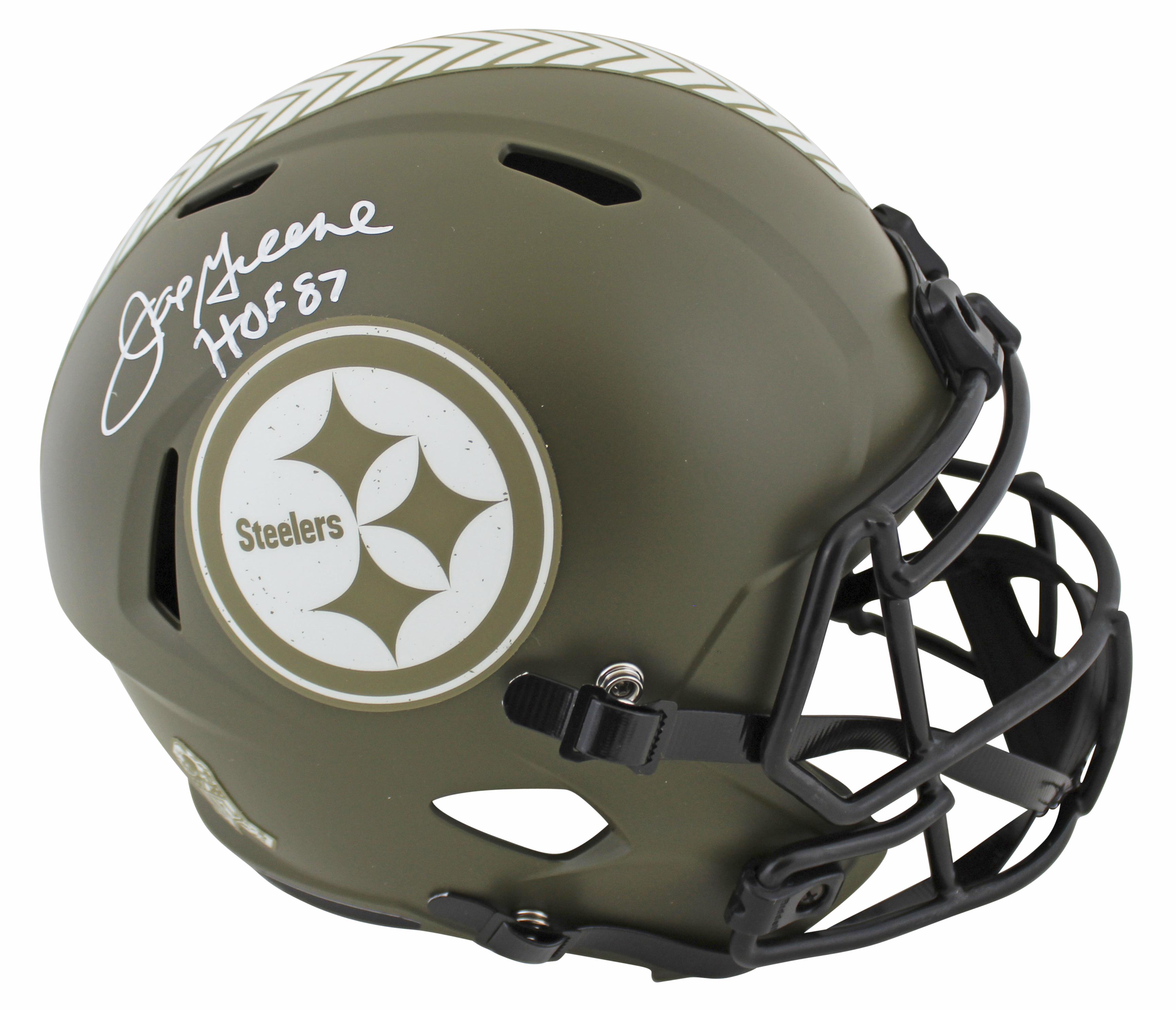 This Autographed Alternate Salute To Service Riddell Full Size Speed Rep Helmet W/ Uv Mirrored Back Acrylic Display Case with the inscription of "HOF 87" has been Personally Signed by Joe Greene of the Pittsburgh Steelers. This item is 100% Authentic to include a hologram by Beckett Authentication Services. This item will come with an affixed Beckett Authentication Services (BAS) authentication sticker, which includes a scannable QR code to verify authenticity. Please note that Beckett no longer provides serial-numbered COA cards, and the attached BAS sticker will serve as the complete authentication for this item. This is a BAS Witnessed Protection Program item which means a Beckett Authentication Service representative was present when this item was being signed. We conducted an autograph signing with Joe Greene where multiples of the same item were signed. While the photographs are representative of this item, the size, placement and strength of the signature may vary. Each item is hand signed, therefore, each autograph is unique. This item can be verified through BAS Witnessed.