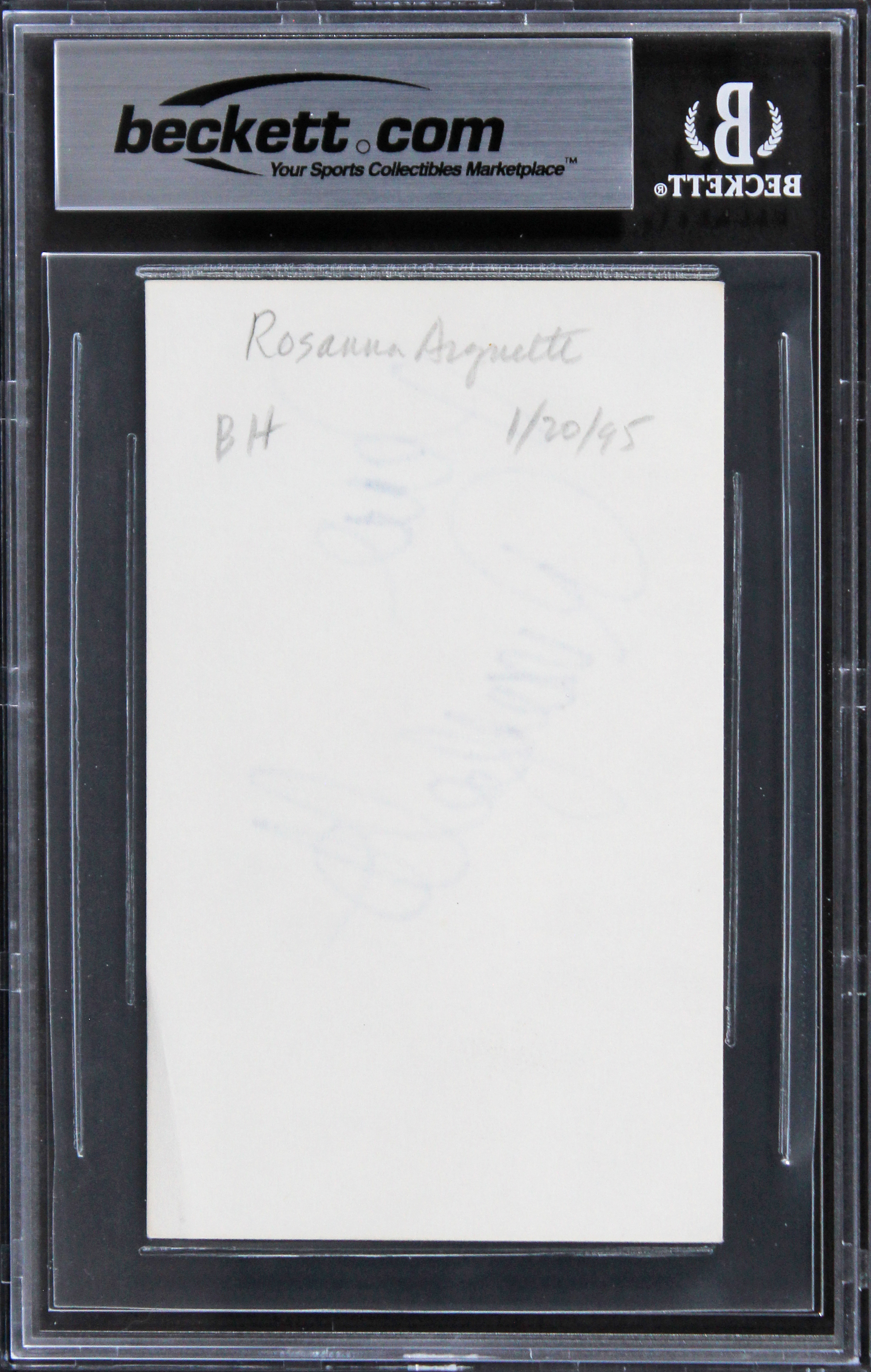 This Autographed 3x5 Index Card has been Personally Signed by Rosanna Arquette of Pulp Fiction. This item is 100% Authentic, it comes slabbed and authenticated by Beckett Authentication Services. The authenticity can be verified on Beckett Authentication Services website.