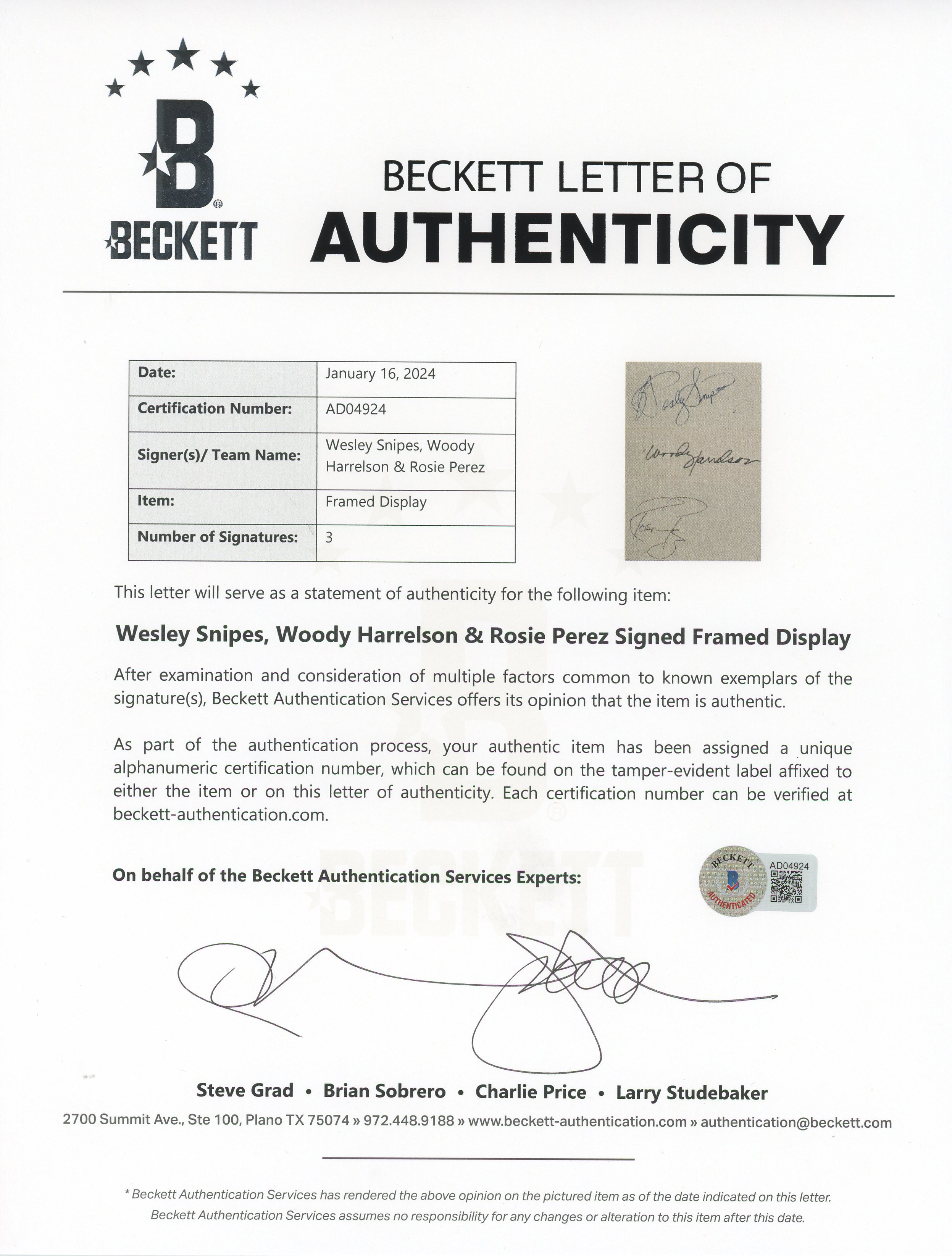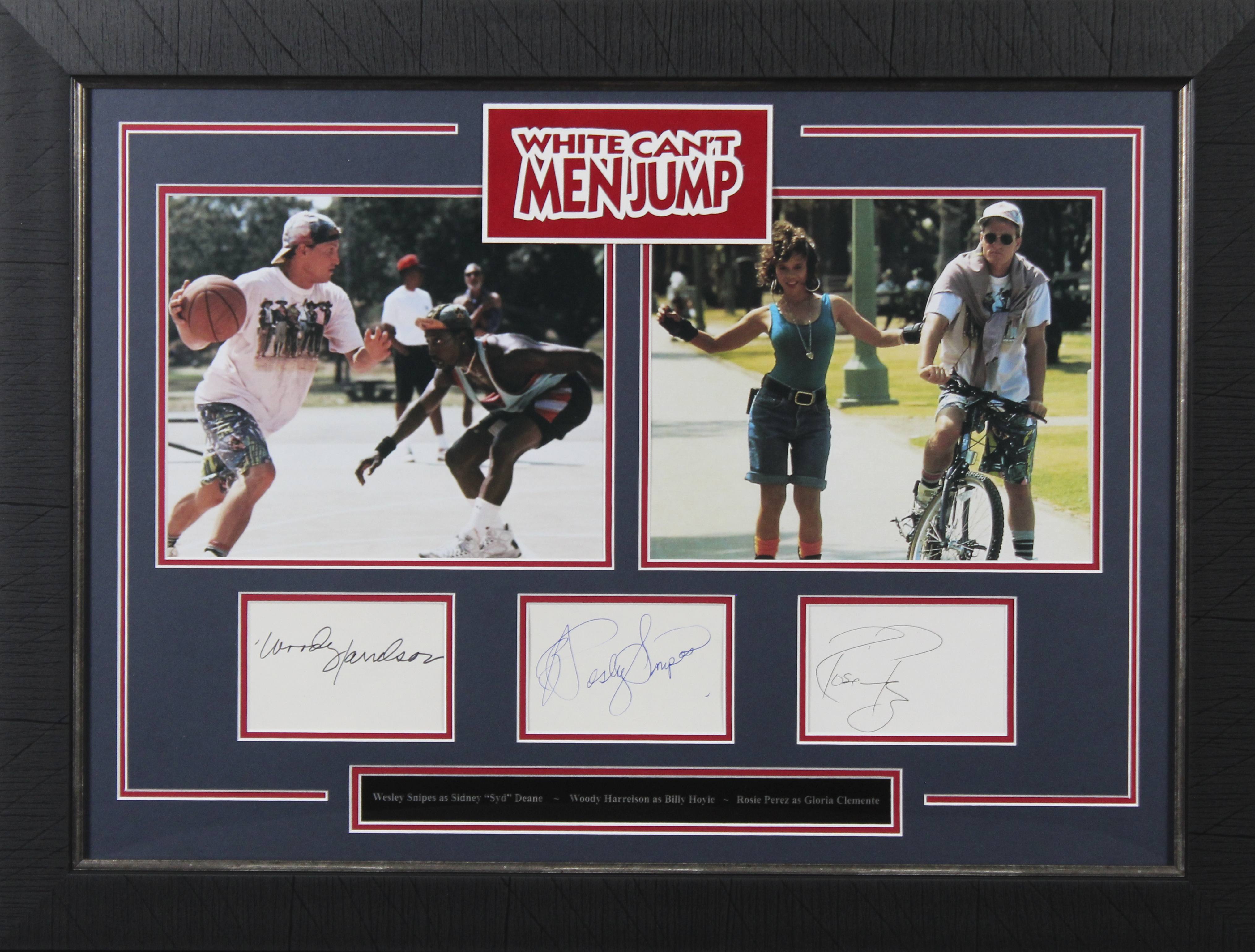 This Autographed 3x5 Index Card Framed Display has been Personally Signed by Wesley Snipes, Woody Harrelson & Rosie Perez of White Men Can't Jump. This item is 100% Authentic to include a Certificate of Authenticity (COA) / hologram by Beckett Authentication Services. The authenticity can be verified on Beckett Authentication Services website. This item has been professionally framed to overall dimensions of approximately 20.5 x 27.5 inches.