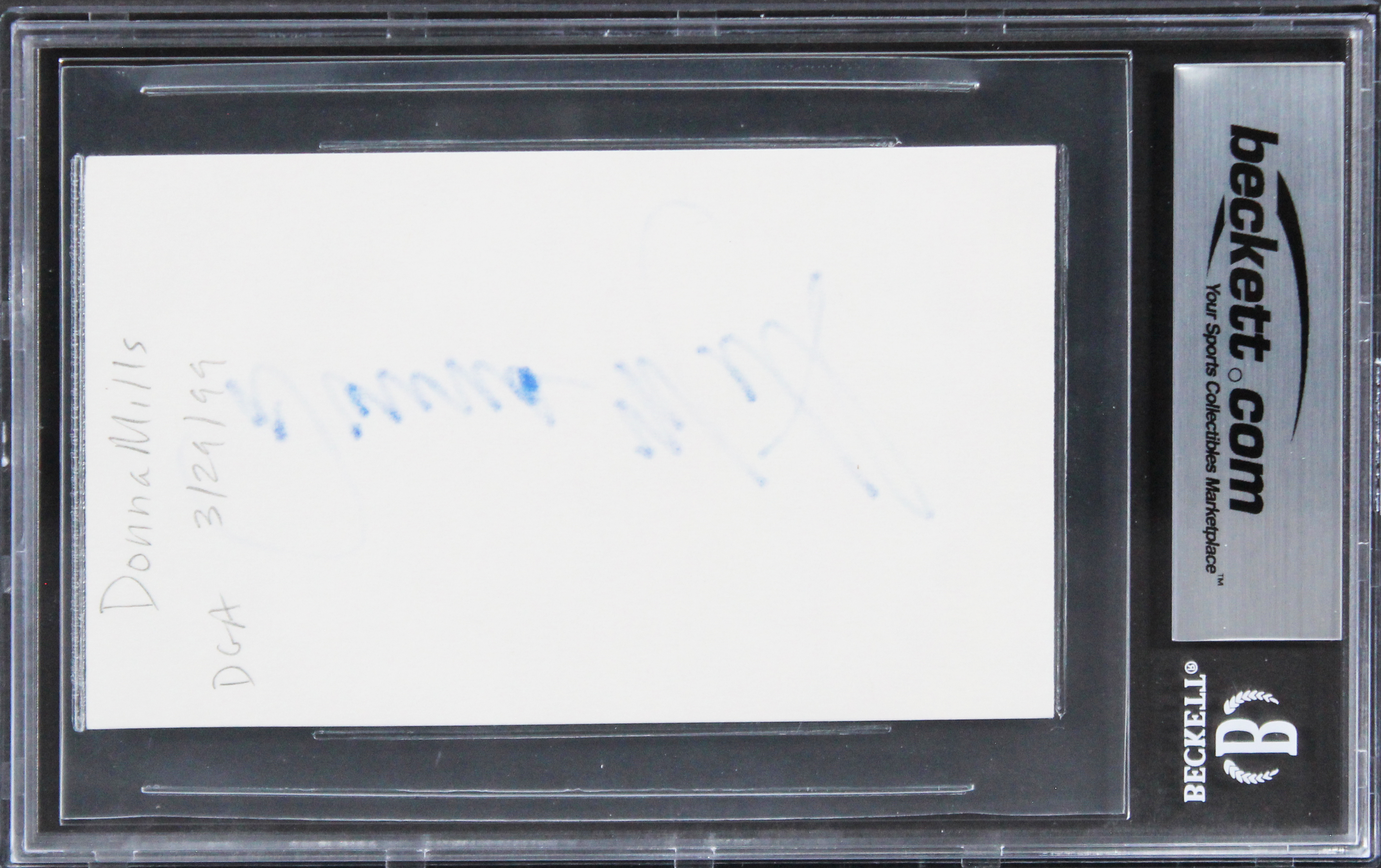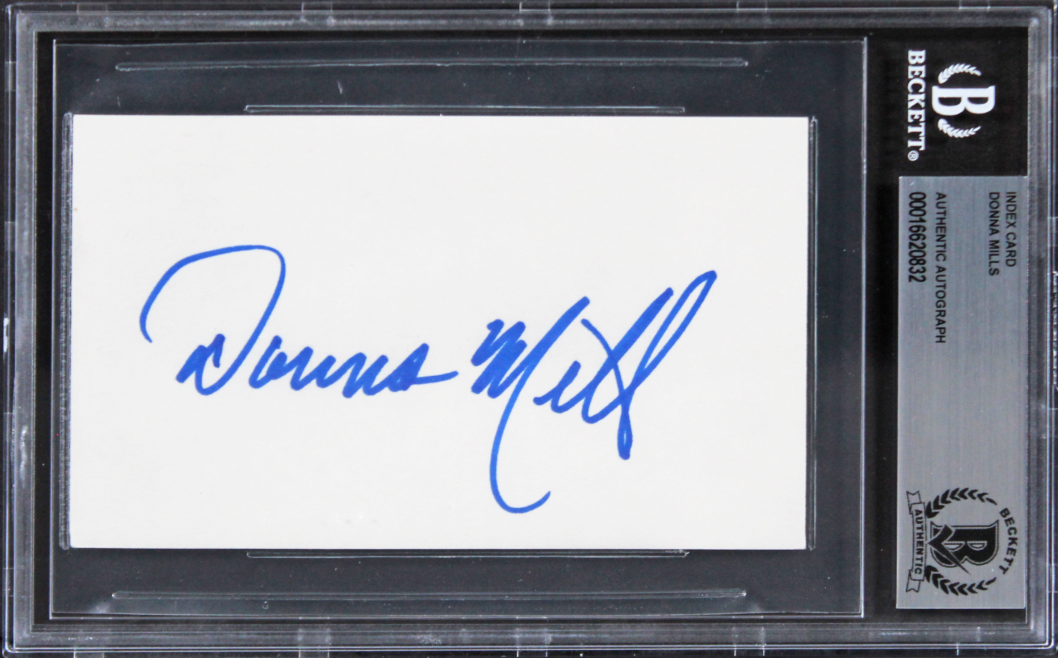 This Autographed 3x5 Index Card has been Personally Signed by Donna Mills of Knots Landing. This item is 100% Authentic, it comes slabbed and authenticated by Beckett Authentication Services. The authenticity can be verified on Beckett Authentication Services website.