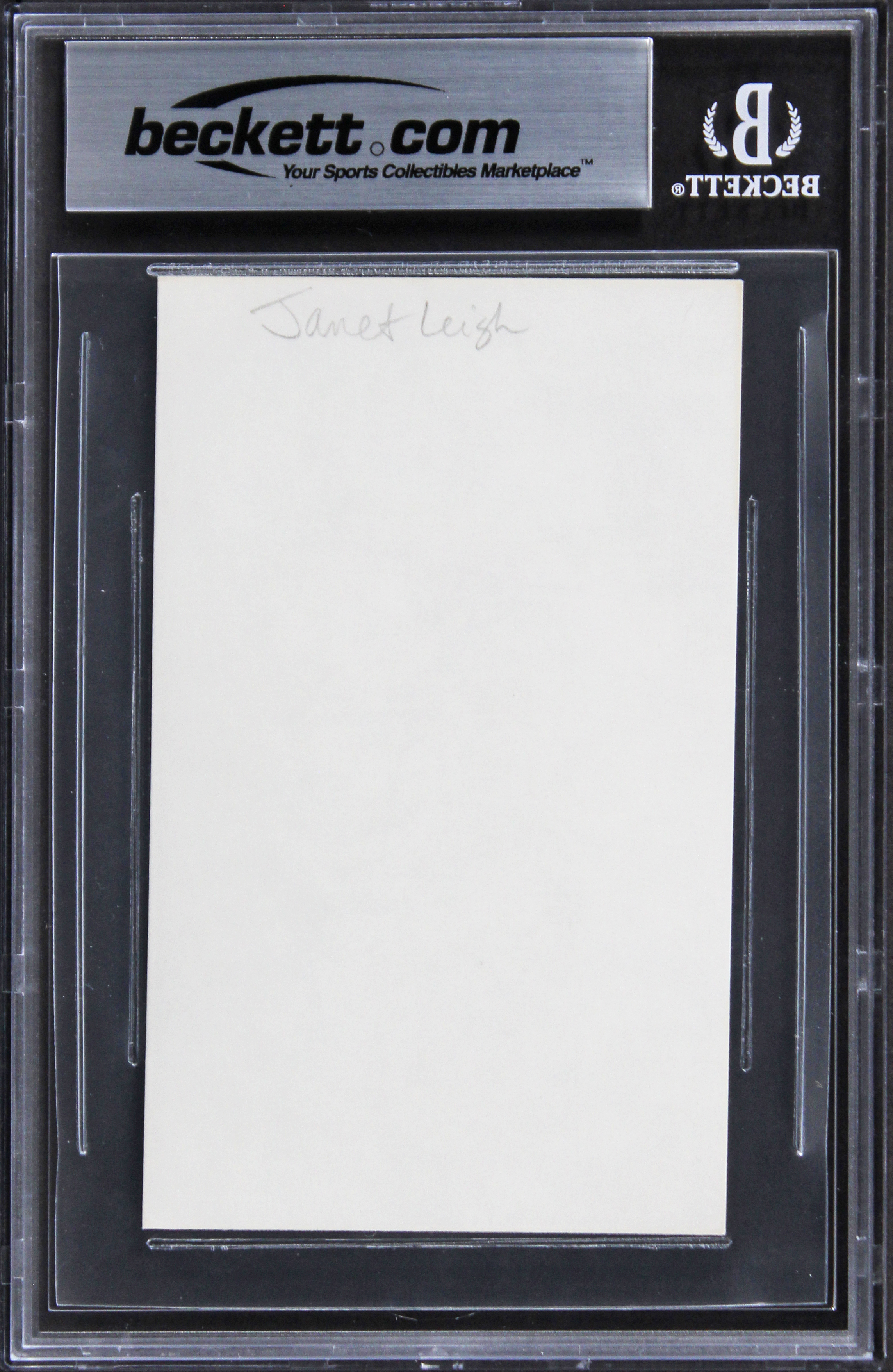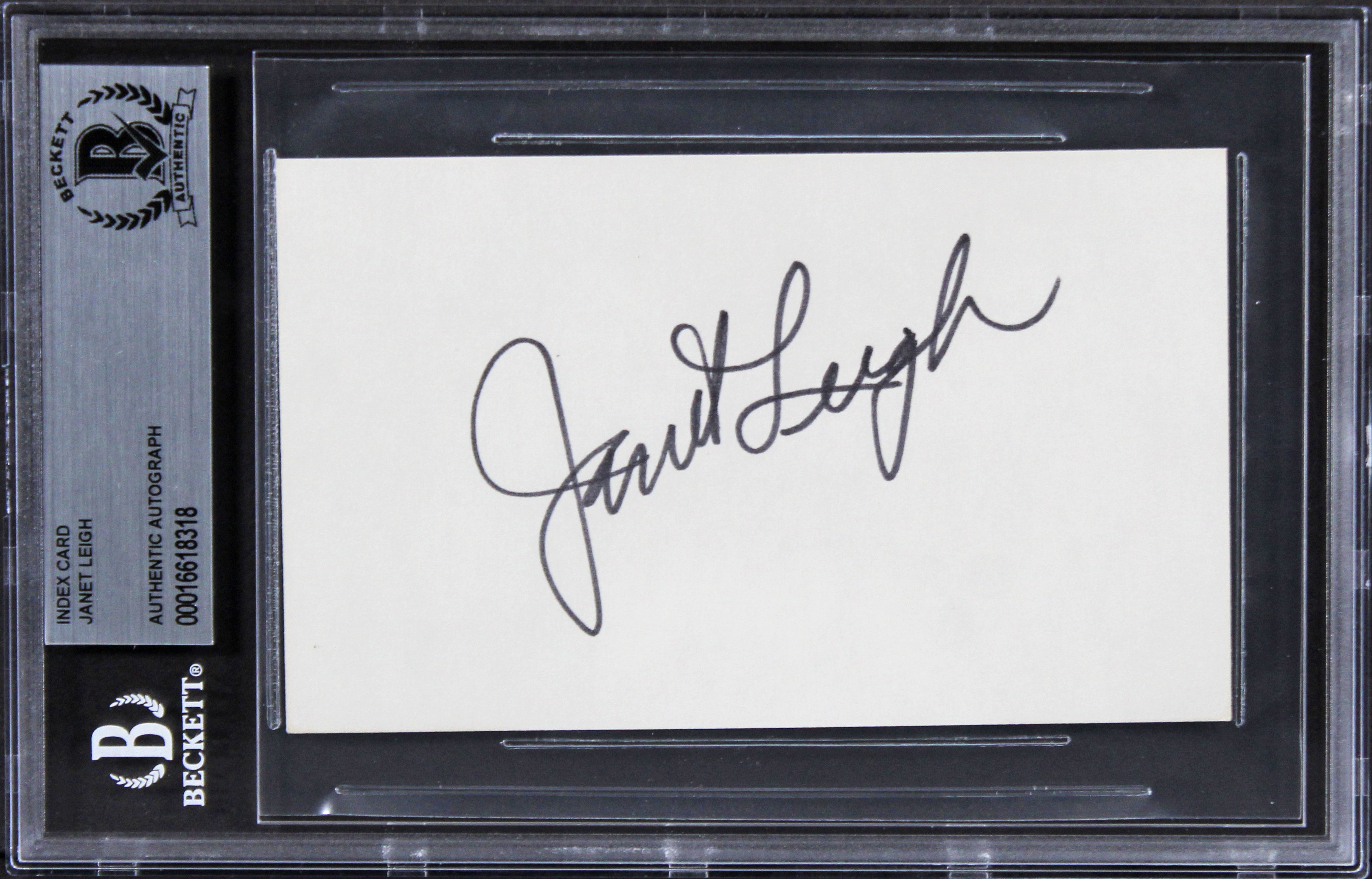This Autographed 3x5 Index Card has been Personally Signed by Janet Leigh of Psycho. This item is 100% Authentic, it comes slabbed and authenticated by Beckett Authentication Services. We have multiples of this same item. While the photographs are representative of this item, the size, placement and strength of the signature may vary. Each item is hand signed, therefore, each autograph is unique.