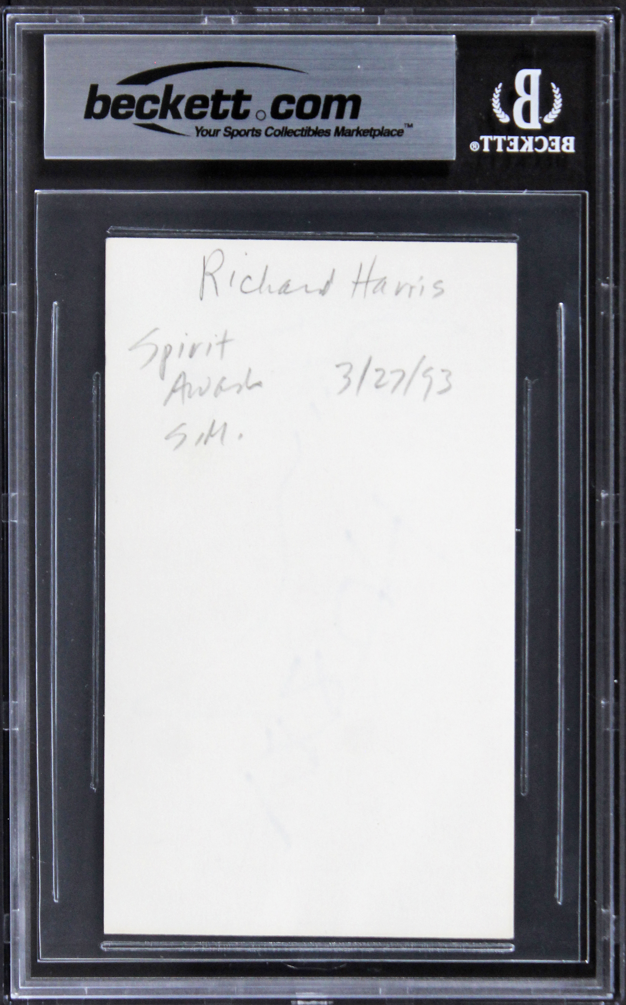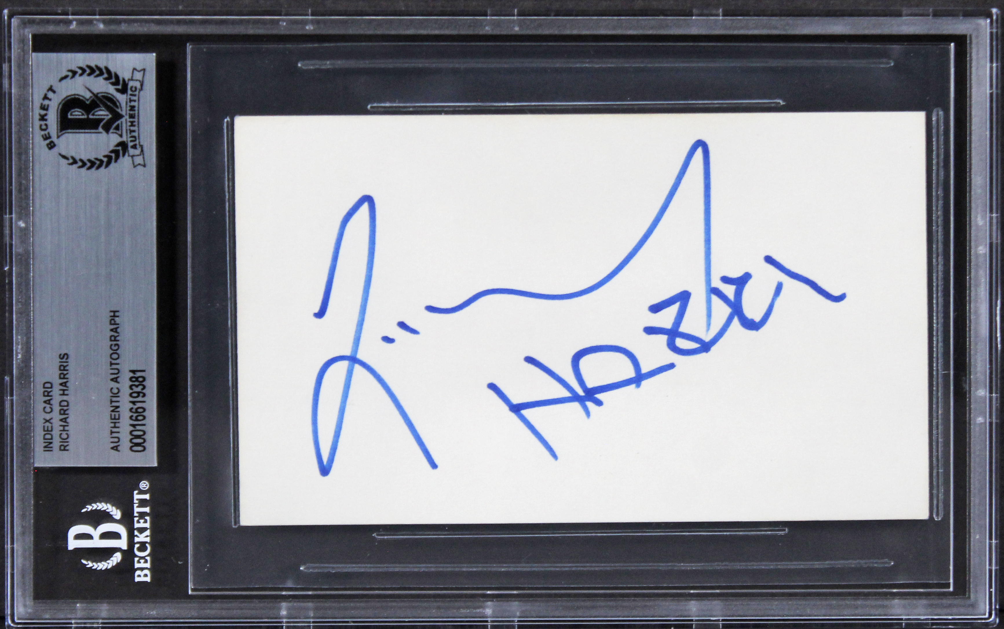 This Autographed w/ Blue Signature 3x5 Index Card has been Personally Signed by Richard Harris of Gladiator. This item is 100% Authentic, it comes slabbed and authenticated by Beckett Authentication Services. We have multiples of this same item. While the photographs are representative of this item, the size, placement and strength of the signature may vary. Each item is hand signed, therefore, each autograph is unique.