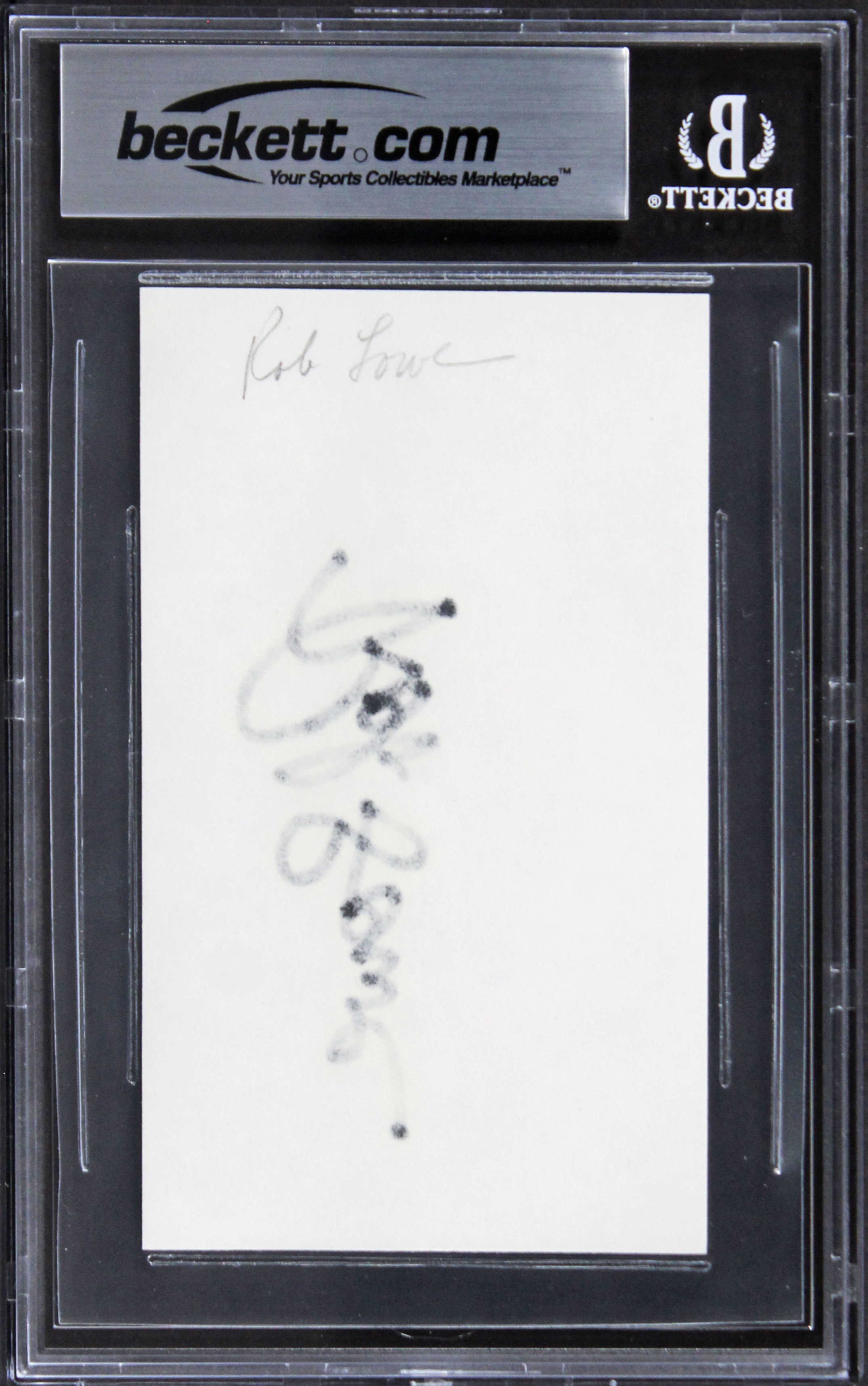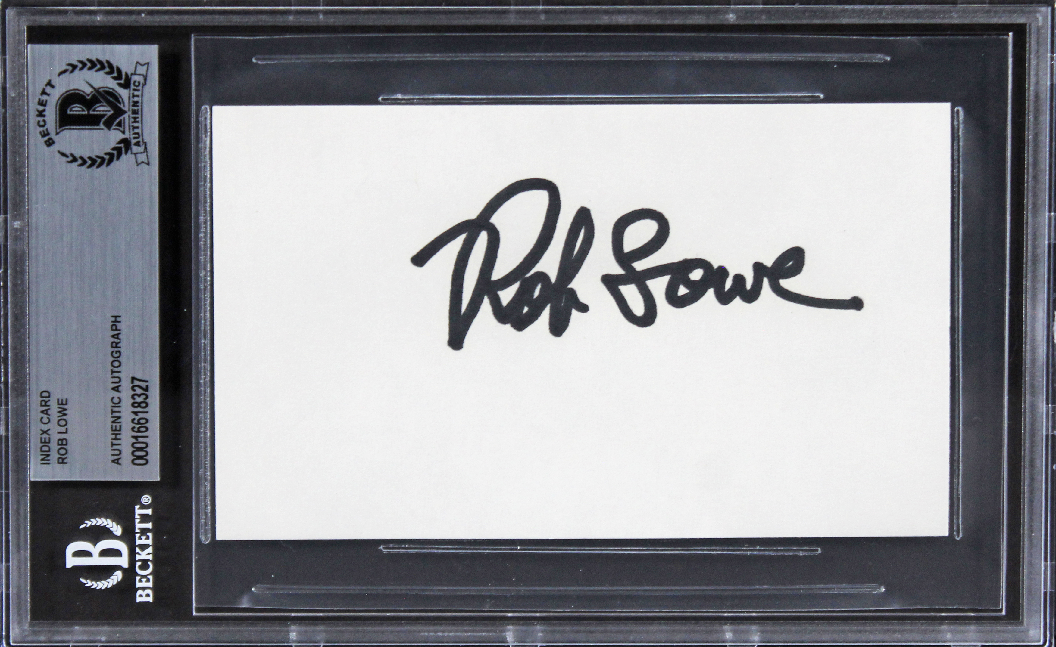 This Autographed 3x5 Index Card has been Personally Signed by Rob Lowe of The Outsiders. This item is 100% Authentic, it comes slabbed and authenticated by Beckett Authentication Services. We have multiples of this same item. While the photographs are representative of this item, the size, placement and strength of the signature may vary. Each item is hand signed, therefore, each autograph is unique.