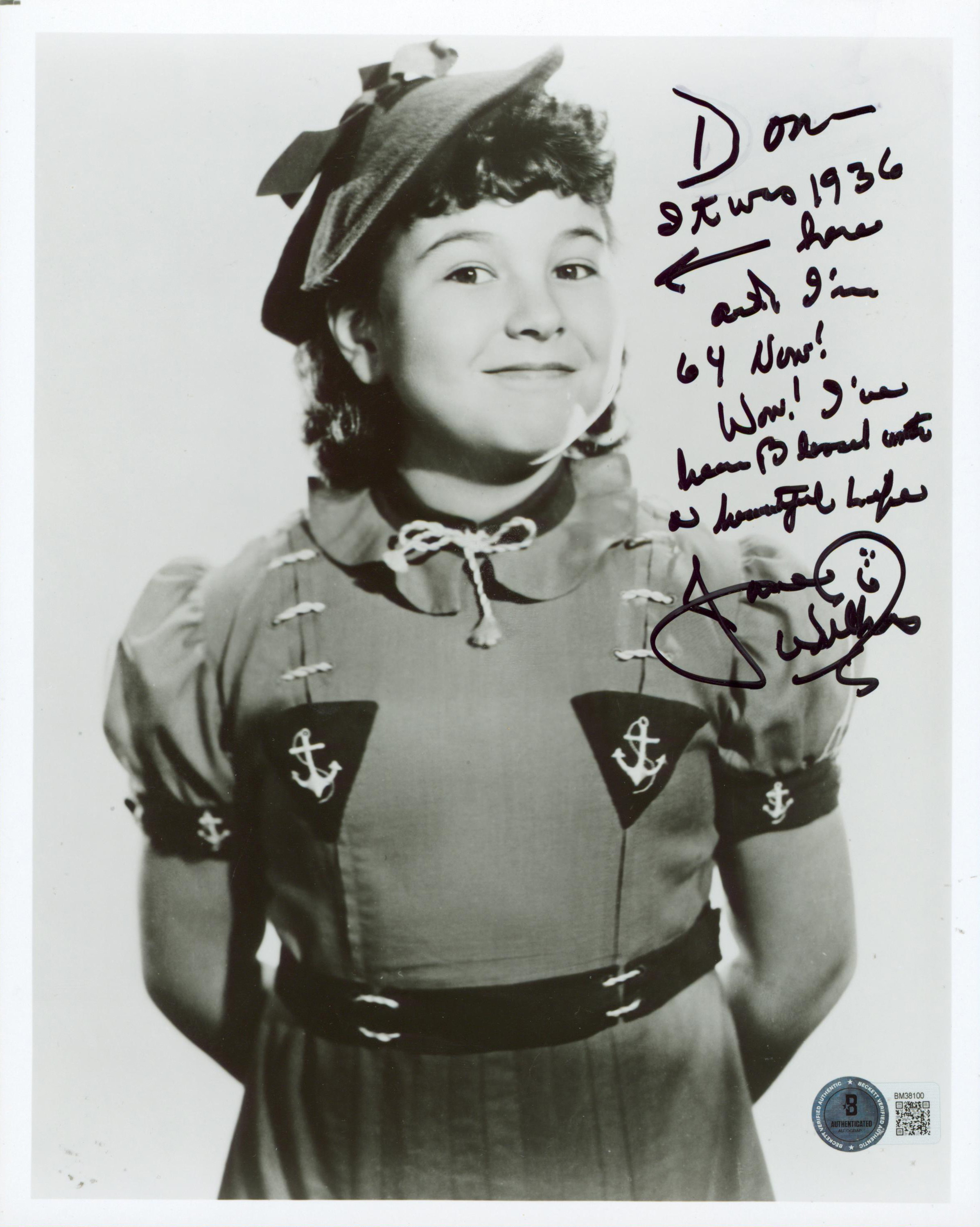 This Autographed 8x10 Photo with the inscription of "Don it was 1936 here and I'm 64 Now! Wow!" has been Personally Signed by Jane Withers of Giant. This item is 100% Authentic to include a hologram by Beckett Authentication Services. This item will come with an affixed Beckett Authentication Services (BAS) authentication sticker, which includes a scannable QR code to verify authenticity. Please note that Beckett no longer provides serial-numbered COA cards, and the attached BAS sticker will serve as the complete authentication for this item. The authenticity can be verified on Beckett Authentication Services website.