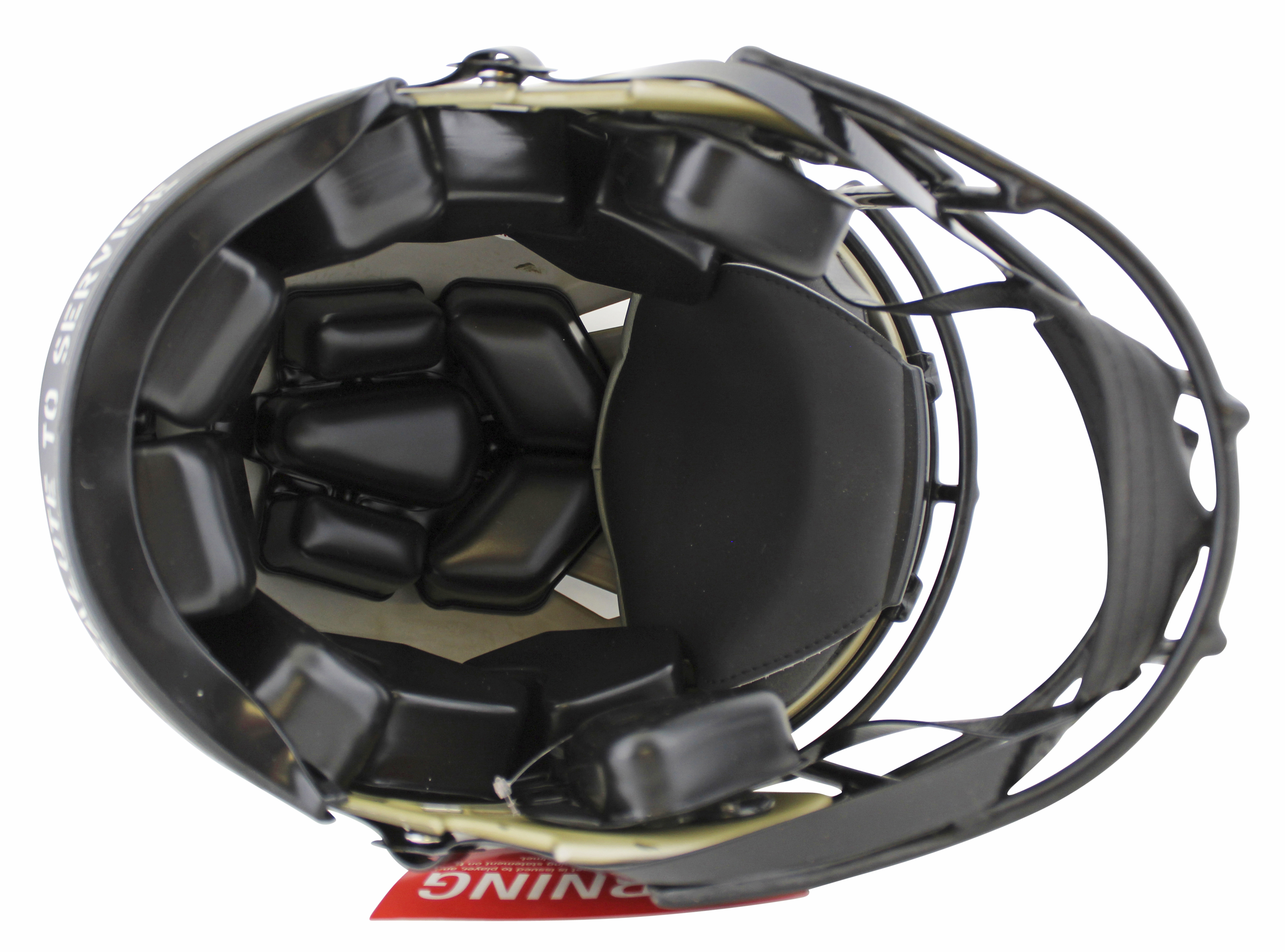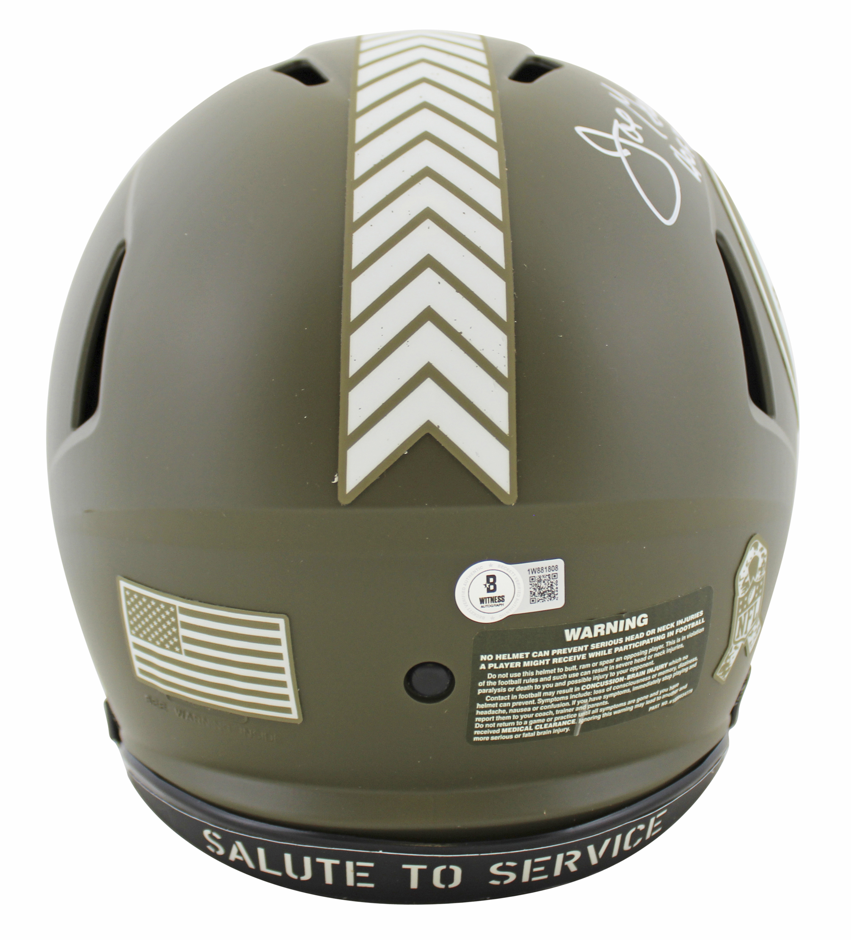 This Autographed Alternate Salute To Service Riddell Authentic Full Size Speed Proline Helmet with the inscription of "HOF 87" has been Personally Signed by Joe Greene of the Pittsburgh Steelers. This item is 100% Authentic to include a hologram by Beckett Authentication Services. This item will come with an affixed Beckett Authentication Services (BAS) authentication sticker, which includes a scannable QR code to verify authenticity. Please note that Beckett no longer provides serial-numbered COA cards, and the attached BAS sticker will serve as the complete authentication for this item. This is a BAS Witnessed Protection Program item which means a Beckett Authentication Service representative was present when this item was being signed. We conducted an autograph signing with Joe Greene where multiples of the same item were signed. While the photographs are representative of this item, the size, placement and strength of the signature may vary. Each item is hand signed, therefore, each autograph is unique. This item can be verified through BAS Witnessed.