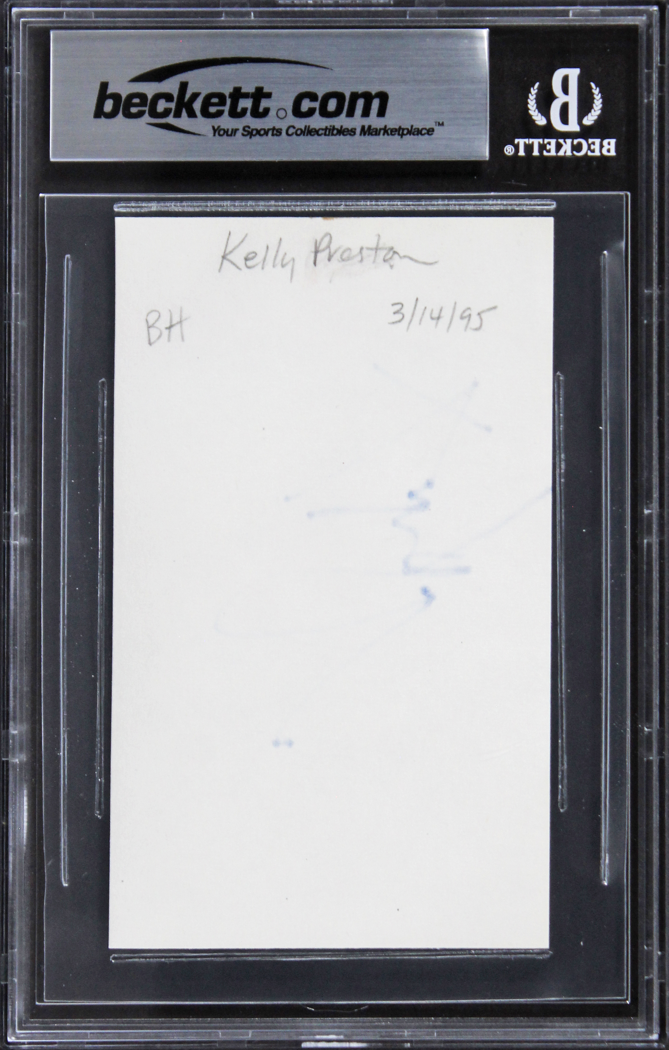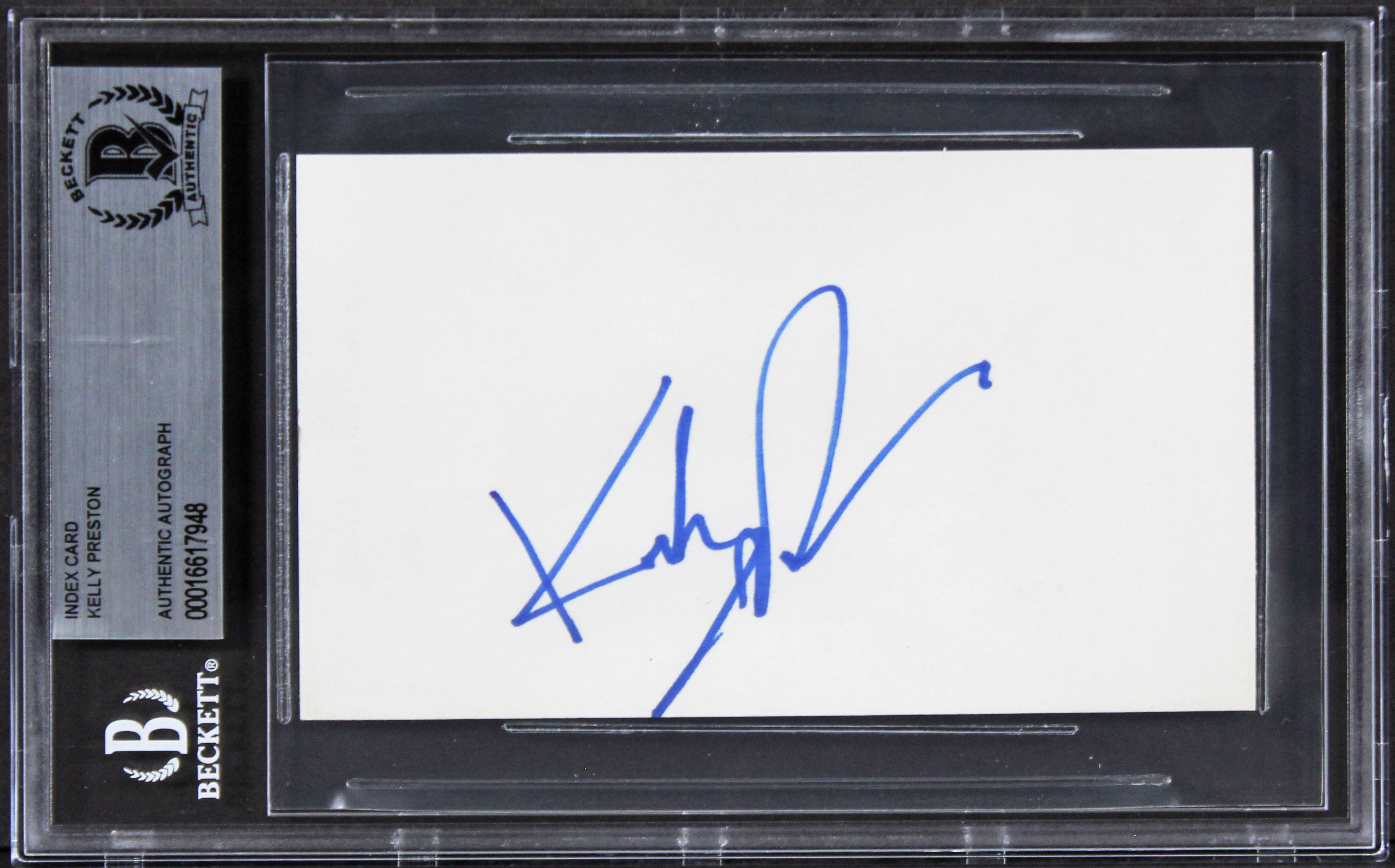 This Autographed 3x5 Index Card has been Personally Signed by Kelly Preston of Twins. This item is 100% Authentic, it comes slabbed and authenticated by Beckett Authentication Services. We have multiples of this same item. While the photographs are representative of this item, the size, placement and strength of the signature may vary. Each item is hand signed, therefore, each autograph is unique.