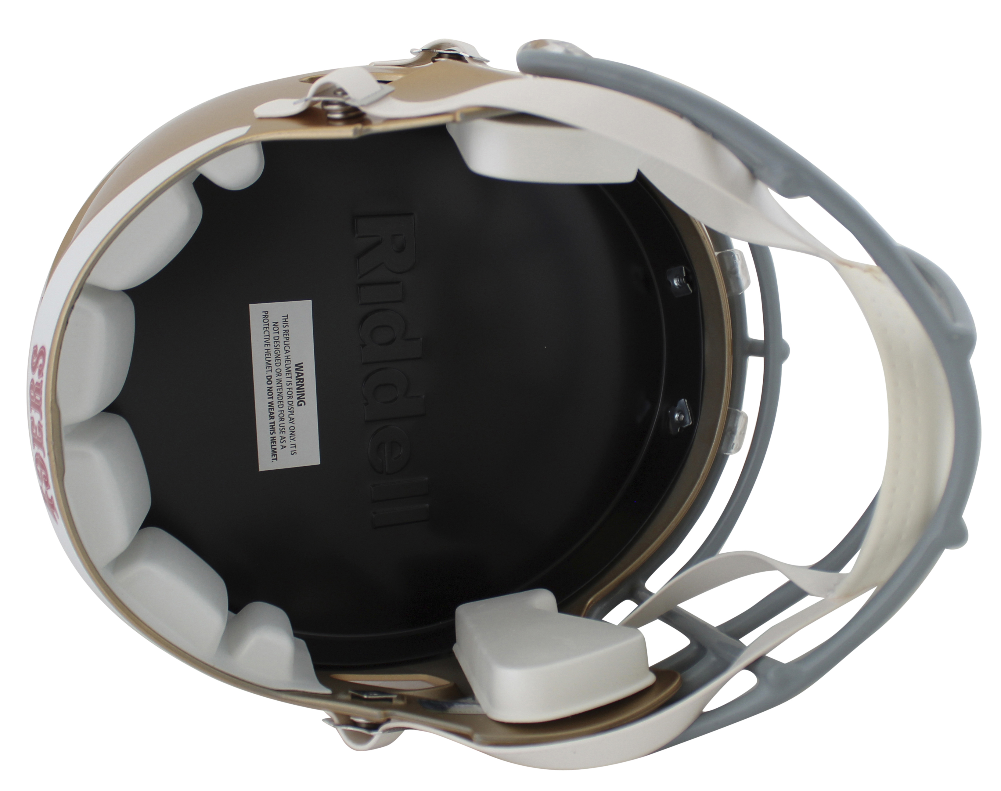 This Autographed Riddell Full Size Speed Rep Helmet W/ Uv Mirrored Back Acrylic Display Case has been Personally Signed by Joe Montana of the San Francisco 49ers. This item is 100% Authentic to includes a numbered hologram by Fanatics. We conducted an autograph signing with Joe Montana where multiples of the same item were signed. While the photographs are representative of this item, the size, placement and strength of the signature may vary. Each item is hand signed, therefore, each autograph is unique. This item can be verified through Fanatics.