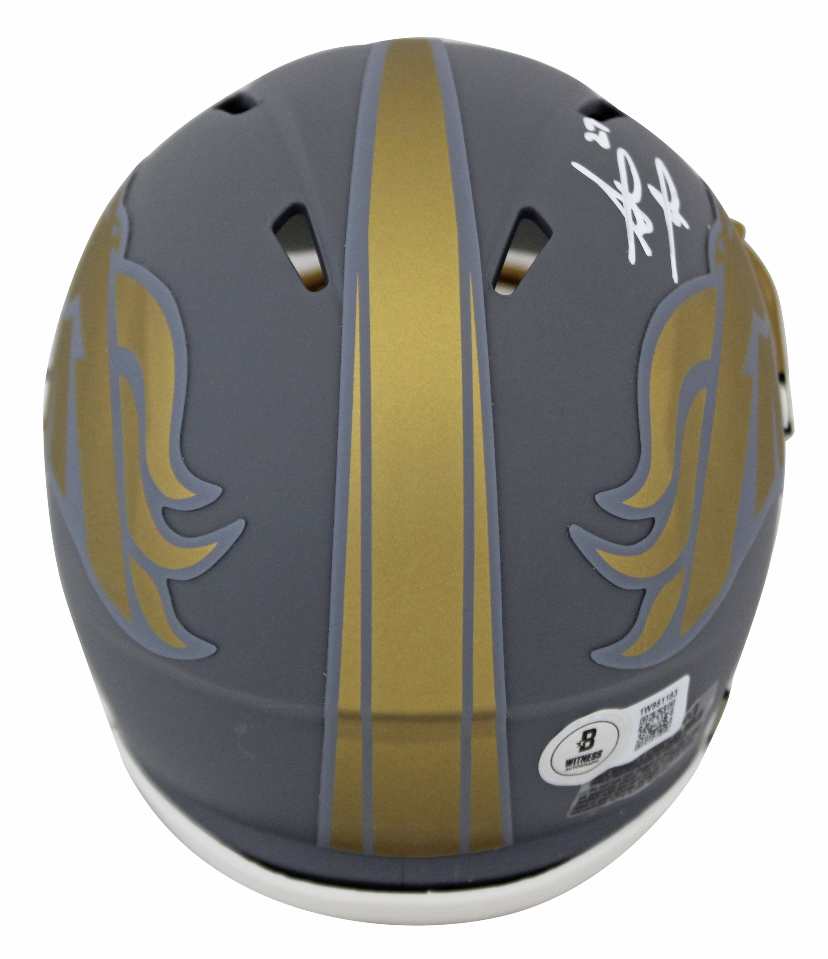 This Autographed Alternate Slate Speed Mini Helmet has been Personally Signed by Steve Atwater of the Denver Broncos. This item is 100% Authentic to include a hologram by Beckett Authentication Services. This item will come with an affixed Beckett Authentication Services (BAS) authentication sticker, which includes a scannable QR code to verify authenticity. Please note that Beckett no longer provides serial-numbered COA cards, and the attached BAS sticker will serve as the complete authentication for this item. This is a BAS Witnessed Protection Program item which means a Beckett Authentication Service representative was present when this item was being signed. We conducted an autograph signing with Steve Atwater where multiples of the same item were signed. While the photographs are representative of this item, the size, placement and strength of the signature may vary. Each item is hand signed, therefore, each autograph is unique. This item can be verified through BAS Witnessed.