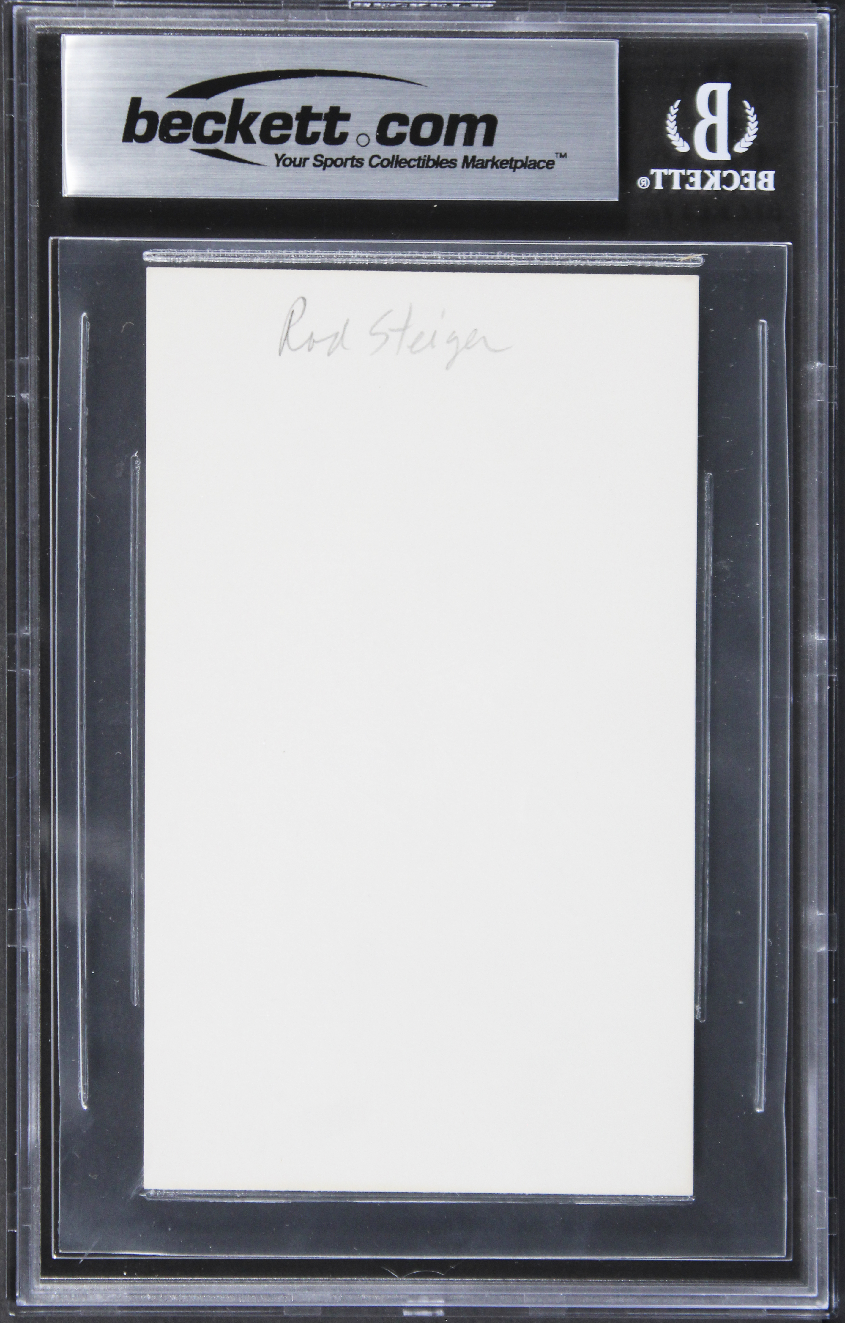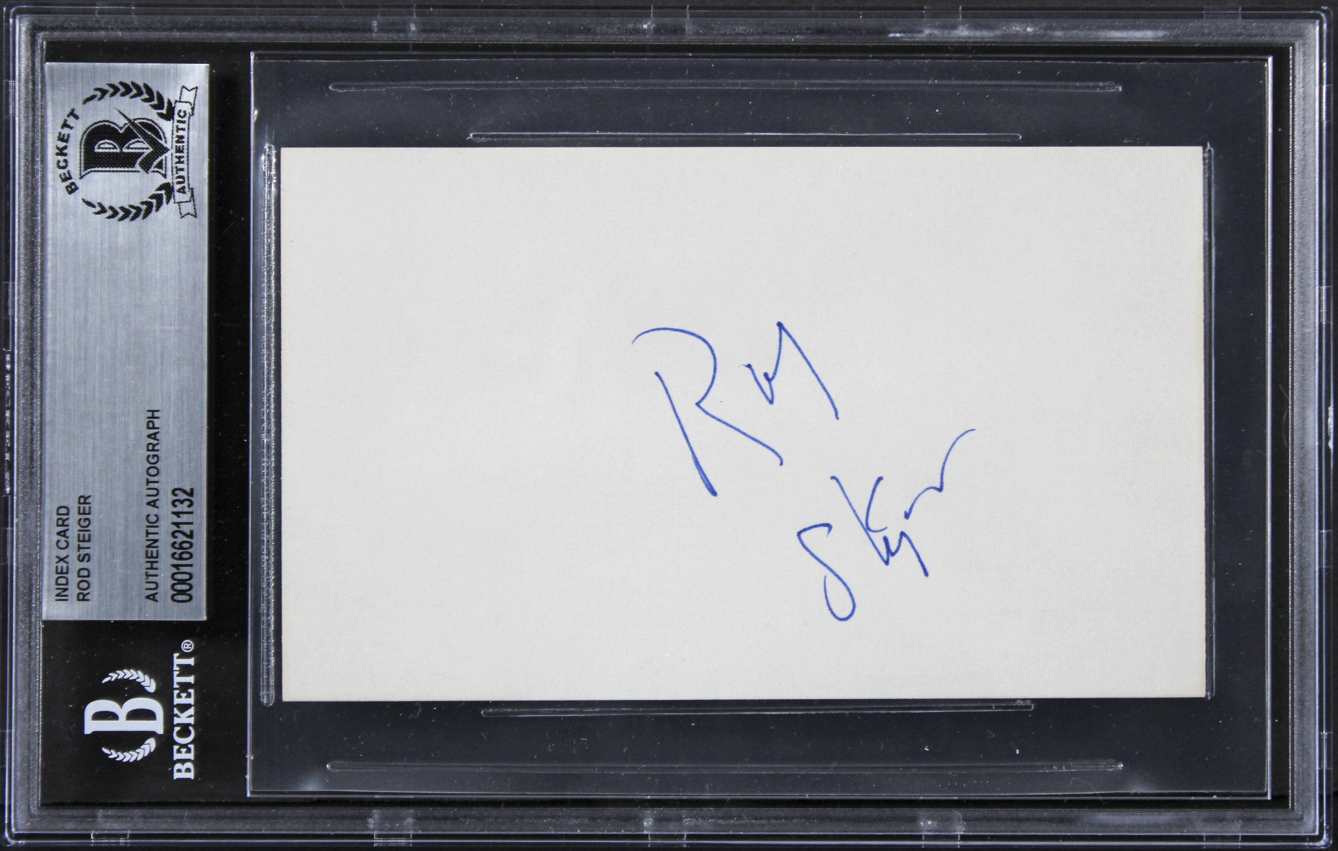 This Autographed 3x5 Index Card has been Personally Signed by Rod Steiger of In The Heat of the Night. This item is 100% Authentic, it comes slabbed and authenticated by Beckett Authentication Services. We have multiples of this same item. While the photographs are representative of this item, the size, placement and strength of the signature may vary. Each item is hand signed, therefore, each autograph is unique.