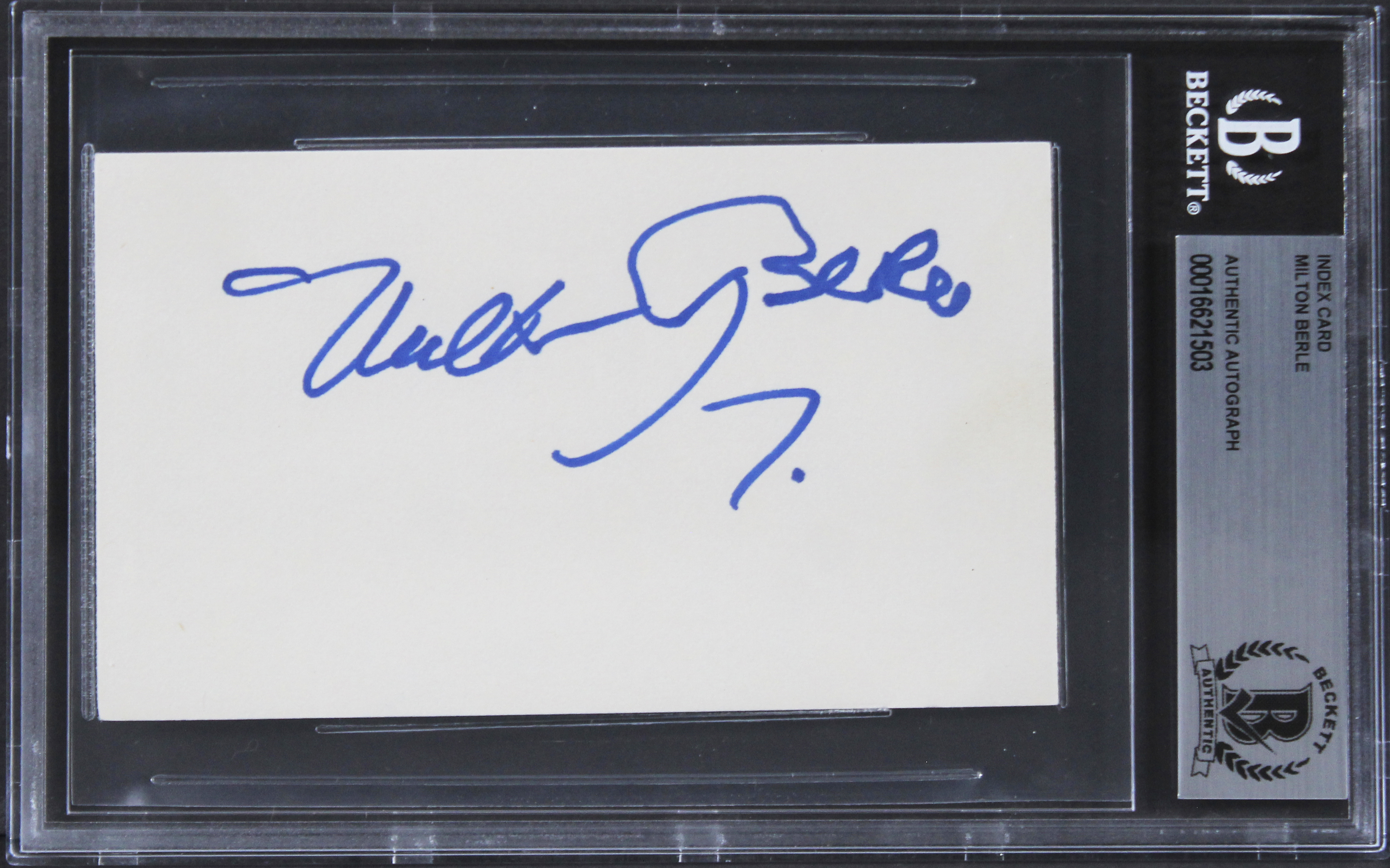 This Autographed 3x5 Index Card has been Personally Signed by Milton Berle of The Milton Berle Show. This item is 100% Authentic, it comes slabbed and authenticated by Beckett Authentication Services. The authenticity can be verified on Beckett Authentication Services website.