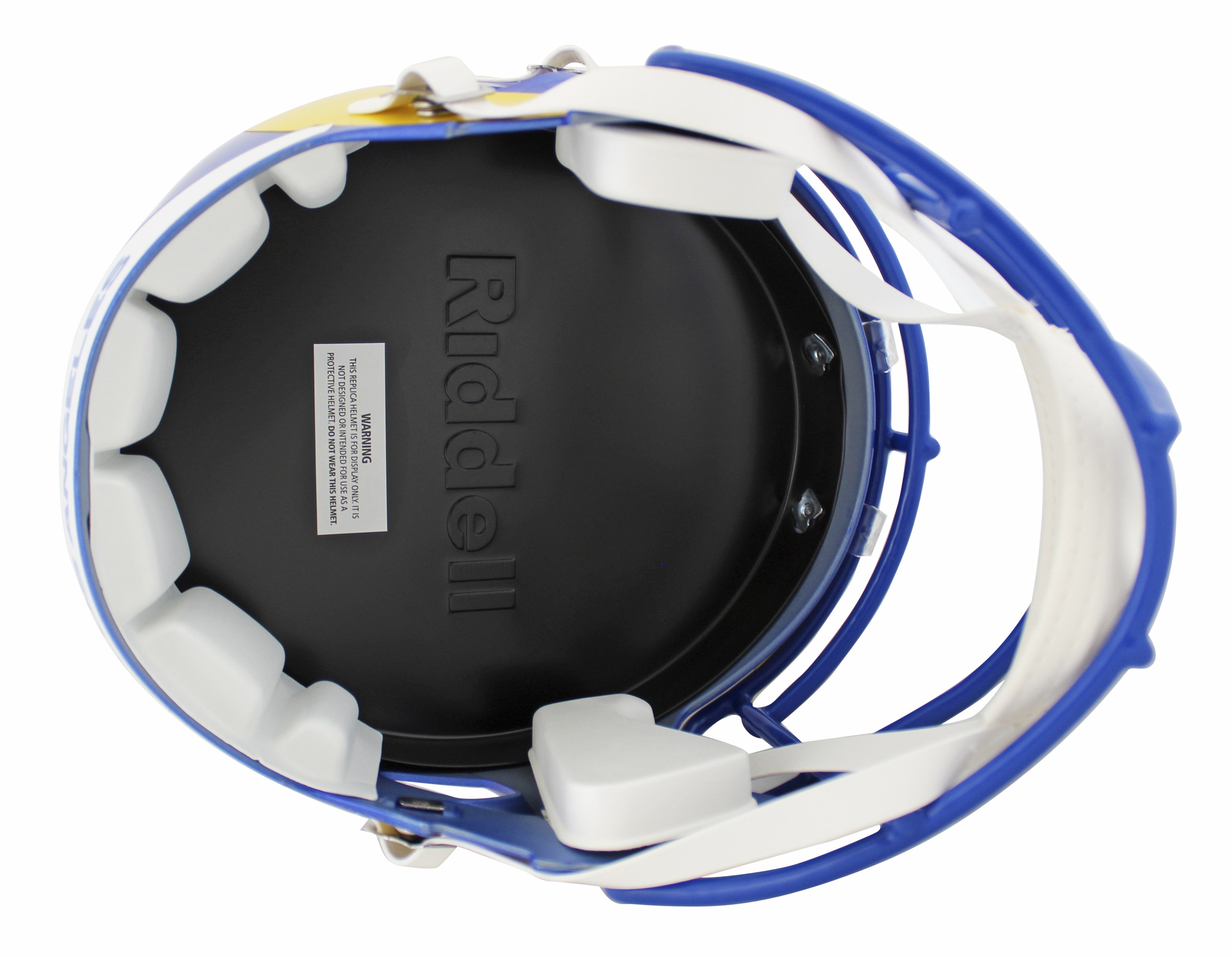This Autographed Riddell Full Size Speed Rep Helmet has been Personally Signed by Blake Corum of the Los Angeles Rams. This item is 100% Authentic to include a hologram by Beckett Authentication Services. This item will come with an affixed Beckett Authentication Services (BAS) authentication sticker, which includes a scannable QR code to verify authenticity. Please note that Beckett no longer provides serial-numbered COA cards, and the attached BAS sticker will serve as the complete authentication for this item. This is a BAS Witnessed Protection Program item which means a Beckett Authentication Service representative was present when this item was being signed. We conducted an autograph signing with Blake Corum where multiples of the same item were signed. While the photographs are representative of this item, the size, placement and strength of the signature may vary. Each item is hand signed, therefore, each autograph is unique. This item can be verified through BAS Witnessed.