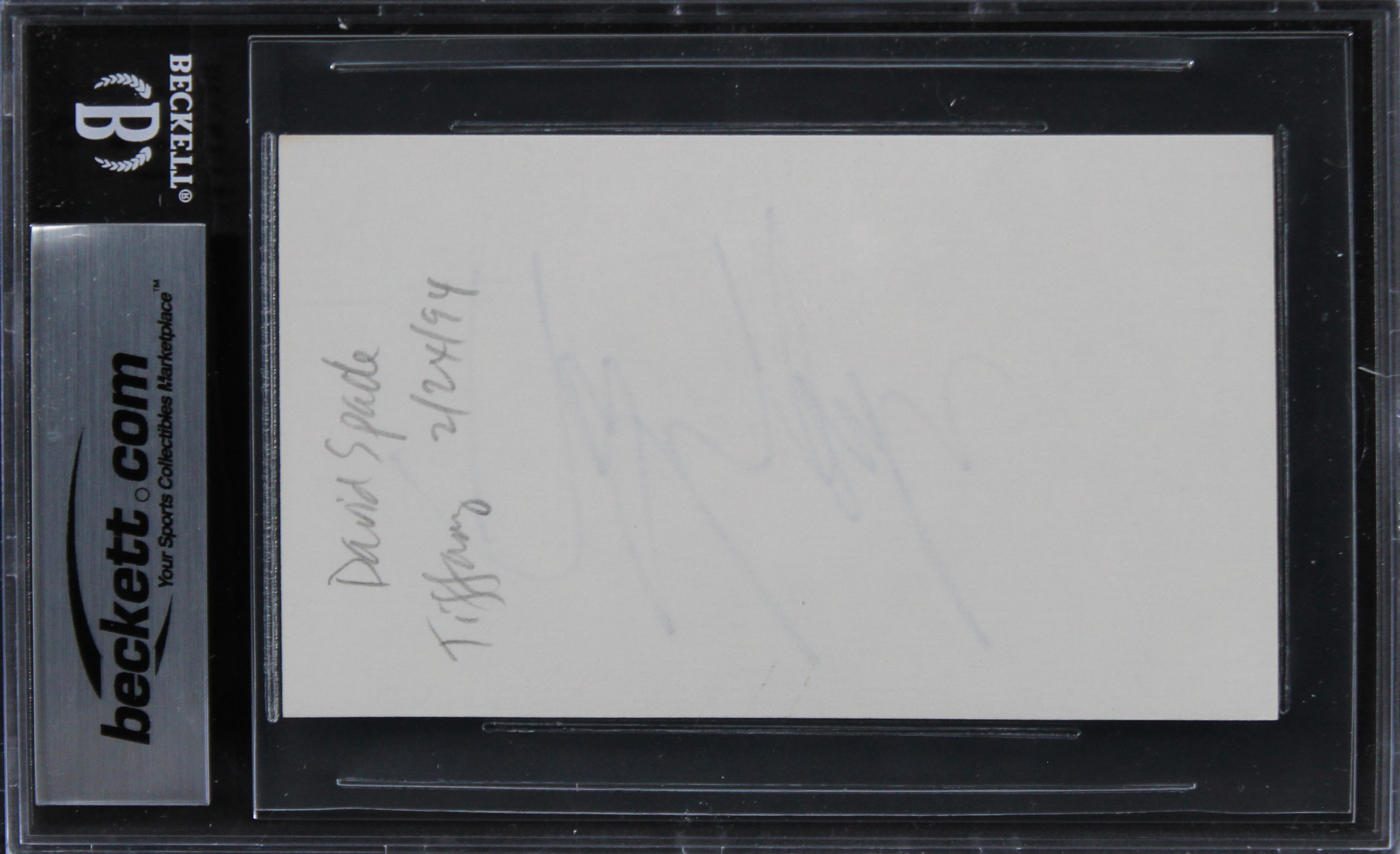 This Autographed 3x5 Index Card has been Personally Signed by David Spade of Joe Dirt. This item is 100% Authentic, it comes slabbed and authenticated by Beckett Authentication Services. We have multiples of this same item. While the photographs are representative of this item, the size, placement and strength of the signature may vary. Each item is hand signed, therefore, each autograph is unique.
