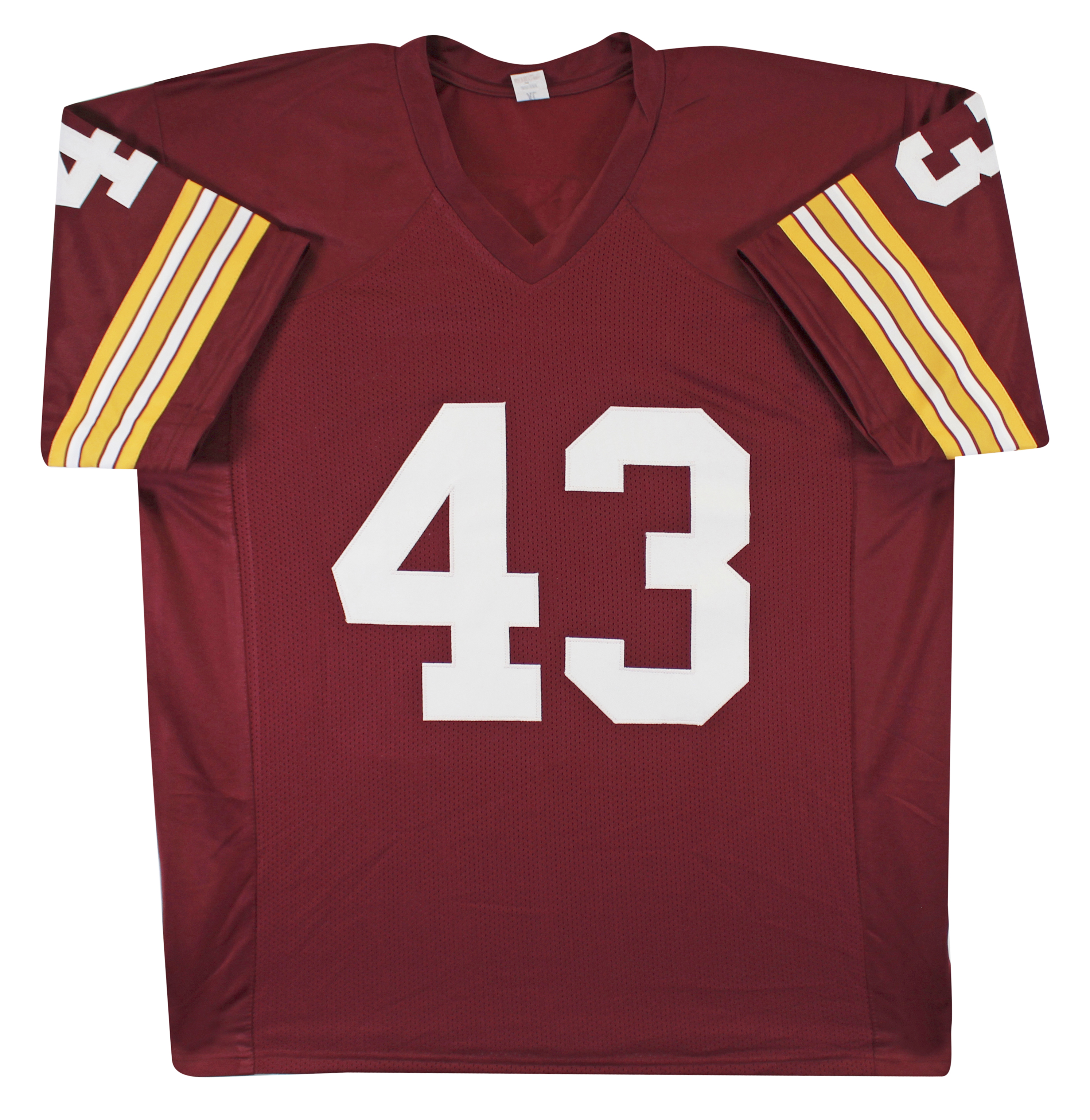 This Autographed Maroon Pro Style Jersey has been Personally Signed by Larry Brown of the Washington Commanders. This item is 100% Authentic to include a hologram by Beckett Authentication Services. This item will come with an affixed Beckett Authentication Services (BAS) authentication sticker, which includes a scannable QR code to verify authenticity. Please note that Beckett no longer provides serial-numbered COA cards, and the attached BAS sticker will serve as the complete authentication for this item. This is a BAS Witnessed Protection Program item which means a Beckett Authentication Service representative was present when this item was being signed. We conducted an autograph signing with Larry Brown where multiples of the same item were signed. While the photographs are representative of this item, the size, placement and strength of the signature may vary. Each item is hand signed, therefore, each autograph is unique. This item can be verified through BAS Witnessed. This is a X-Large sized, non-branded, custom-stitched Jersey.