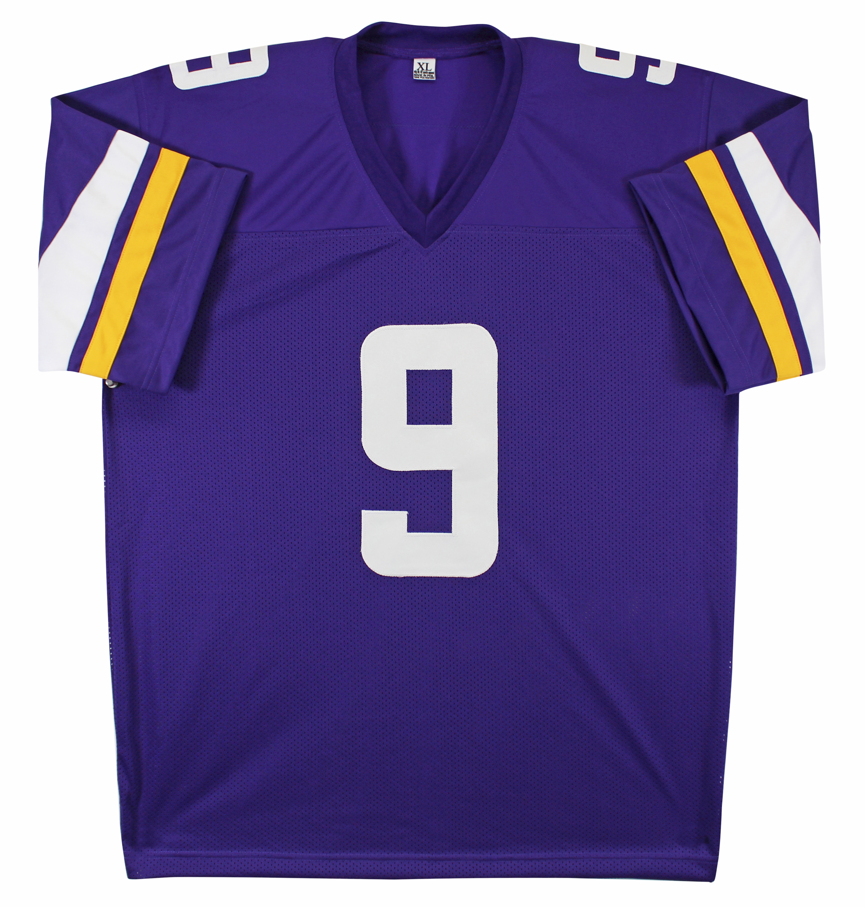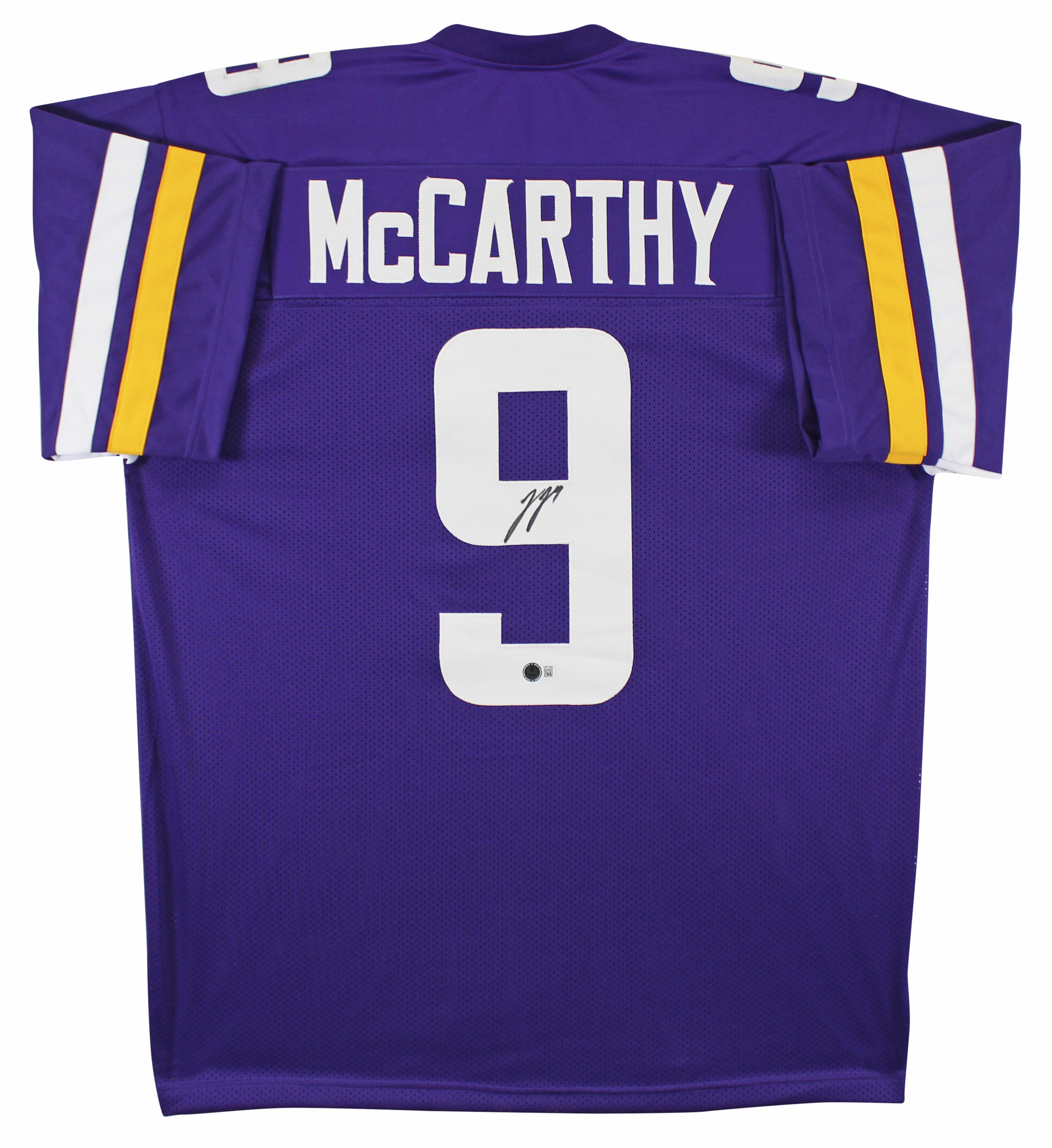 This Autographed Purple Pro Style Jersey has been Personally Signed by J.J. McCarthy of the Minnesota Vikings. This item is 100% Authentic to include a hologram by Beckett Authentication Services. This item will come with an affixed Beckett Authentication Services (BAS) authentication sticker, which includes a scannable QR code to verify authenticity. Please note that Beckett no longer provides serial-numbered COA cards, and the attached BAS sticker will serve as the complete authentication for this item. This is a BAS Witnessed Protection Program item which means a Beckett Authentication Service representative was present when this item was being signed. We conducted an autograph signing with J.J. McCarthy where multiples of the same item were signed. While the photographs are representative of this item, the size, placement and strength of the signature may vary. Each item is hand signed, therefore, each autograph is unique. This item can be verified through BAS Witnessed. This is a X-Large sized, non-branded, custom-stitched Jersey.