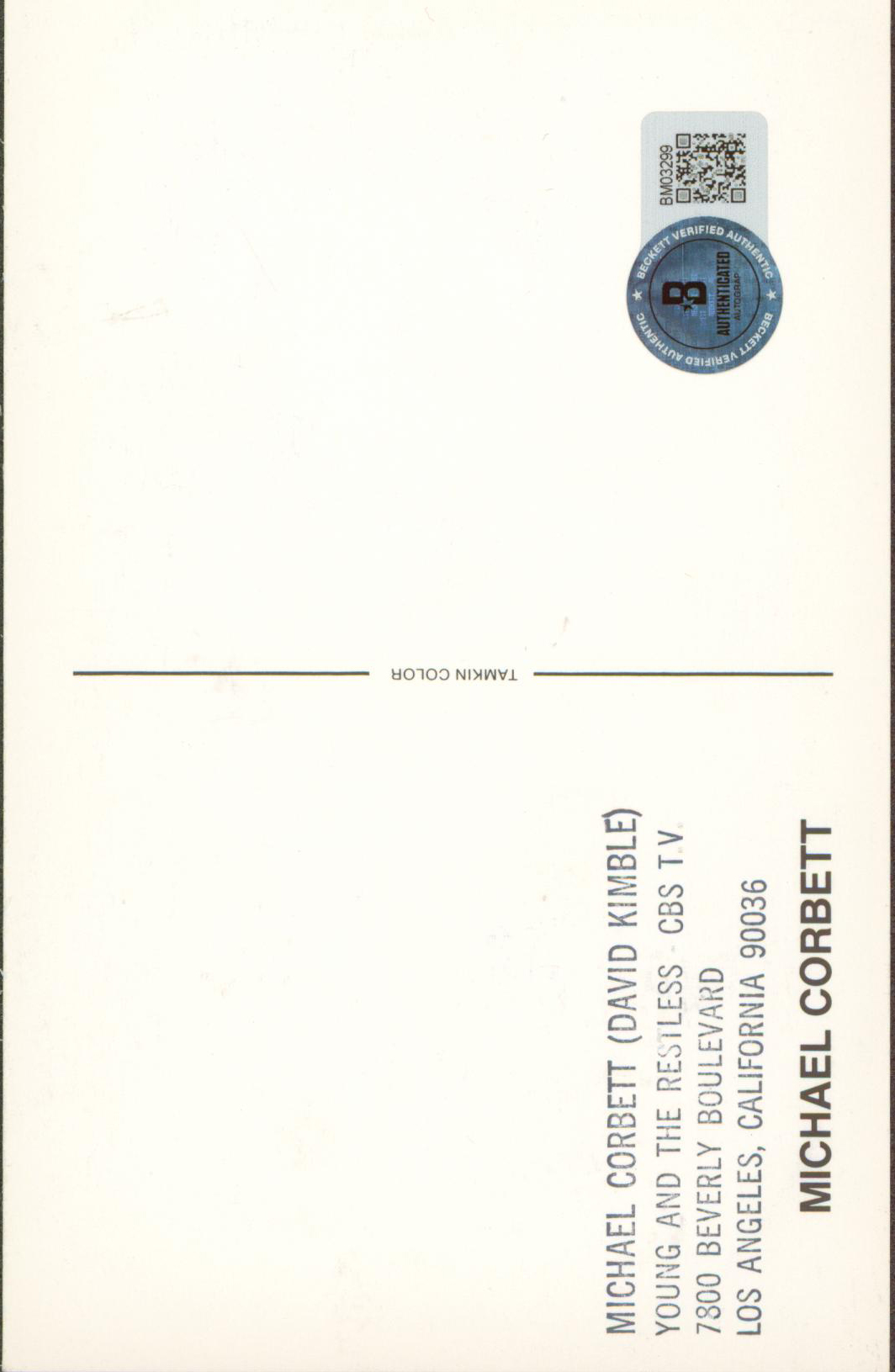 This Autographed 3.5x5.5 Postcard has been Personally Signed by Michael Corbett of The Young and the Restless. This item is 100% Authentic to include a hologram by Beckett Authentication Services. This item will come with an affixed Beckett Authentication Services (BAS) authentication sticker, which includes a scannable QR code to verify authenticity. Please note that Beckett no longer provides serial-numbered COA cards, and the attached BAS sticker will serve as the complete authentication for this item. The authenticity can be verified on Beckett Authentication Services website.