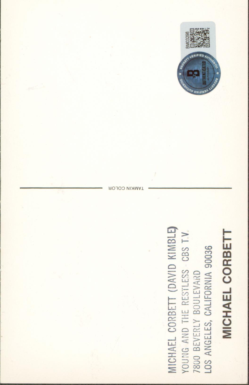 This Autographed 3.5x5.5 Postcard with the inscription of "To Don, Best Wishes" has been Personally Signed by Michael Corbett of The Young and the Restless. This item is 100% Authentic to include a hologram by Beckett Authentication Services. This item will come with an affixed Beckett Authentication Services (BAS) authentication sticker, which includes a scannable QR code to verify authenticity. Please note that Beckett no longer provides serial-numbered COA cards, and the attached BAS sticker will serve as the complete authentication for this item. The authenticity can be verified on Beckett Authentication Services website.