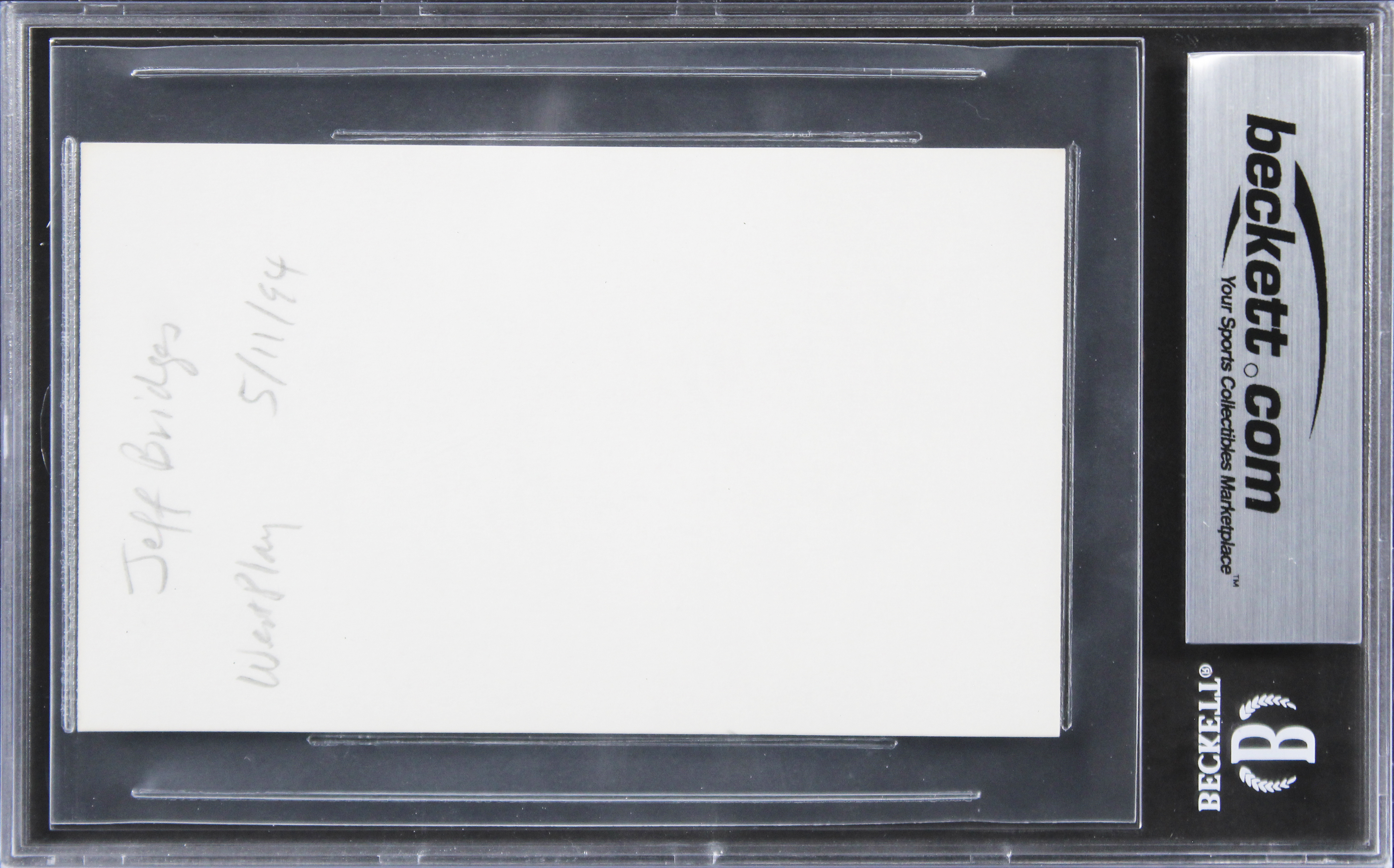 This Autographed 3x5 Index Card has been Personally Signed by Jeff Bridges of The Big Lebowski. This item is 100% Authentic, it comes slabbed and authenticated by Beckett Authentication Services. We have multiples of this same item. While the photographs are representative of this item, the size, placement and strength of the signature may vary. Each item is hand signed, therefore, each autograph is unique.