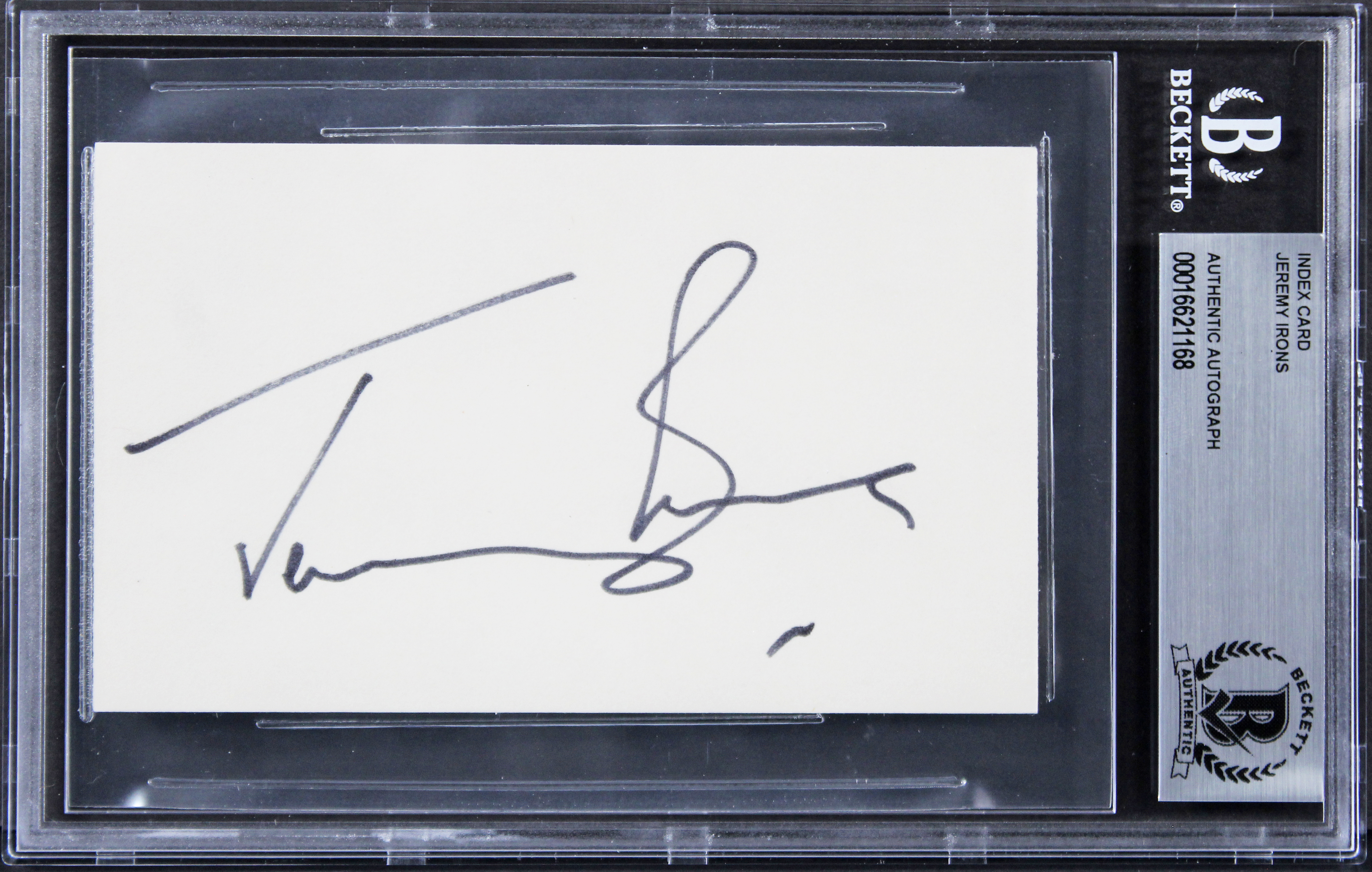 This Autographed 3x5 Index Card has been Personally Signed by Jeremy Irons of Dead Ringers. This item is 100% Authentic, it comes slabbed and authenticated by Beckett Authentication Services. We have multiples of this same item. While the photographs are representative of this item, the size, placement and strength of the signature may vary. Each item is hand signed, therefore, each autograph is unique.