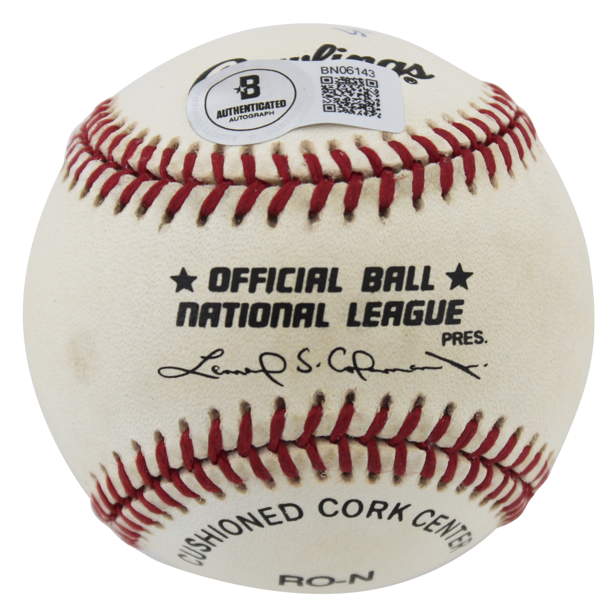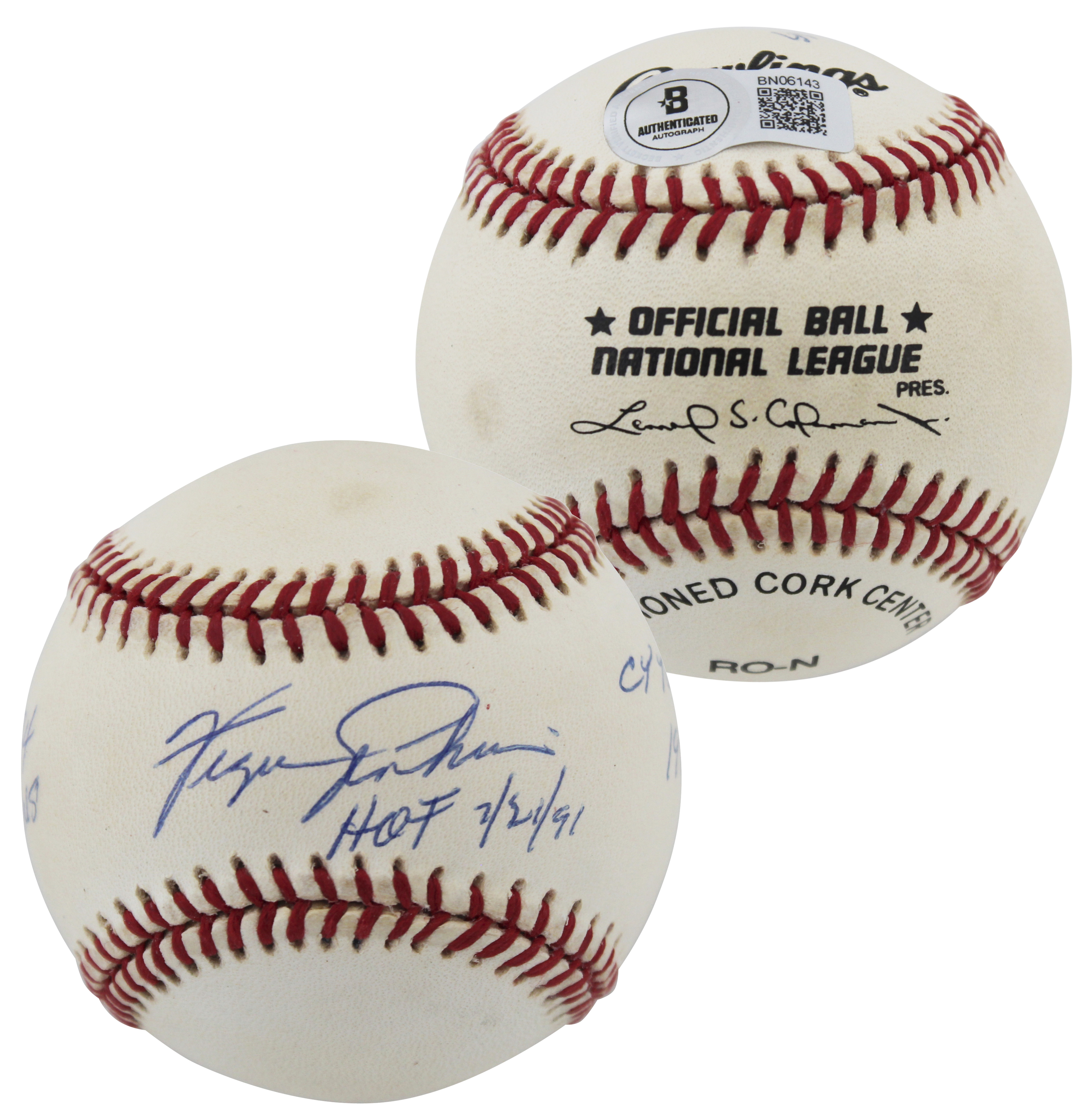 This Autographed Leonard Coleman Onl Baseball with the inscription of "HOF 7/21/91, 284 Wins, CY Young 1971" has been Personally Signed by Fergie Jenkins of the Chicago Cubs. This item is 100% Authentic to include a hologram by Beckett Authentication Services. This item will come with an affixed Beckett Authentication Services (BAS) authentication sticker, which includes a scannable QR code to verify authenticity. Please note that Beckett no longer provides serial-numbered COA cards, and the attached BAS sticker will serve as the complete authentication for this item. The authenticity can be verified on Beckett Authentication Services website.