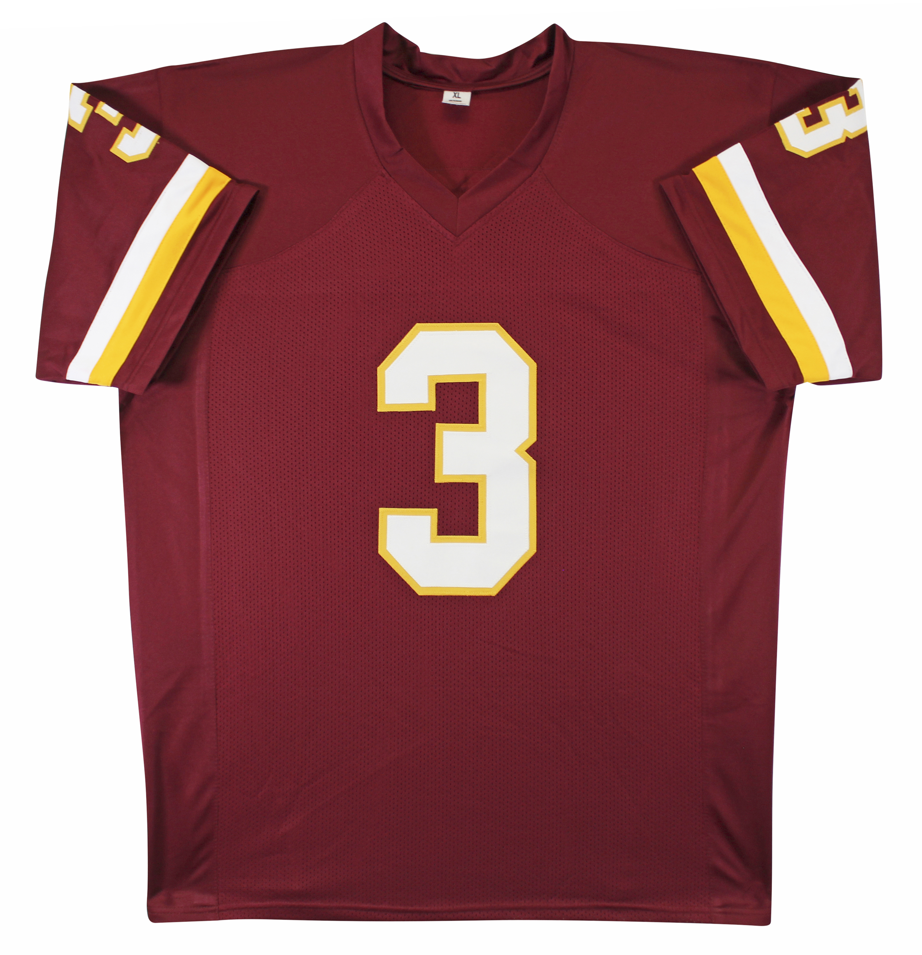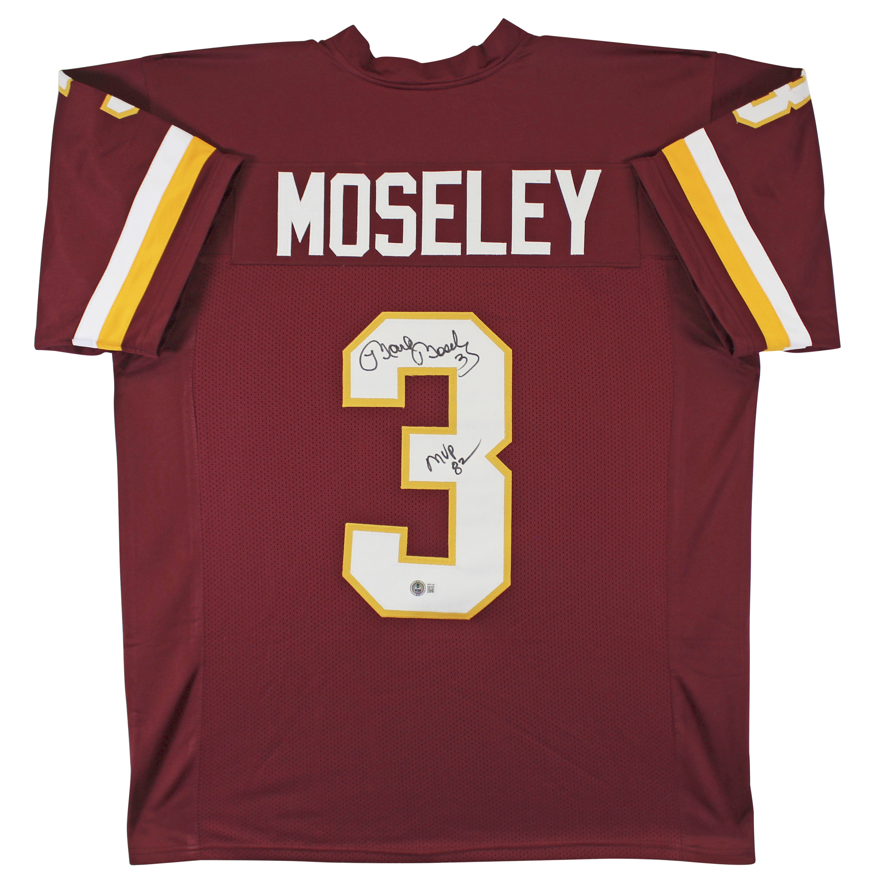 This Autographed Maroon Pro Style Jersey has been Personally Signed by Mark Moseley of the Washington Commanders. This item is 100% Authentic to include a hologram by Beckett Authentication Services. This item will come with an affixed Beckett Authentication Services (BAS) authentication sticker, which includes a scannable QR code to verify authenticity. Please note that Beckett no longer provides serial-numbered COA cards, and the attached BAS sticker will serve as the complete authentication for this item. This is a BAS Witnessed Protection Program item which means a Beckett Authentication Service representative was present when this item was being signed. We conducted an autograph signing with Mark Moseley where multiples of the same item were signed. While the photographs are representative of this item, the size, placement and strength of the signature may vary. Each item is hand signed, therefore, each autograph is unique. This item can be verified through BAS Witnessed. This is a X-Large sized, non-branded, custom-stitched Jersey.
