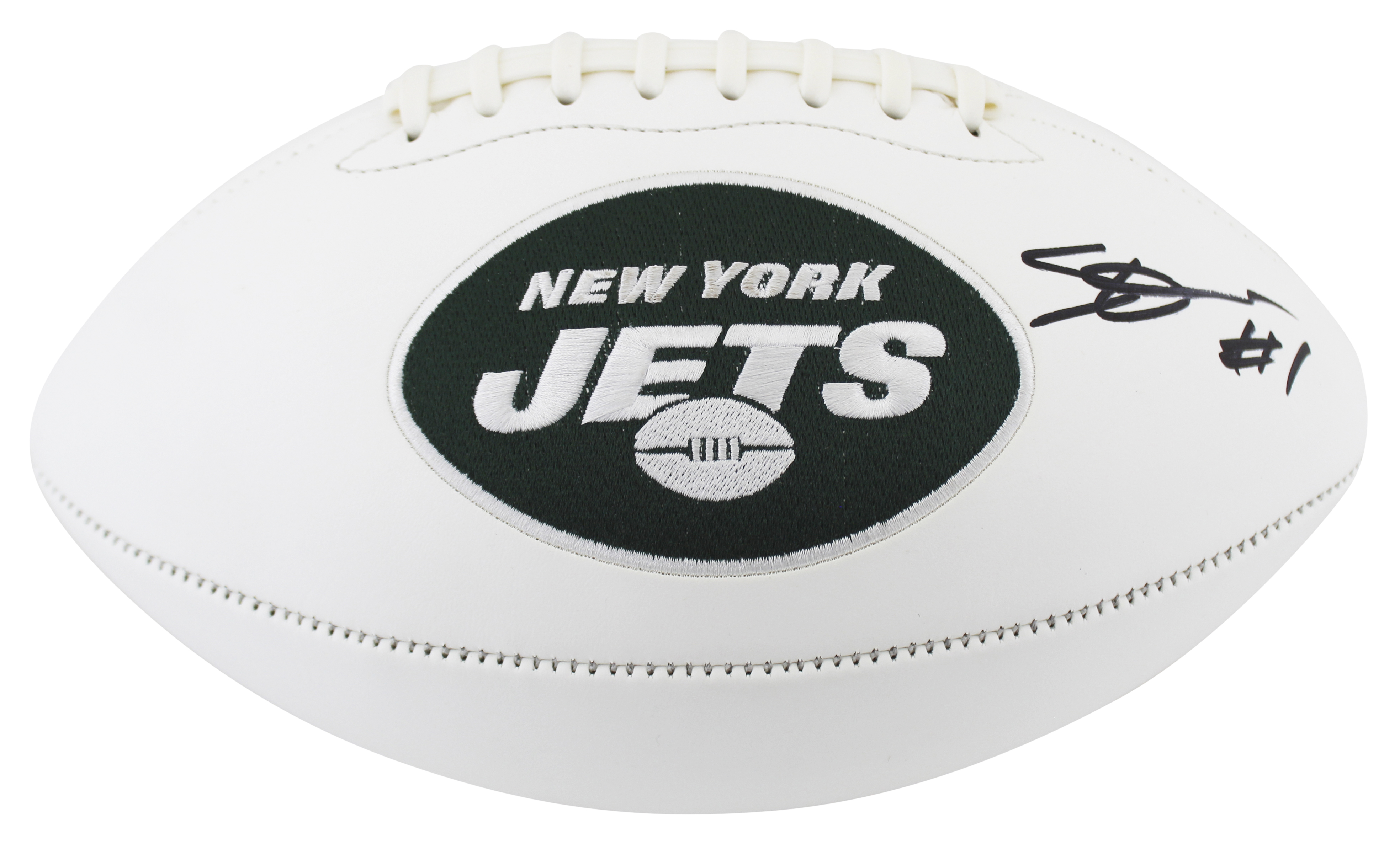 This Autographed Rawlings White Panel Logo Football has been Personally Signed by Ahmad "Sauce" Gardner of the New York Jets. This item is 100% Authentic to include a hologram by Beckett Authentication Services. This item will come with an affixed Beckett Authentication Services (BAS) authentication sticker, which includes a scannable QR code to verify authenticity. Please note that Beckett no longer provides serial-numbered COA cards, and the attached BAS sticker will serve as the complete authentication for this item. This is a BAS Witnessed Protection Program item which means a Beckett Authentication Service representative was present when this item was being signed. We conducted an autograph signing with Ahmad "Sauce" Gardner where multiples of the same item were signed. While the photographs are representative of this item, the size, placement and strength of the signature may vary. Each item is hand signed, therefore, each autograph is unique. This item can be verified through BAS Witnessed.