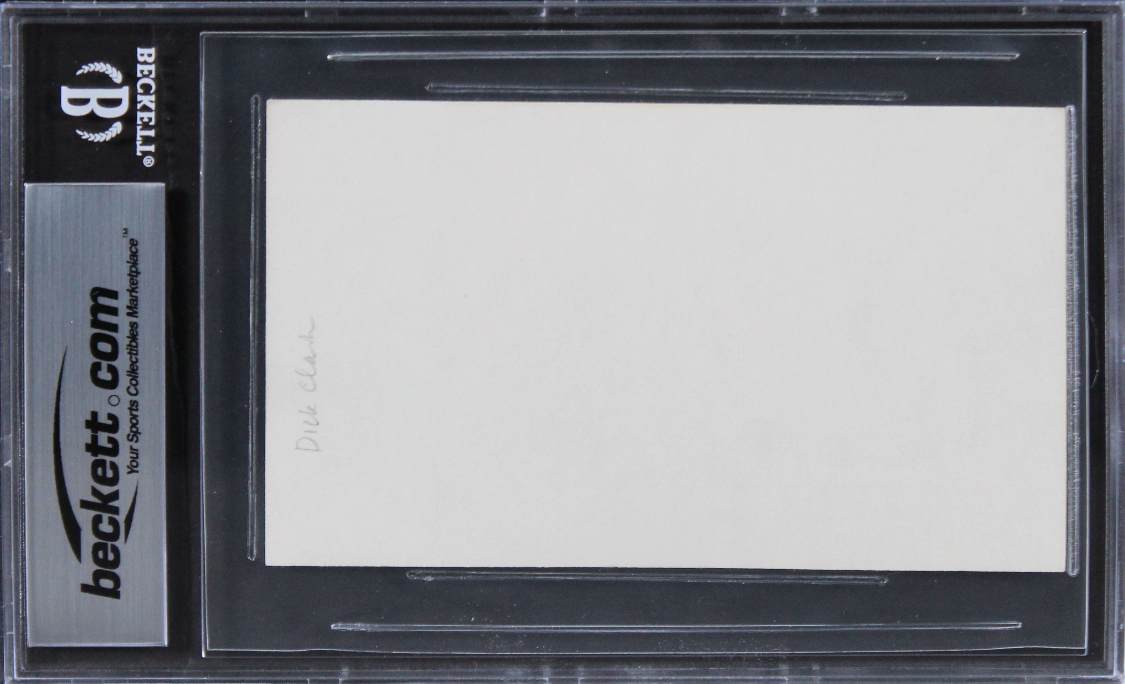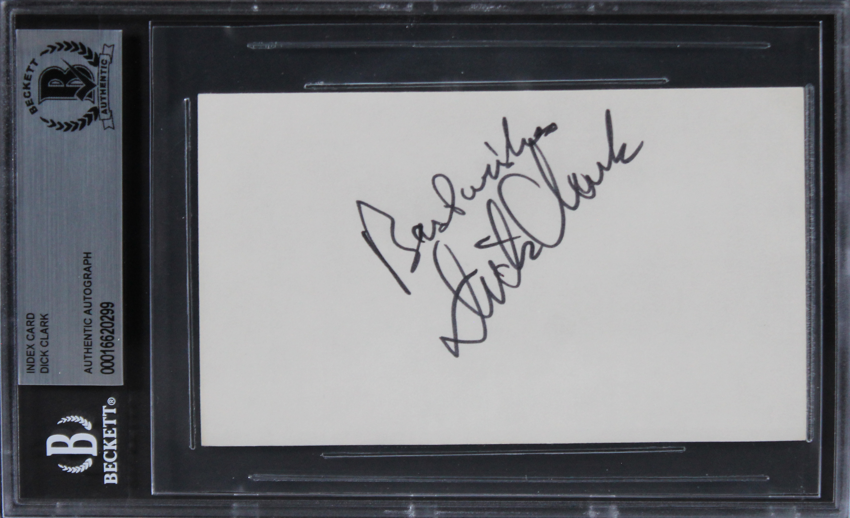 This Autographed 3x5 Index Card with the inscription of "Best Wishes" has been Personally Signed by Dick Clark of American Bandstand. This item is 100% Authentic, it comes slabbed and authenticated by Beckett Authentication Services. We have multiples of this same item. While the photographs are representative of this item, the size, placement and strength of the signature may vary. Each item is hand signed, therefore, each autograph is unique.