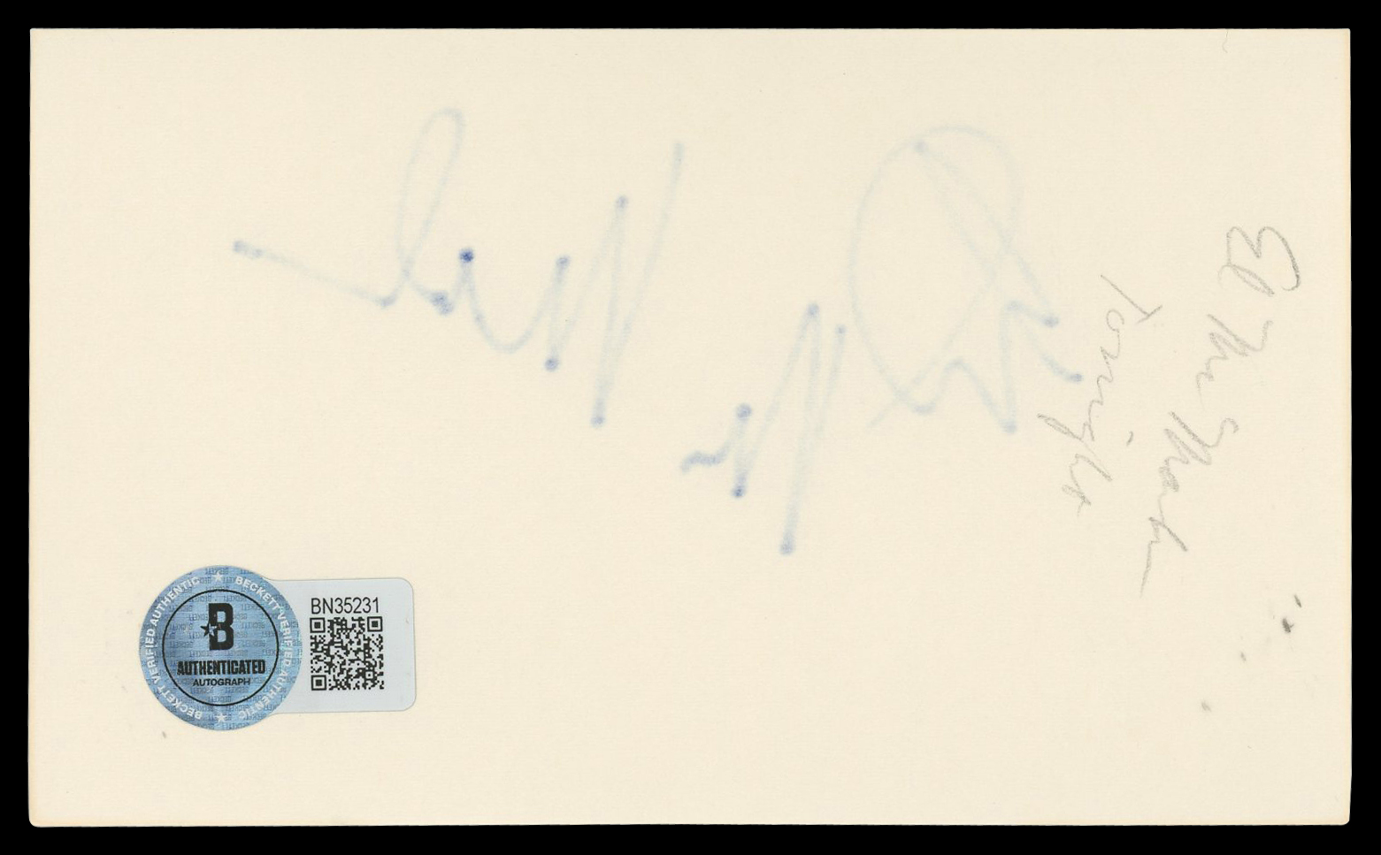 This Autographed 3x5 Index Card has been Personally Signed by Ed McMahon of The Tonight Show Starring Johnny Carson. This item is 100% Authentic to include a hologram by Beckett Authentication Services. This item will come with an affixed Beckett Authentication Services (BAS) authentication sticker, which includes a scannable QR code to verify authenticity. Please note that Beckett no longer provides serial-numbered COA cards, and the attached BAS sticker will serve as the complete authentication for this item. The authenticity can be verified on Beckett Authentication Services website.