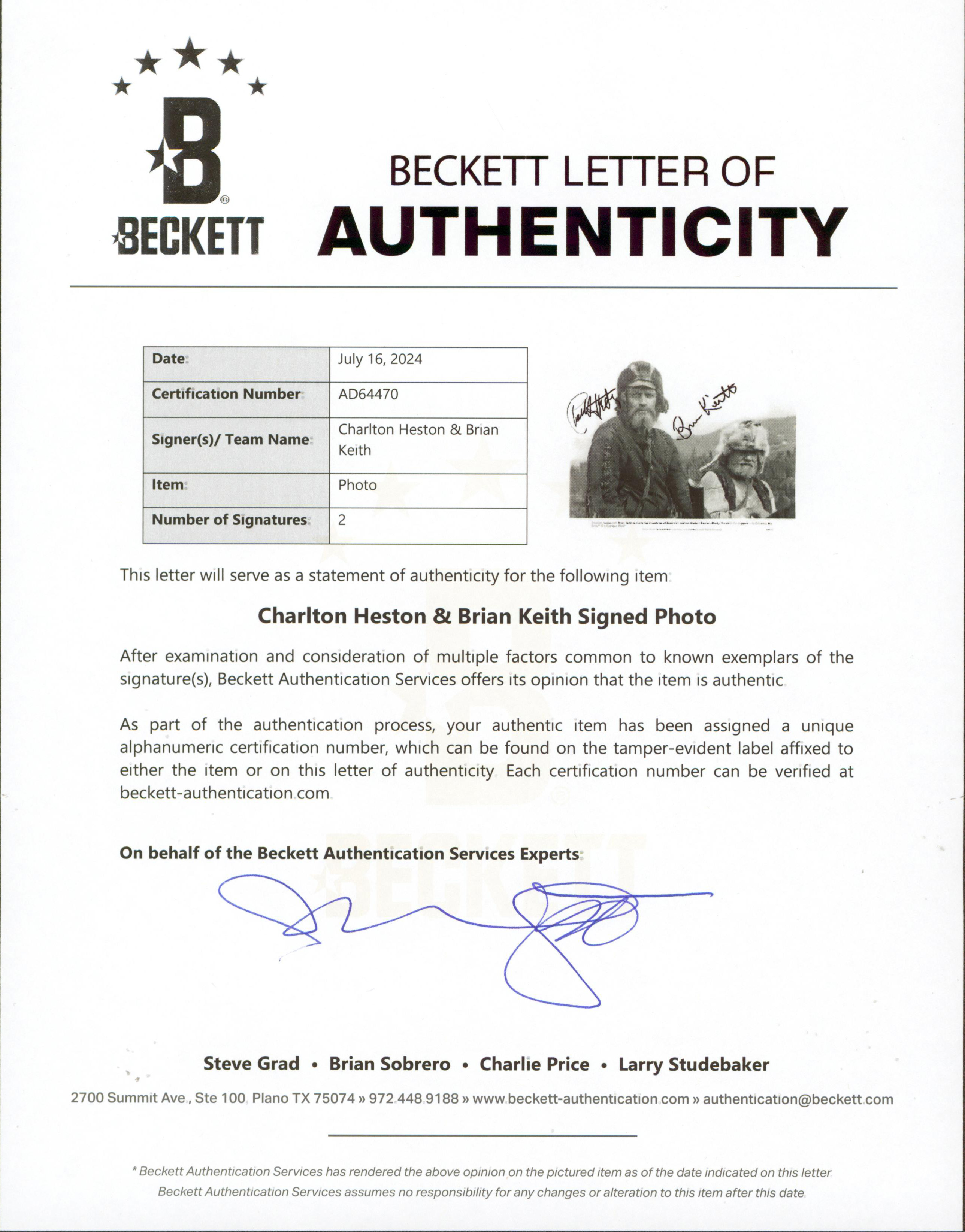 This Autographed 8x10 Photo has been Personally Signed by Charlton Heston & Brian Keith of The Mountain Men. This item is 100% Authentic to include a Certificate of Authenticity (COA) / hologram by Beckett Authentication Services. The authenticity can be verified on Beckett Authentication Services website.