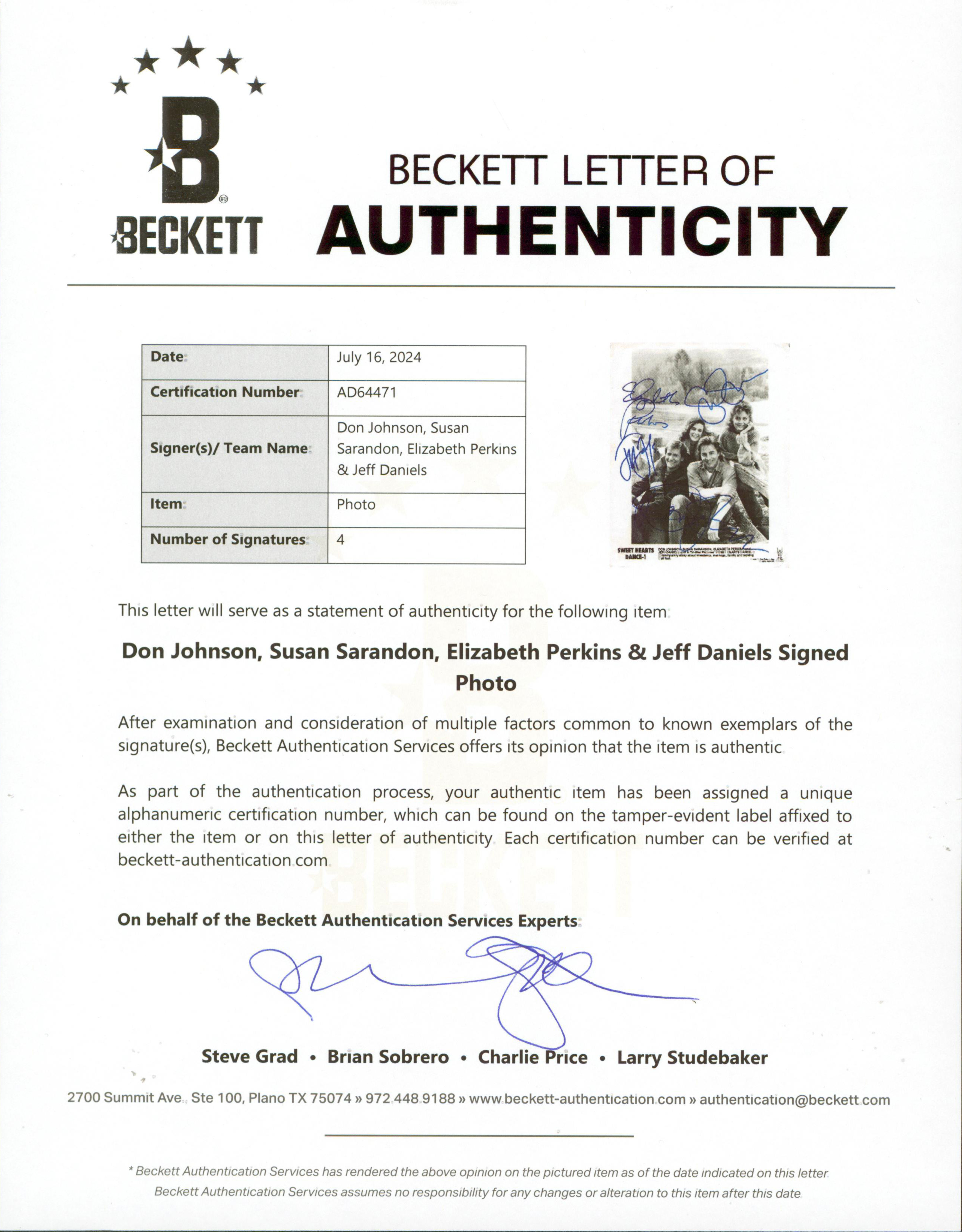This Autographed 8x10 Photo has been Personally Signed by Don Johnson, Susan Sarandon, Elizabeth Perkins & Jeff Daniels of Sweet Hearts Dance. This item is 100% Authentic to include a Certificate of Authenticity (COA) / hologram by Beckett Authentication Services. The authenticity can be verified on Beckett Authentication Services website.