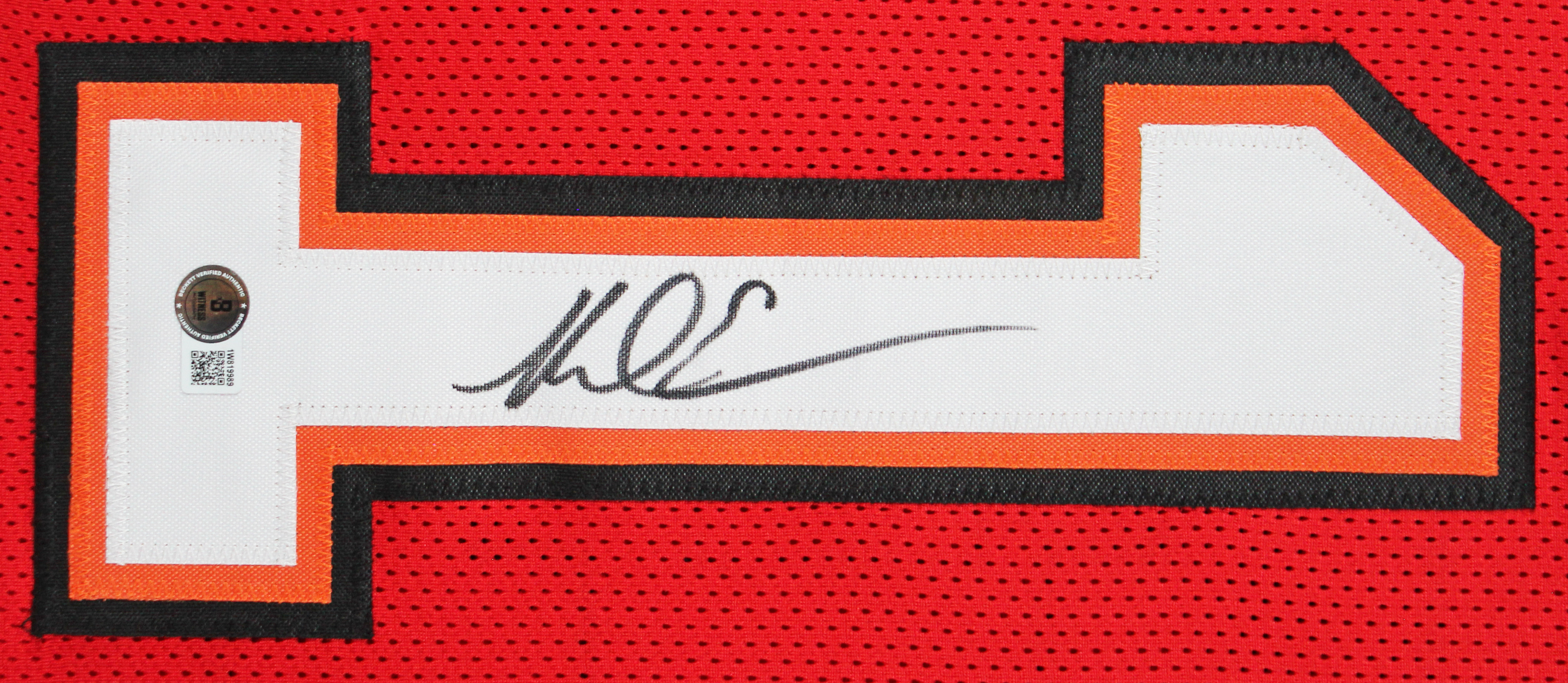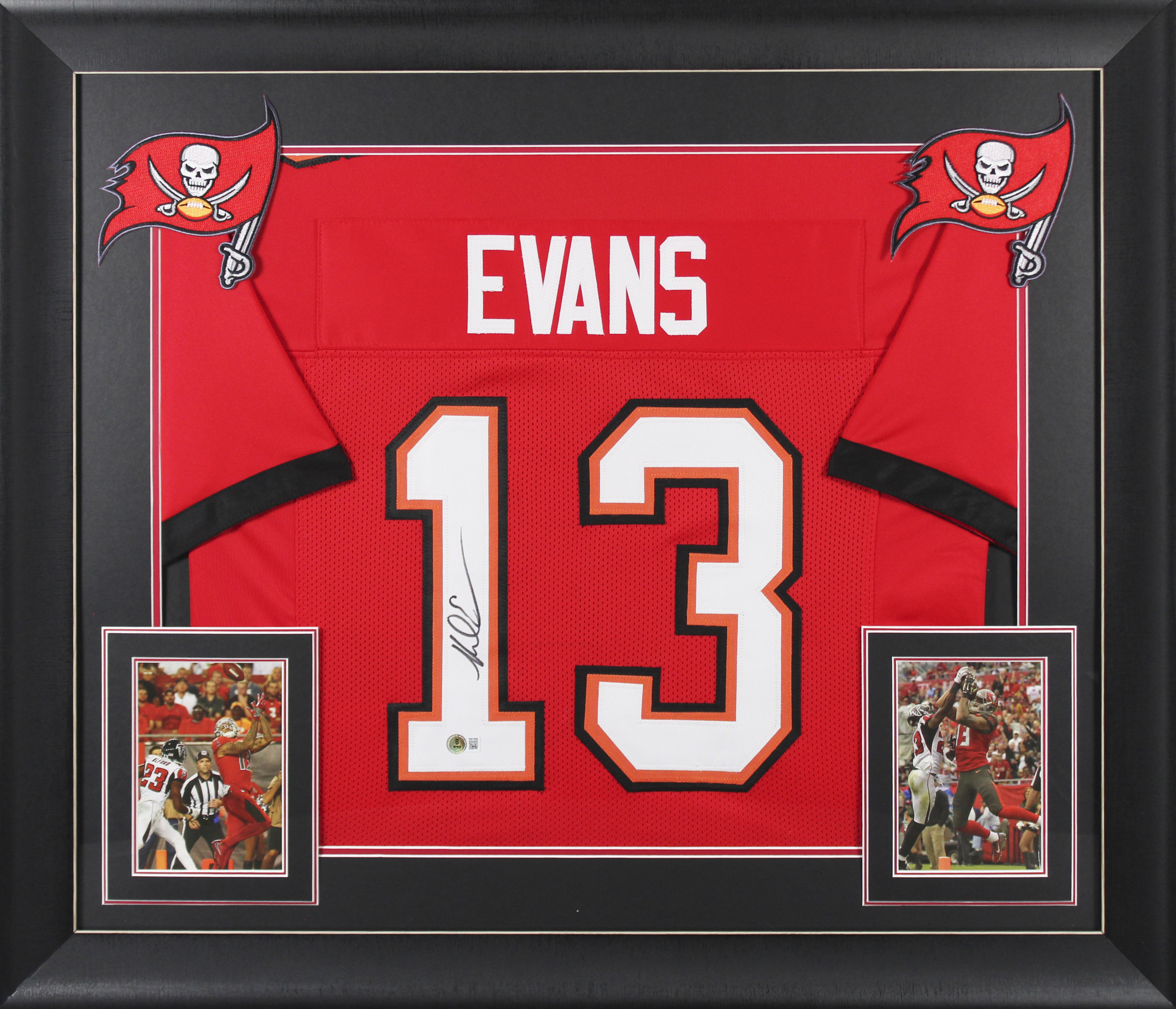 This Autographed Red Pro Style Framed Jersey has been Personally Signed by Mike Evans of the Tampa Bay Buccaneers. This item is 100% Authentic to include a hologram by Beckett Authentication Services. This item will come with an affixed Beckett Authentication Services (BAS) authentication sticker, which includes a scannable QR code to verify authenticity. Please note that Beckett no longer provides serial-numbered COA cards, and the attached BAS sticker will serve as the complete authentication for this item. This is a BAS Witnessed Protection Program item which means a Beckett Authentication Service representative was present when this item was being signed. We conducted an autograph signing with Mike Evans where multiples of the same item were signed. While the photographs are representative of this item, the size, placement and strength of the signature may vary. Each item is hand signed, therefore, each autograph is unique. This item can be verified through BAS Witnessed. This item has been professionally framed to overall dimensions of approximately 32 x 37 inches. This is a X-Large sized, non-branded, custom-stitched Framed Jersey. This jersey will be framed to order, it will take 3-4 days from purchase date for it to ship.