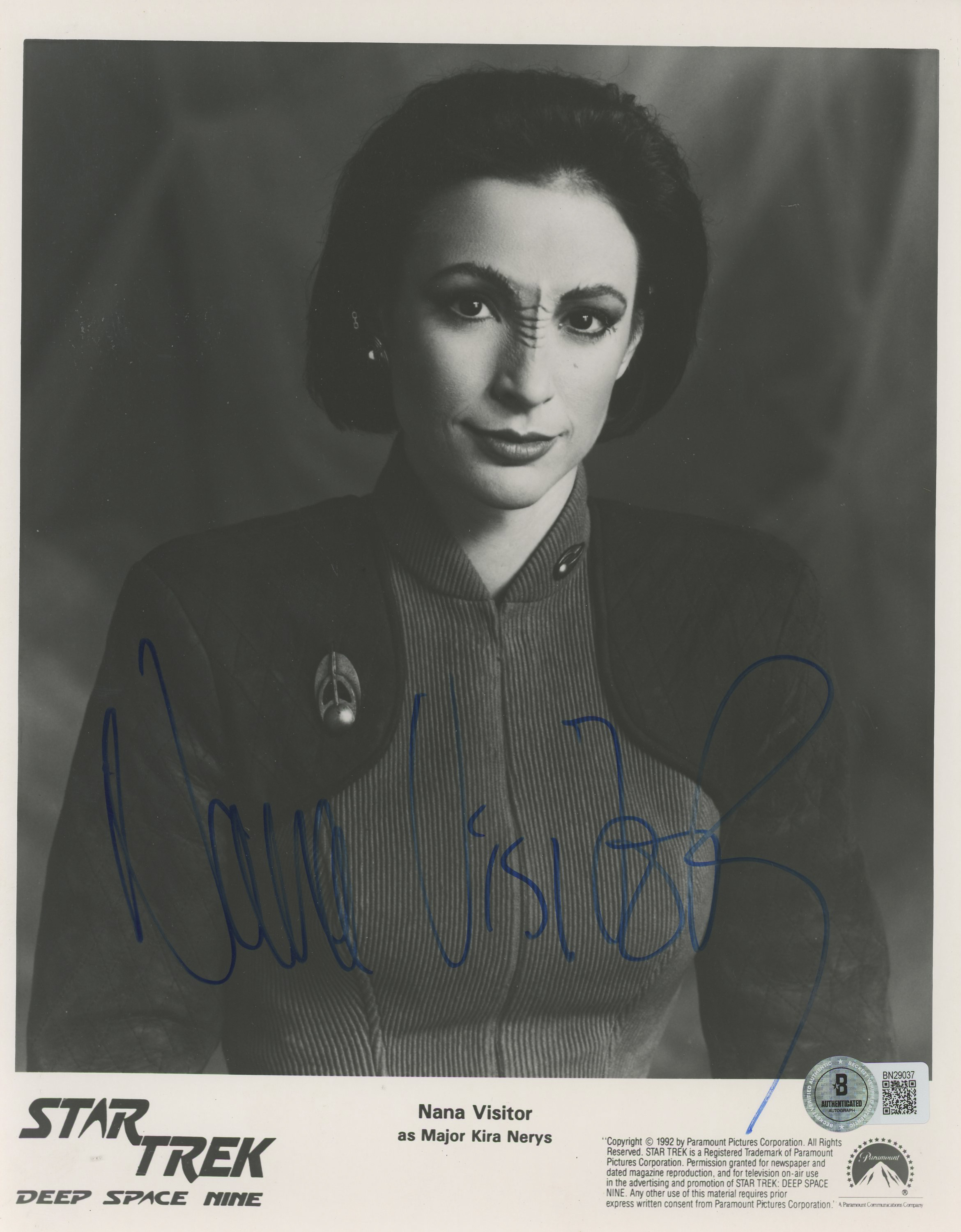 This Autographed 8x10 Photo has been Personally Signed by Nana Visitor of Star Trek: Deep Space Nine. This item is 100% Authentic to include a hologram by Beckett Authentication Services. This item will come with an affixed Beckett Authentication Services (BAS) authentication sticker, which includes a scannable QR code to verify authenticity. Please note that Beckett no longer provides serial-numbered COA cards, and the attached BAS sticker will serve as the complete authentication for this item. The authenticity can be verified on Beckett Authentication Services website.
