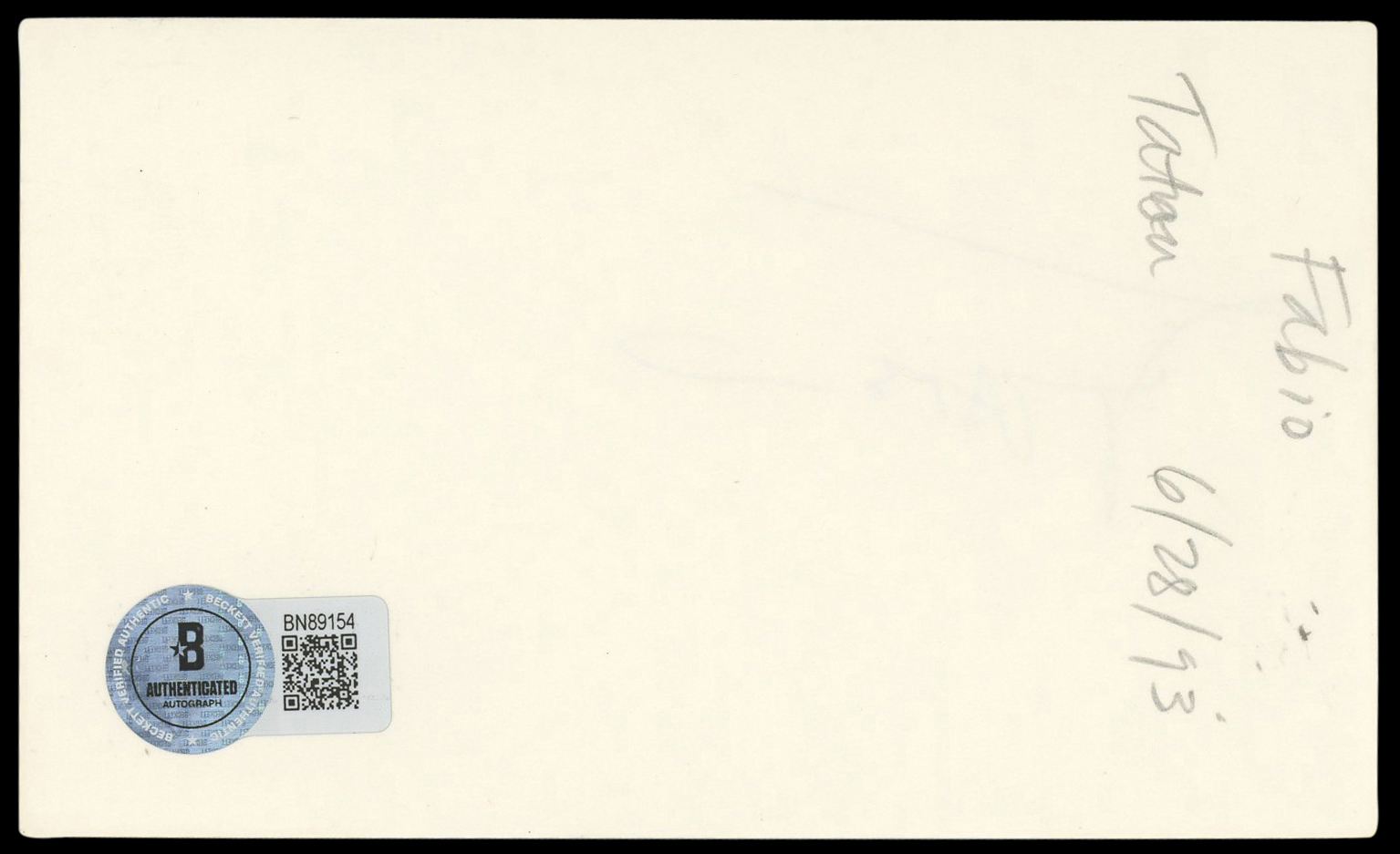 This Autographed 3x5 Index Card has been Personally Signed by Fabio Lanzoni of Bubble Boy. This item is 100% Authentic to include a hologram by Beckett Authentication Services. This item will come with an affixed Beckett Authentication Services (BAS) authentication sticker, which includes a scannable QR code to verify authenticity. Please note that Beckett no longer provides serial-numbered COA cards, and the attached BAS sticker will serve as the complete authentication for this item. The authenticity can be verified on Beckett Authentication Services website.